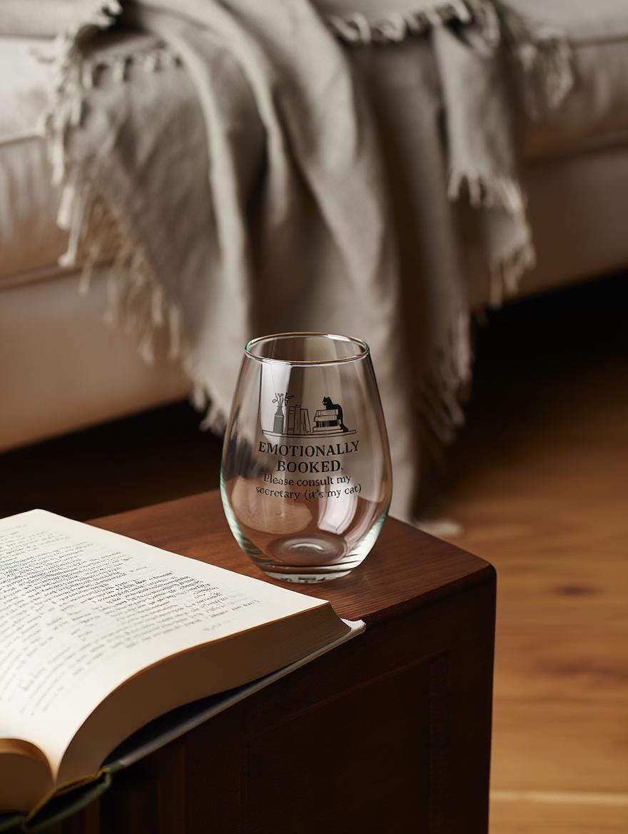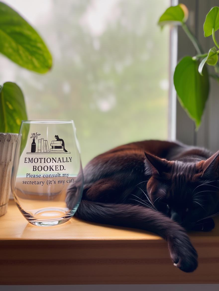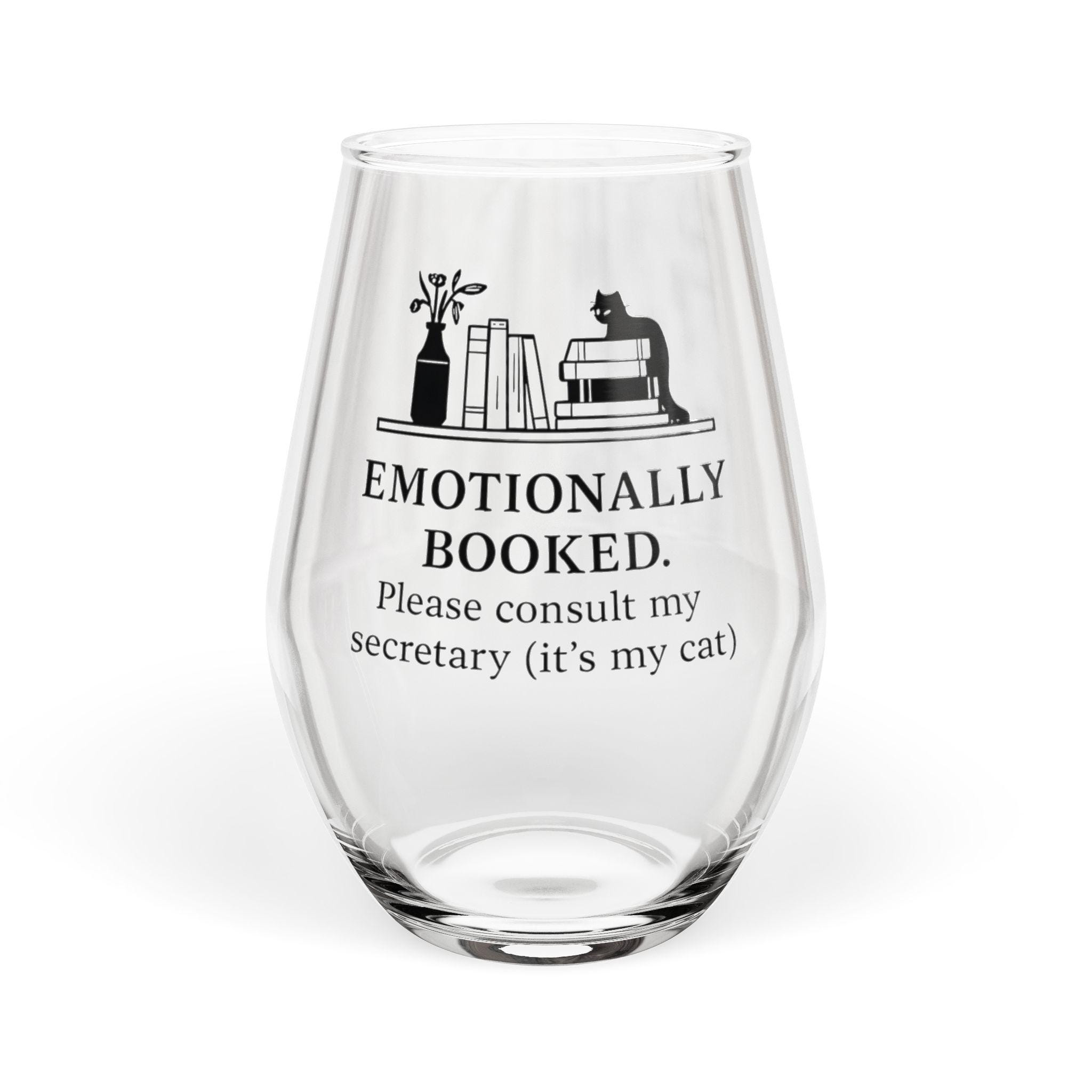 Emotionally Booked Wine Glass · Cat Humor Glass · Introvert Gift · Book Lover Snarky Stemless Wine Glass