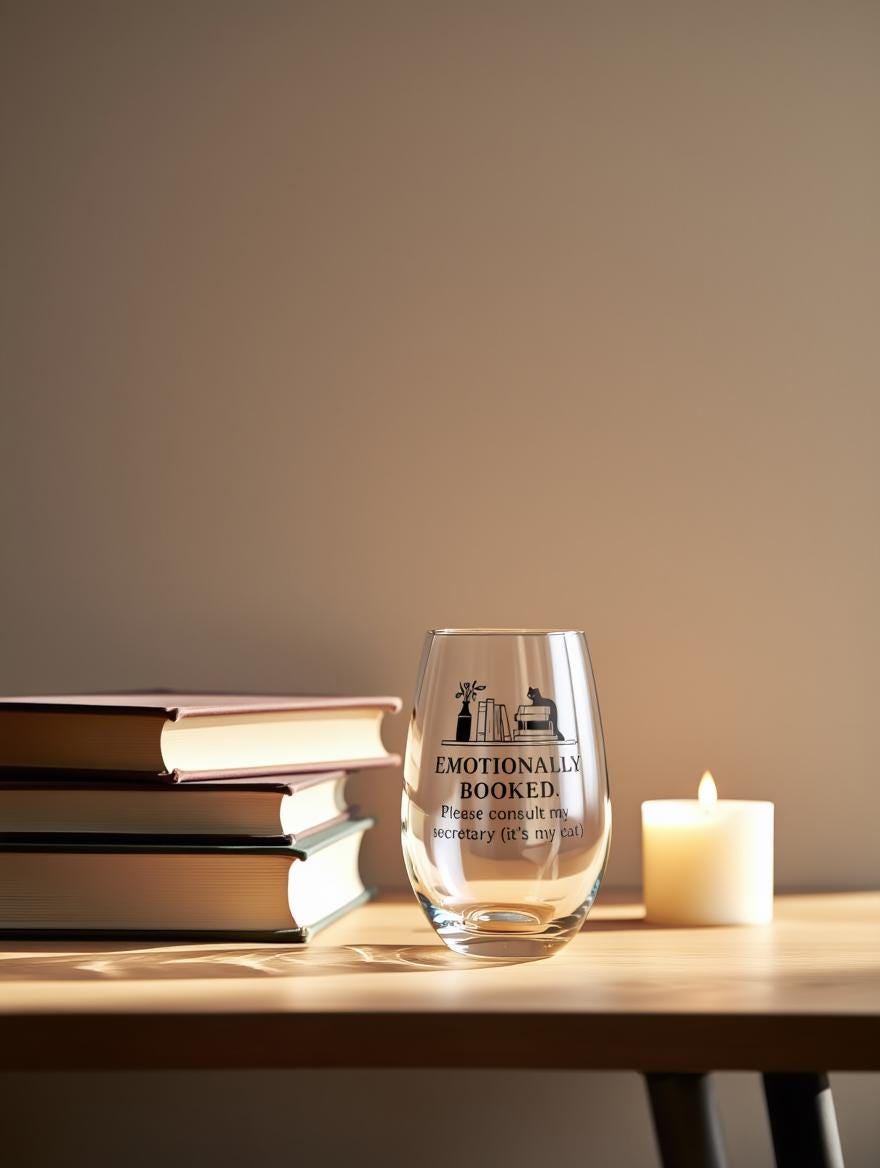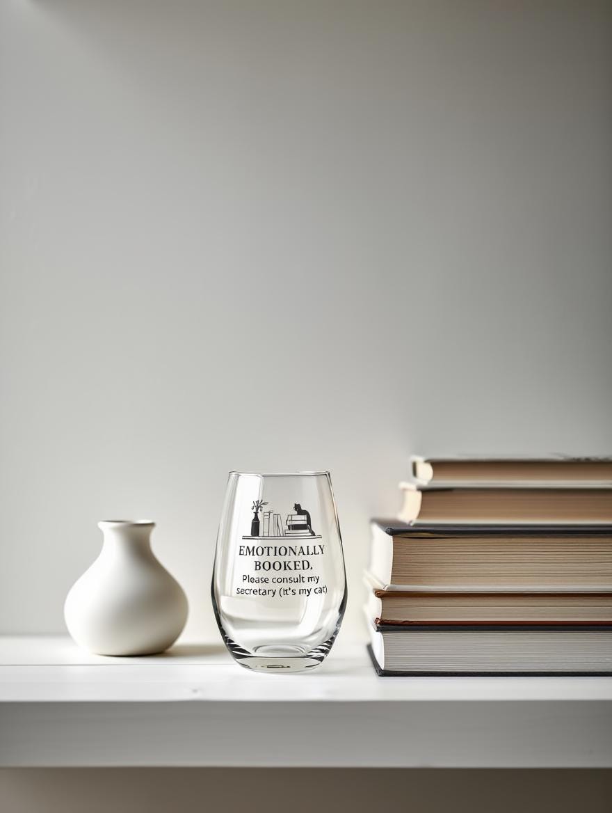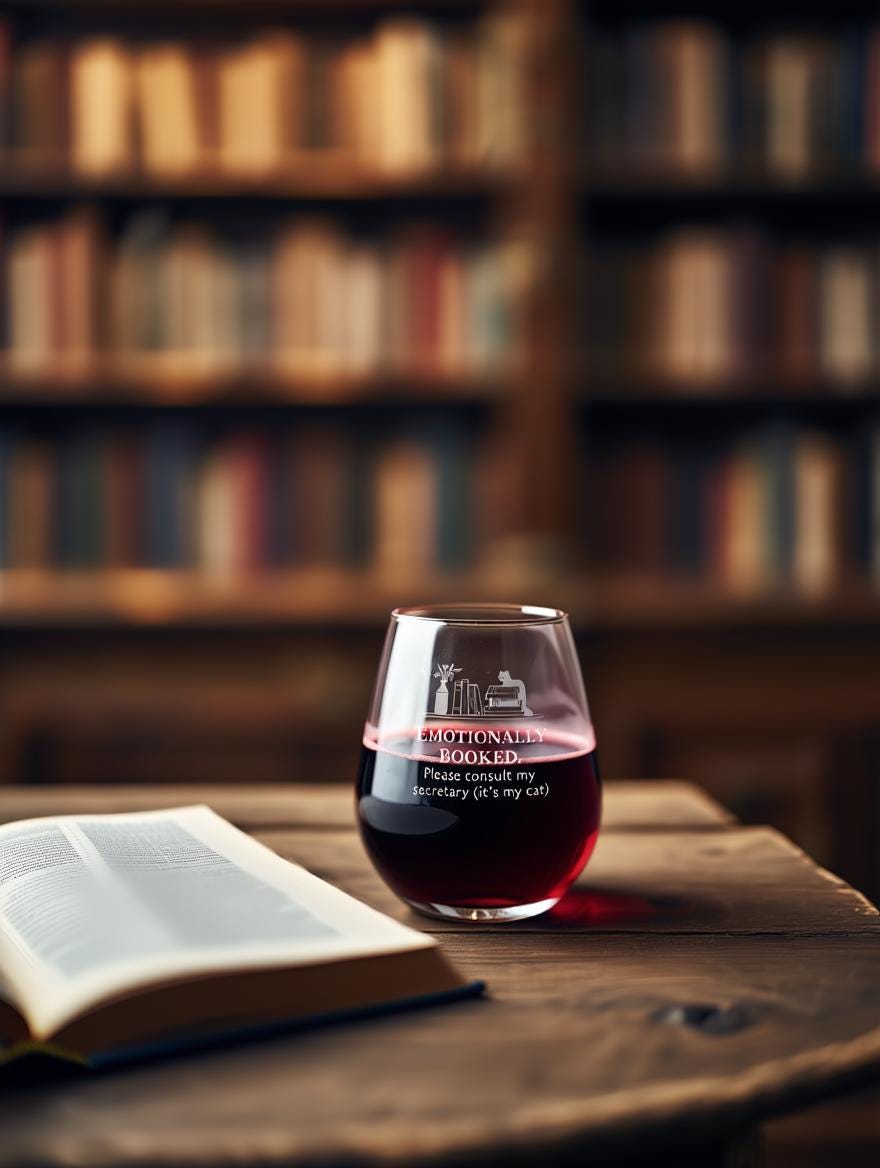 Emotionally Booked Wine Glass · Cat Humor Glass · Introvert Gift · Book Lover Snarky Stemless Wine Glass