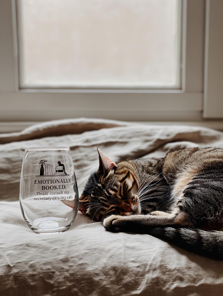 This stemless wine glass delivers the perfect mix of sarcasm, solitude, and “please don’t talk to me unless you’re a cat.”