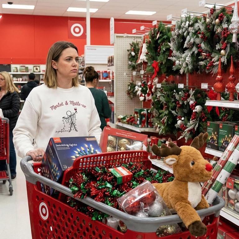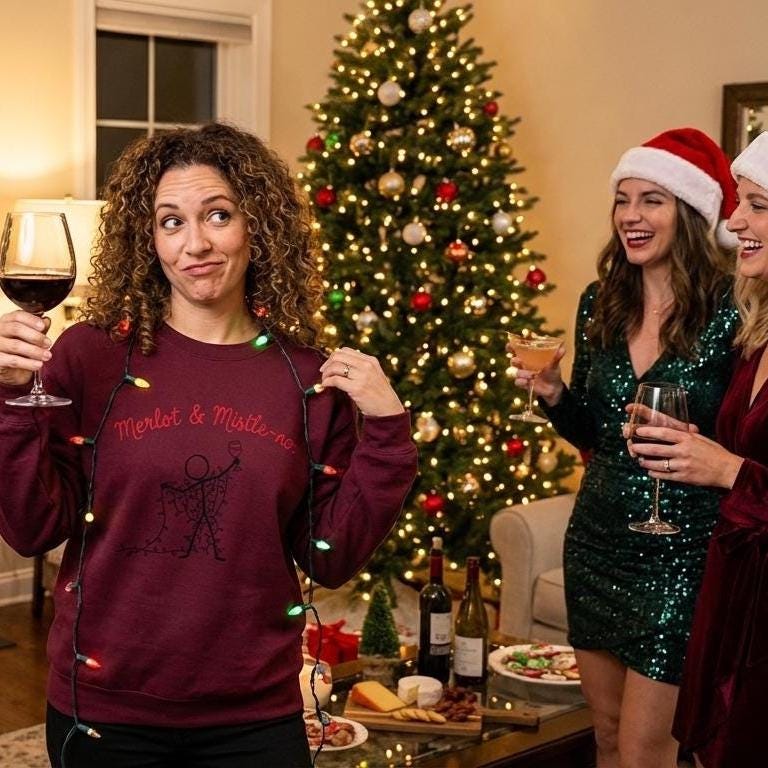 Introducing the “Merlot & Mistle-No” sweatshirt — your official uniform for surviving holiday parties, dodging mistletoe, and managing extended family with the grace of a woman who knows her limits.