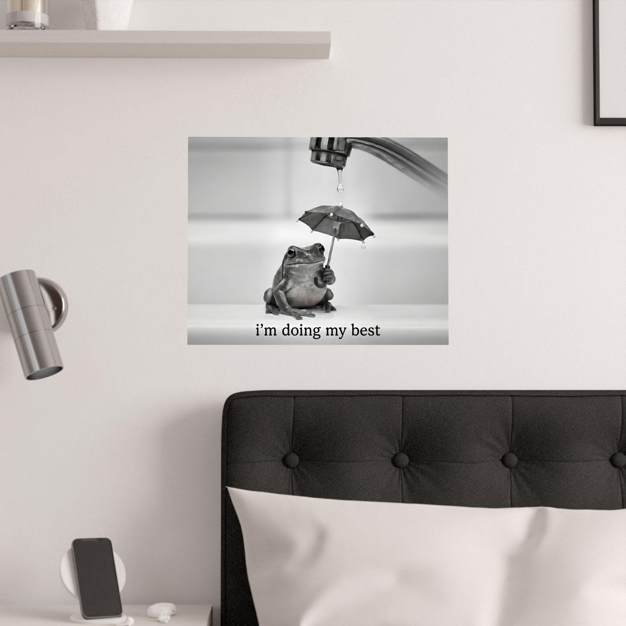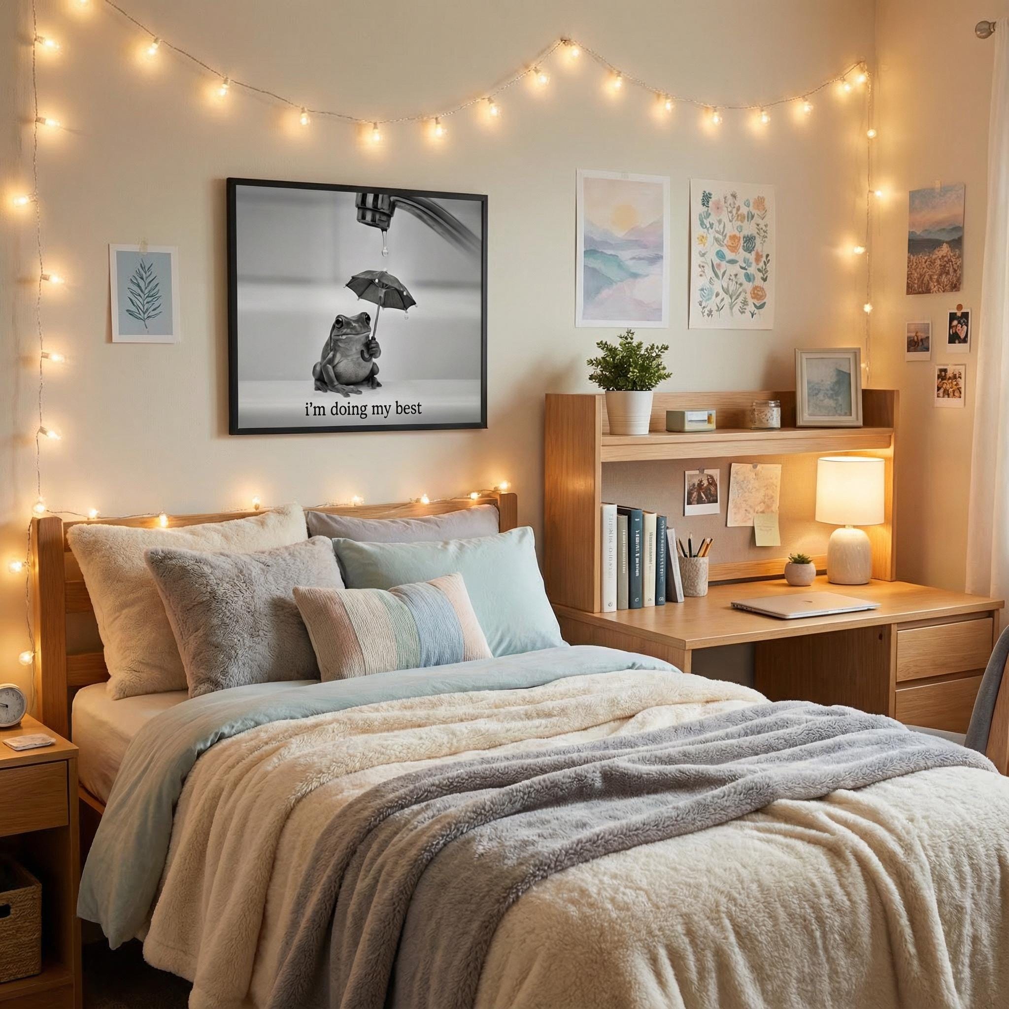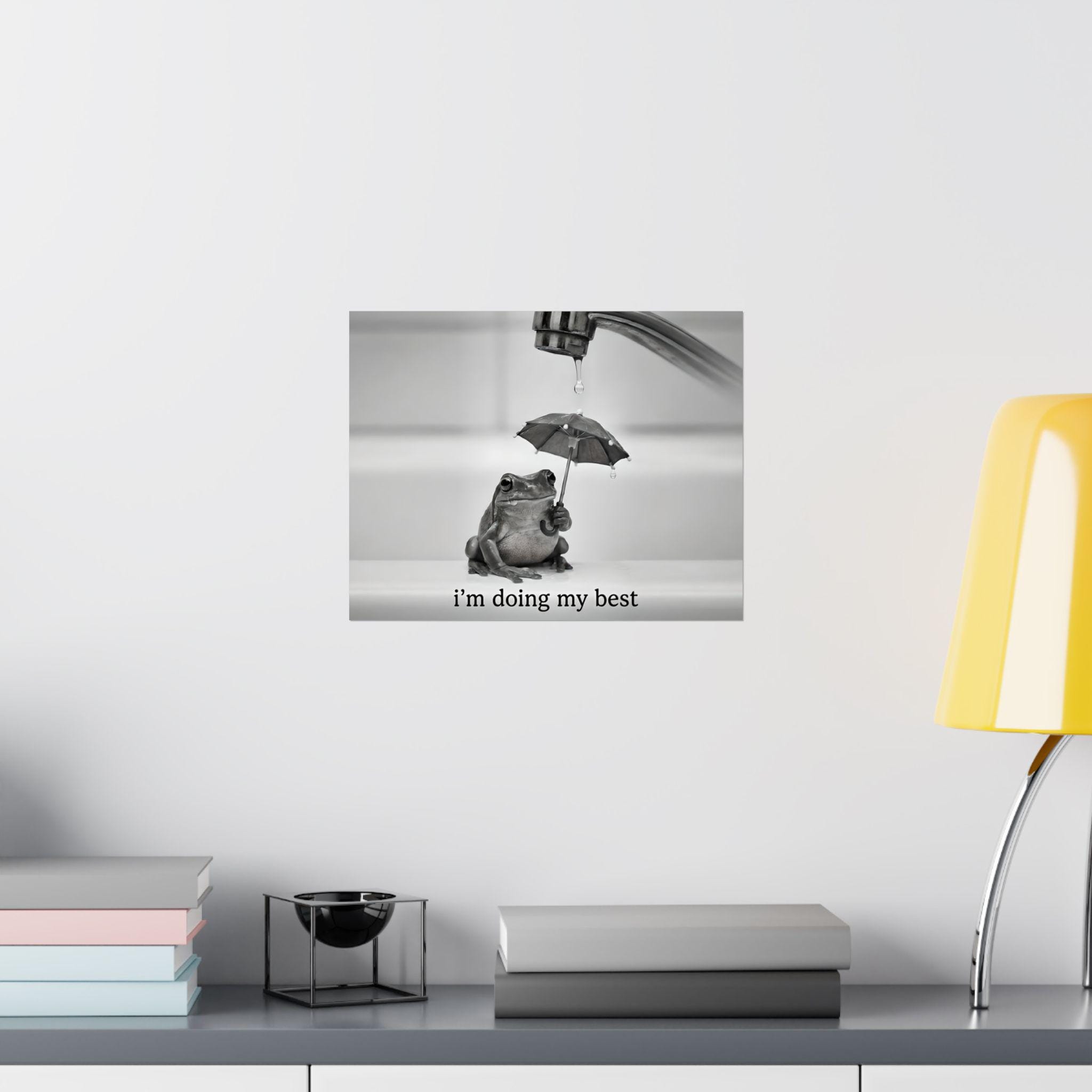 This minimalist, cute frog art canvascaptures the feeling of trying—quietly, imperfectly, and anyway. A small frog holds an umbrella beneath a dripping faucet, paired with a simple reminder: