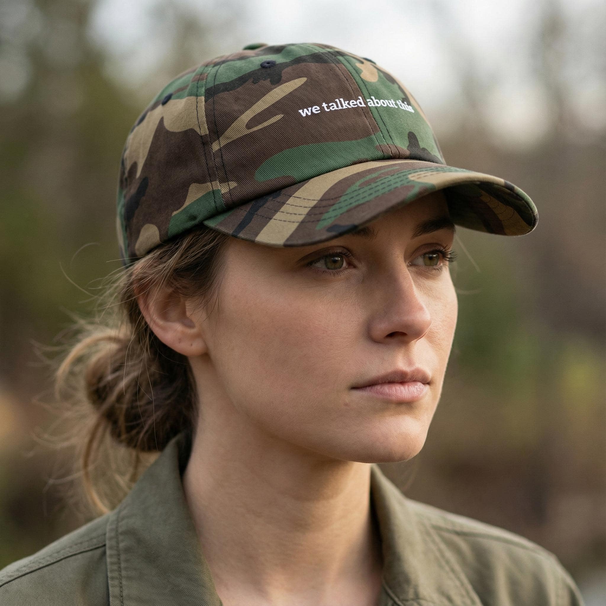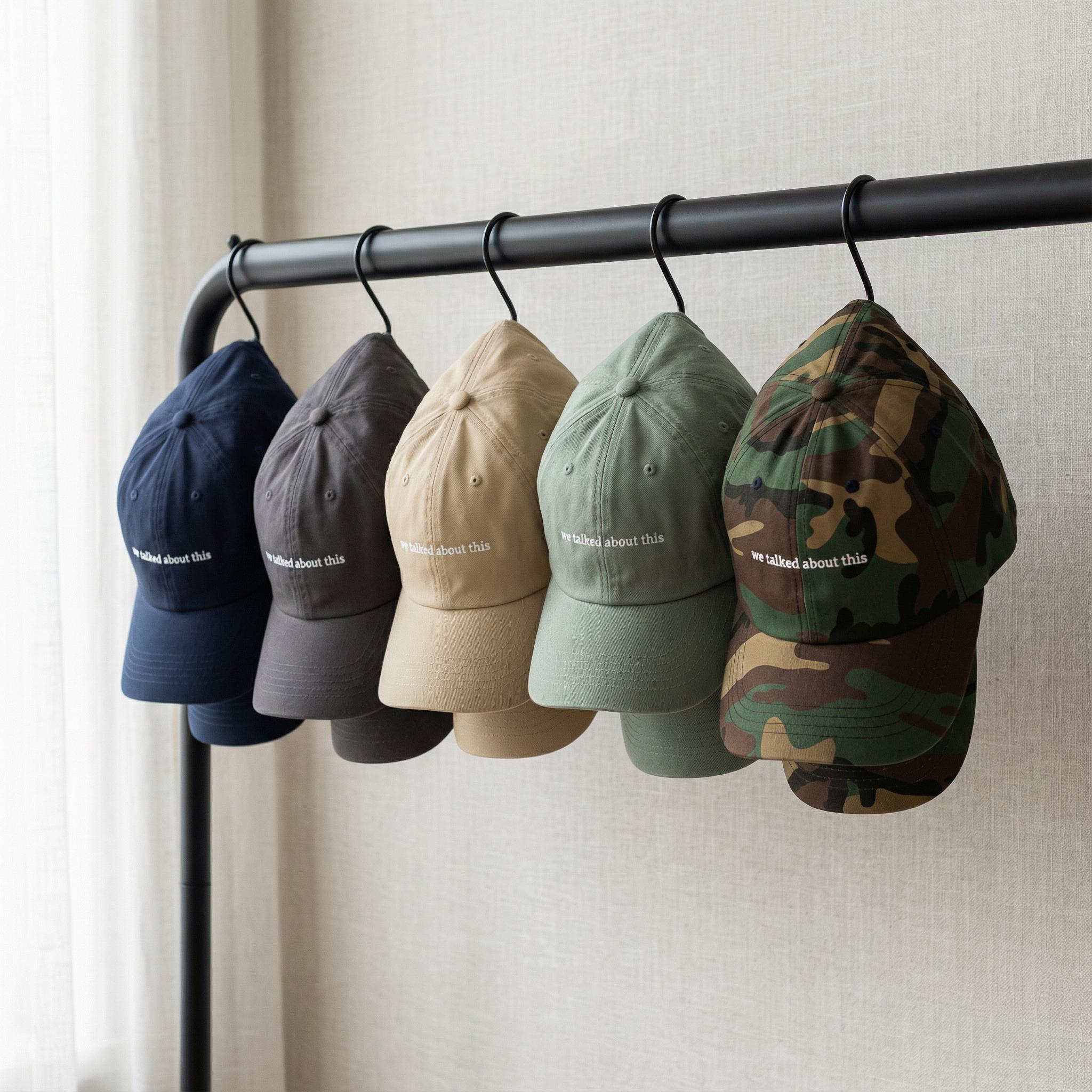 This minimalist embroidered dad hat features the phrase “we talked about this” — simple, direct, and familiar in a way that makes people look twice.