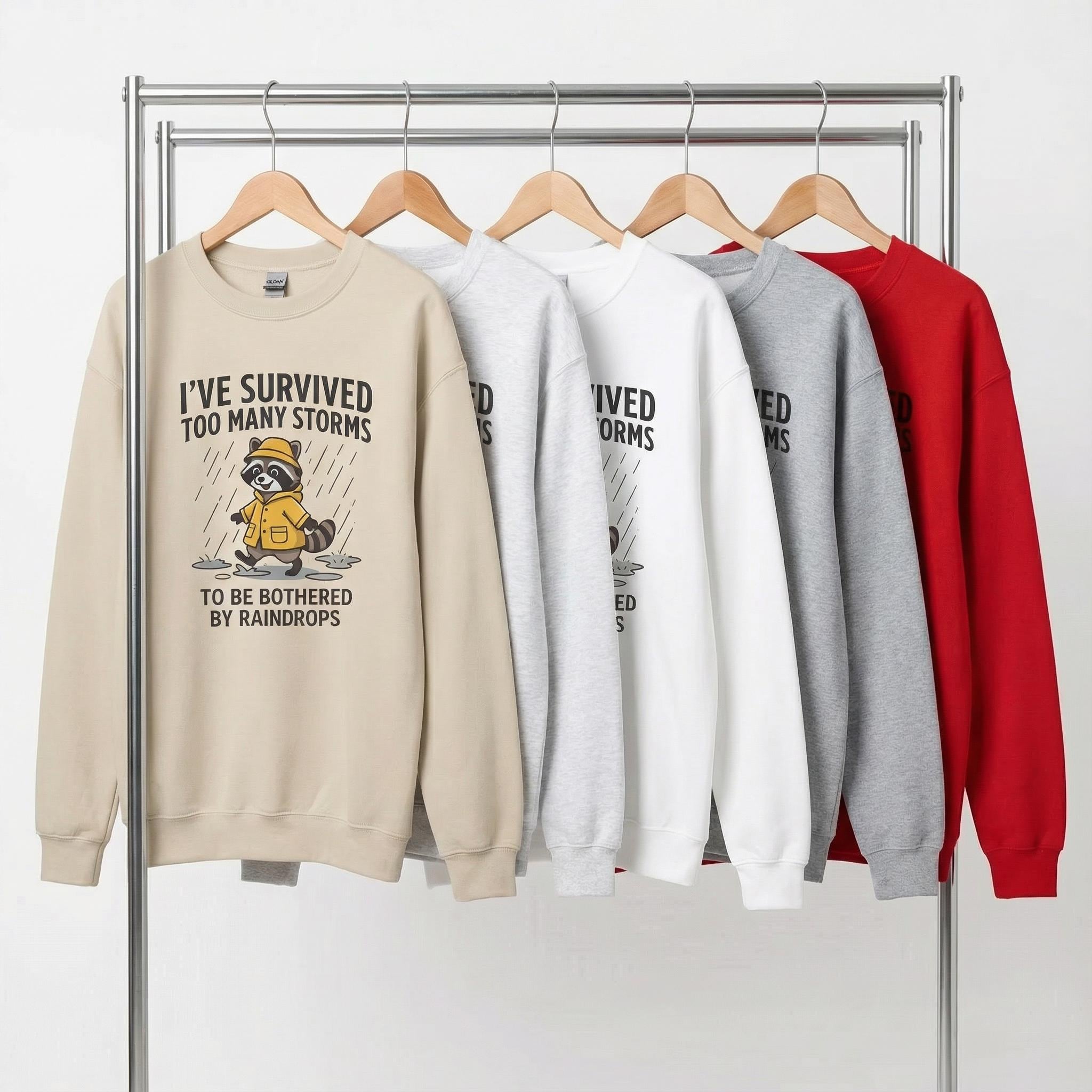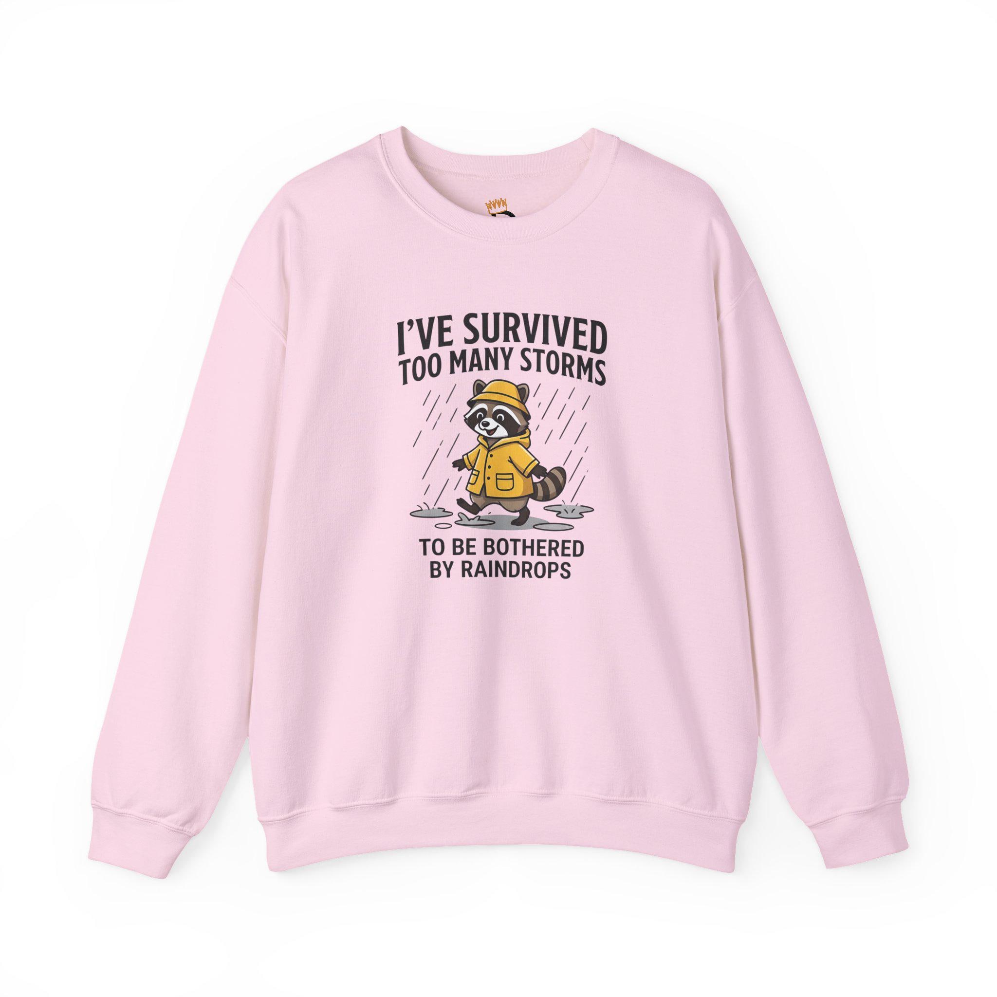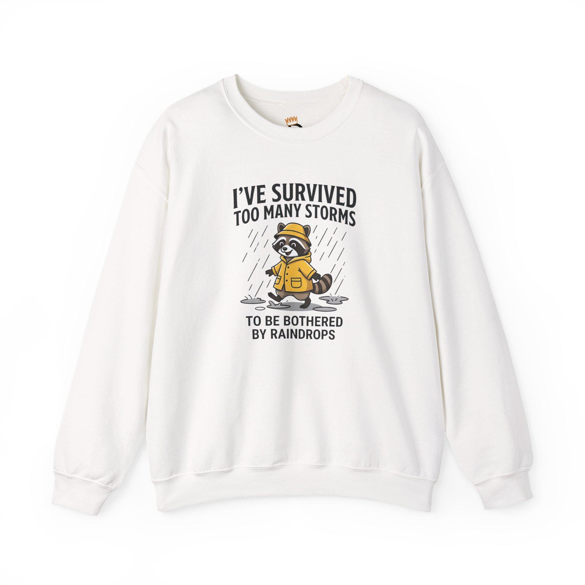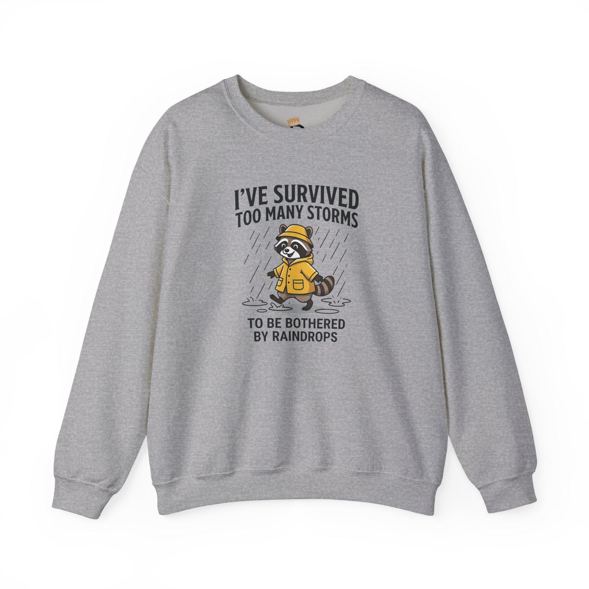 Funny Raccoon Sweatshirt | I’ve Survived Too Many Storms Crewneck | Cozy Motivational Quote Pullover | Gildan 18000 Unisex