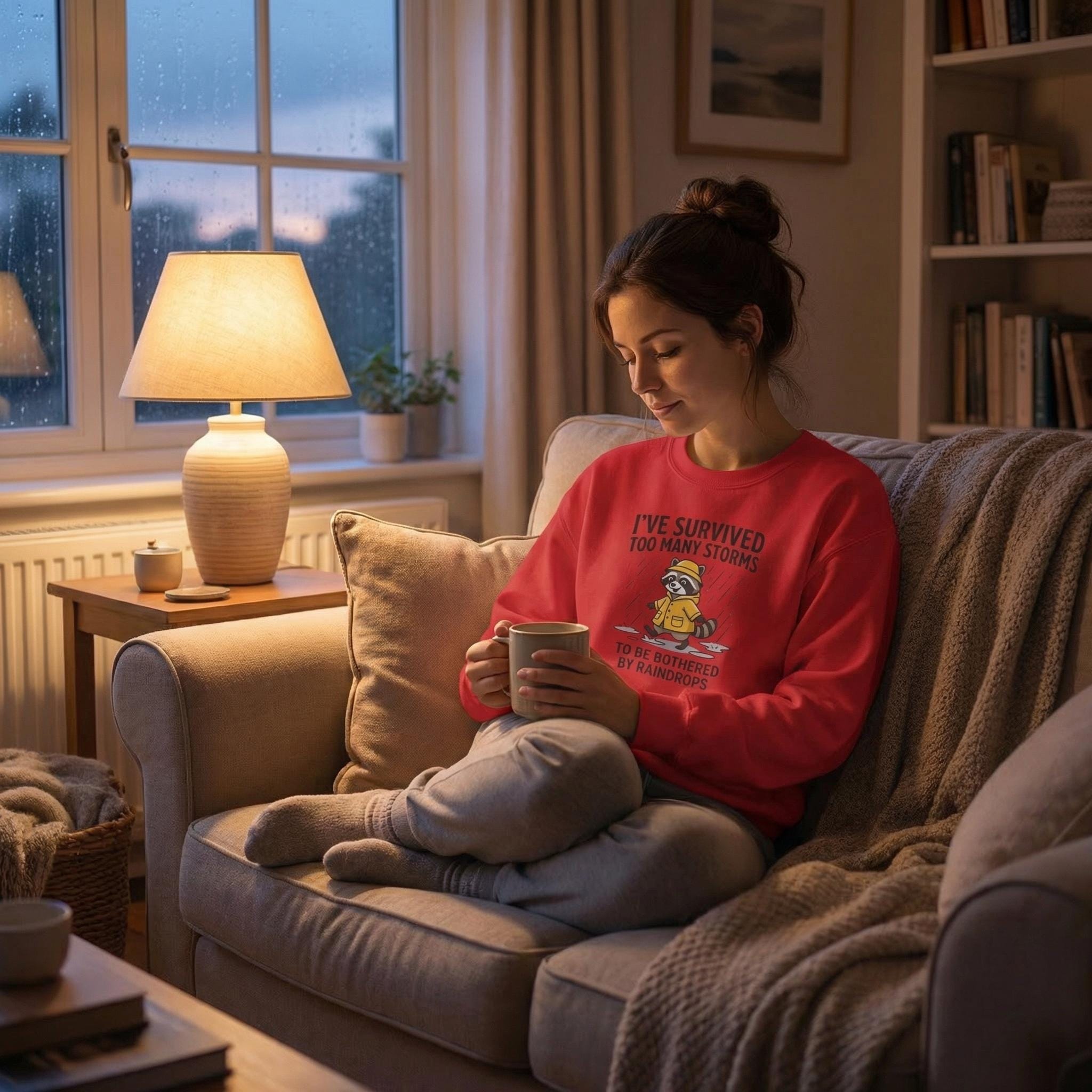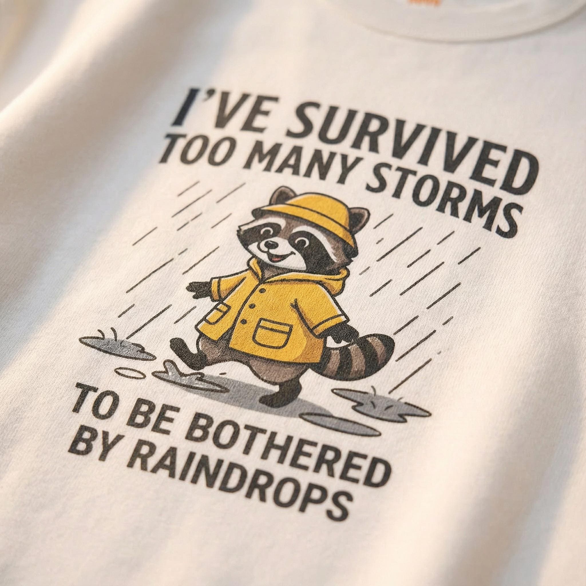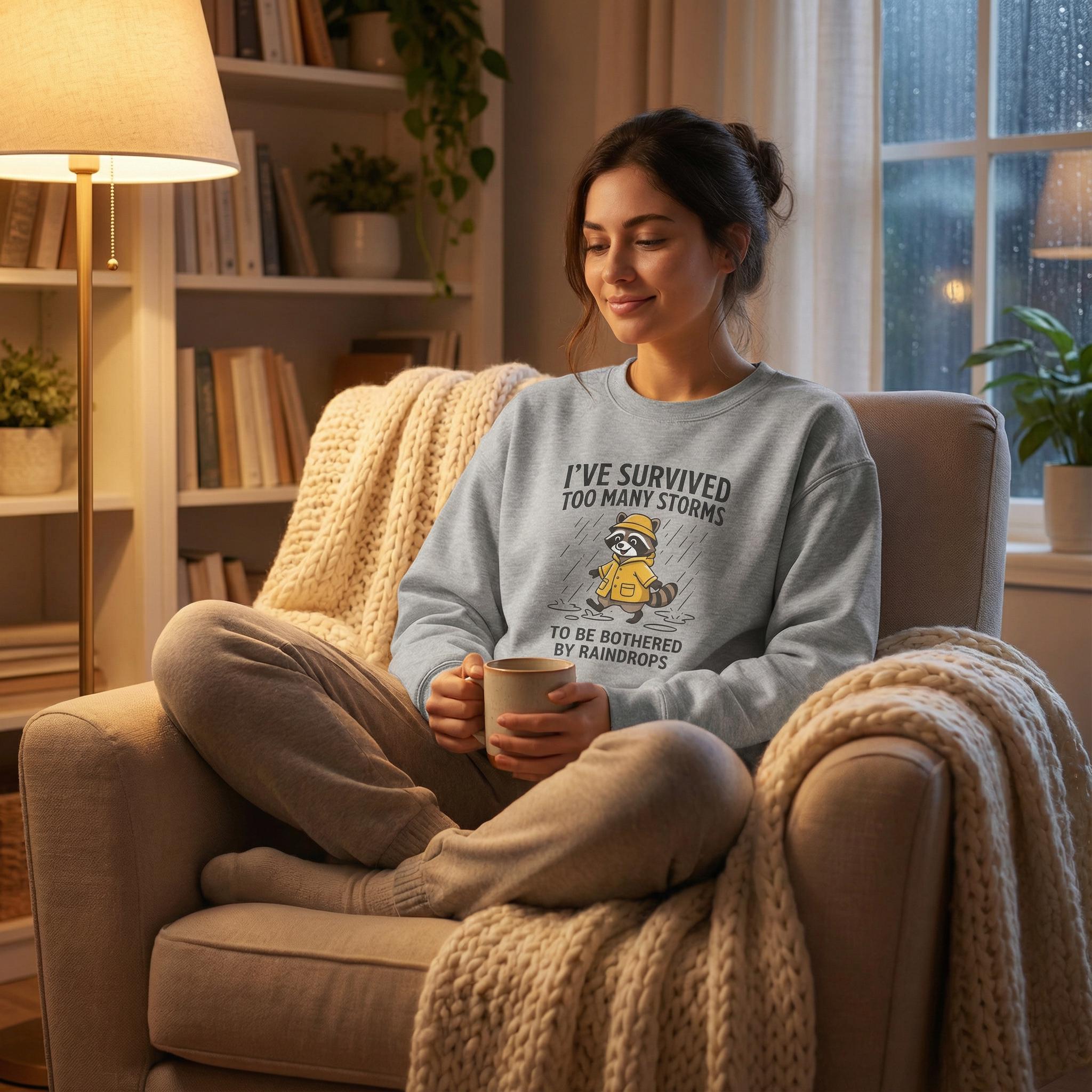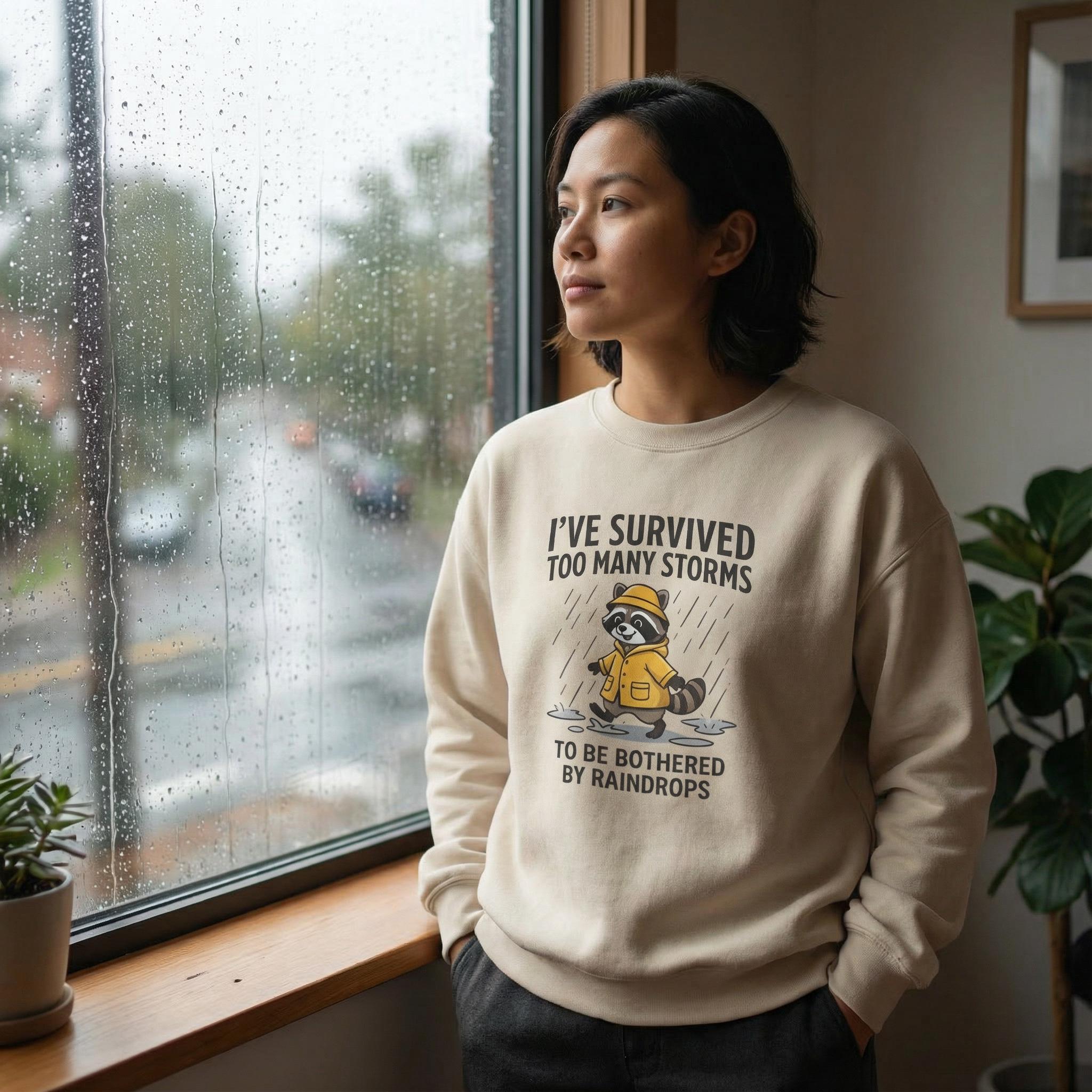 Funny Raccoon Sweatshirt | I’ve Survived Too Many Storms Crewneck | Cozy Motivational Quote Pullover | Gildan 18000 Unisex