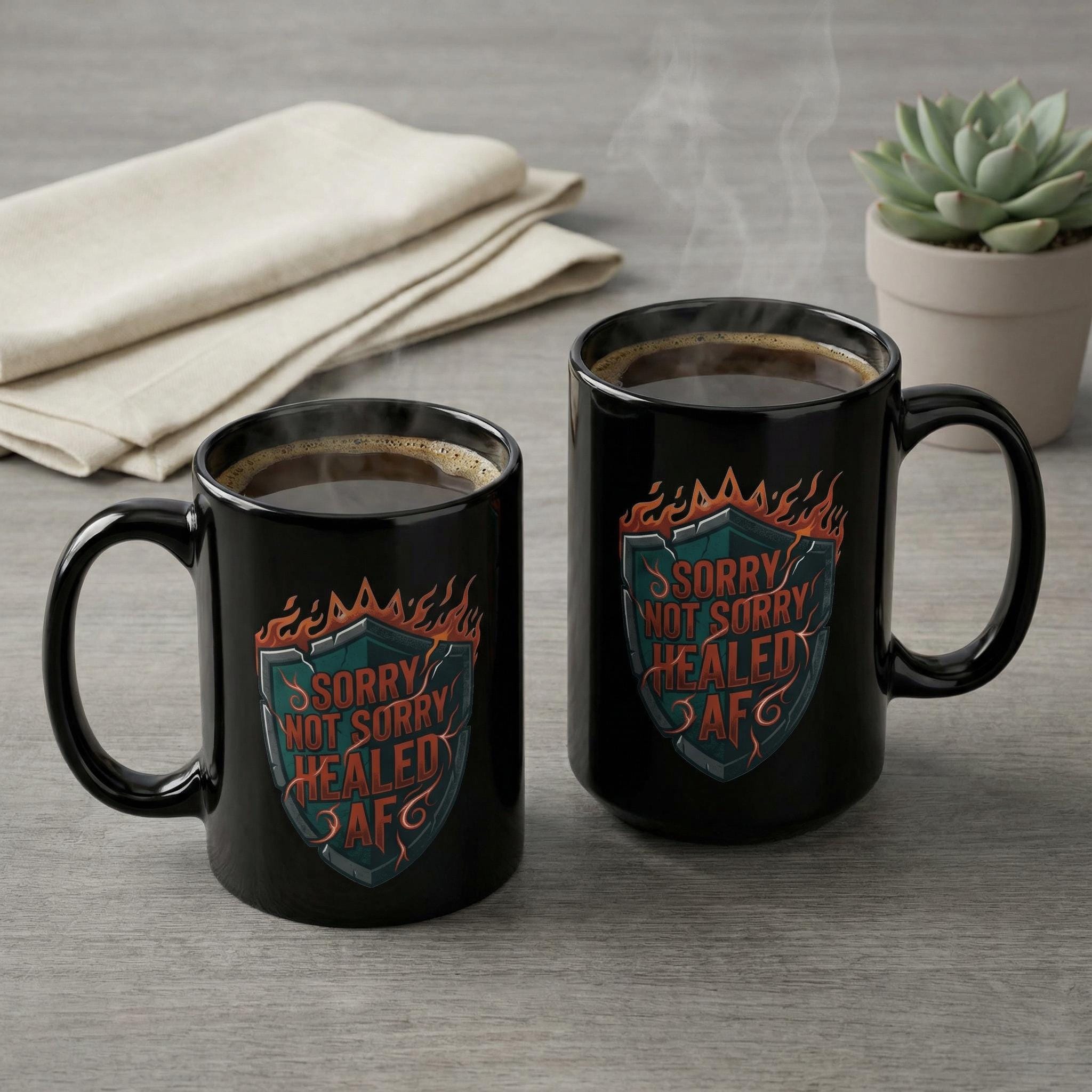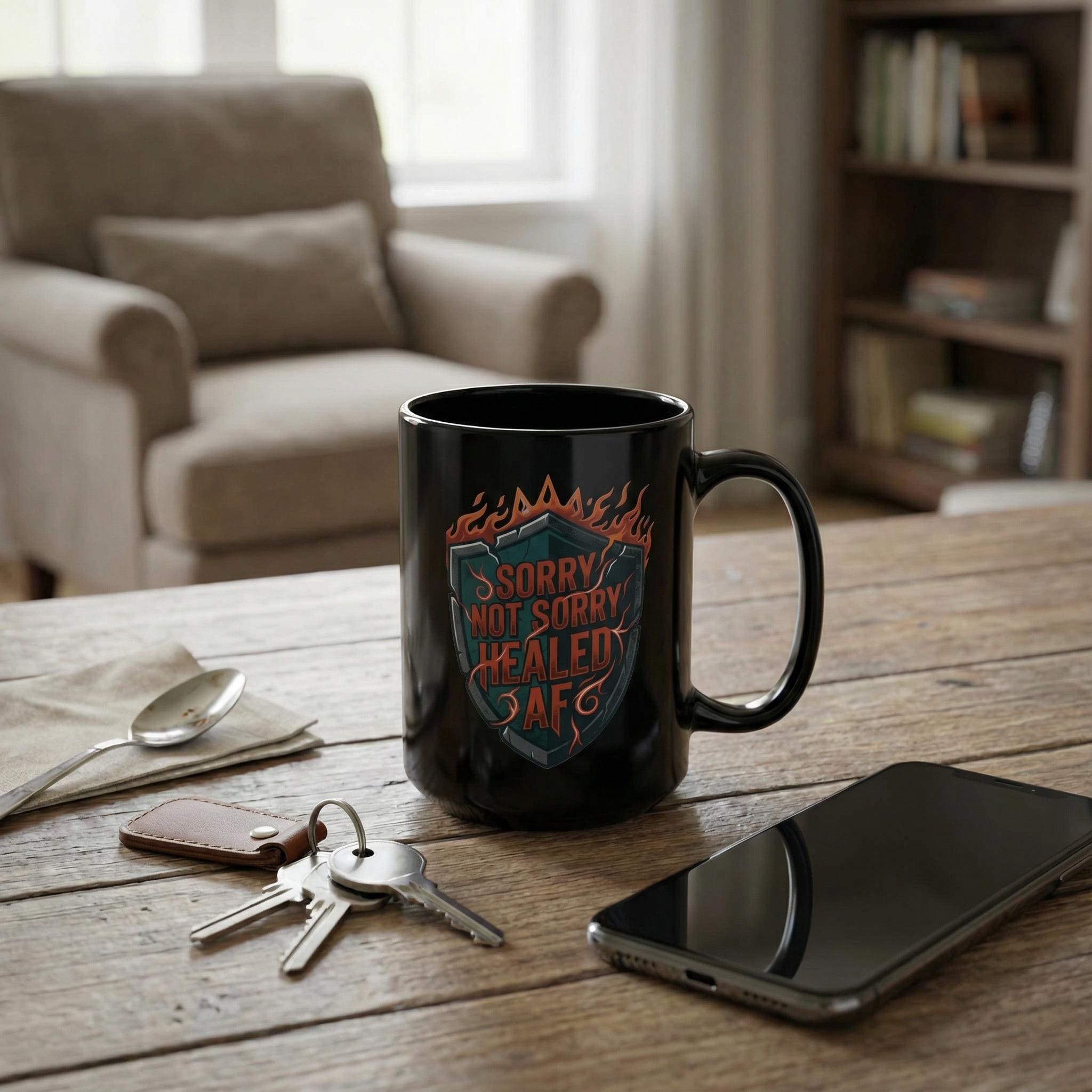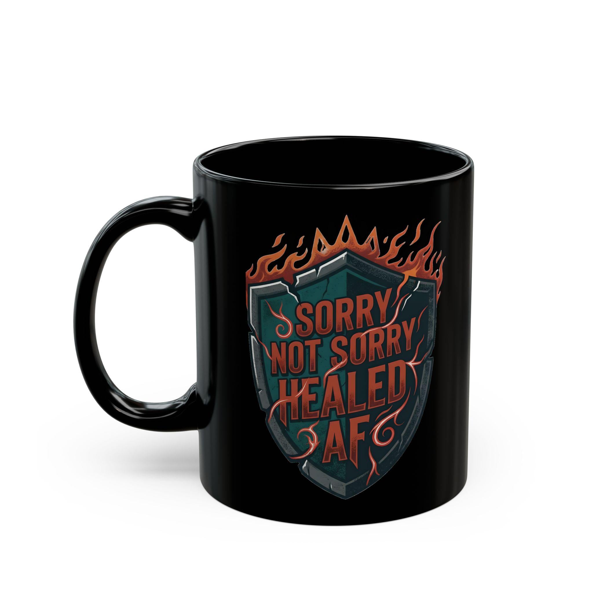 The “Sorry Not Sorry Healed AF” mug is for anyone who’s done the work, learned the lesson, and no longer explains their boundaries. Bold shield artwork and fiery details meet unapologetic humor—because growth doesn’t cancel personality.