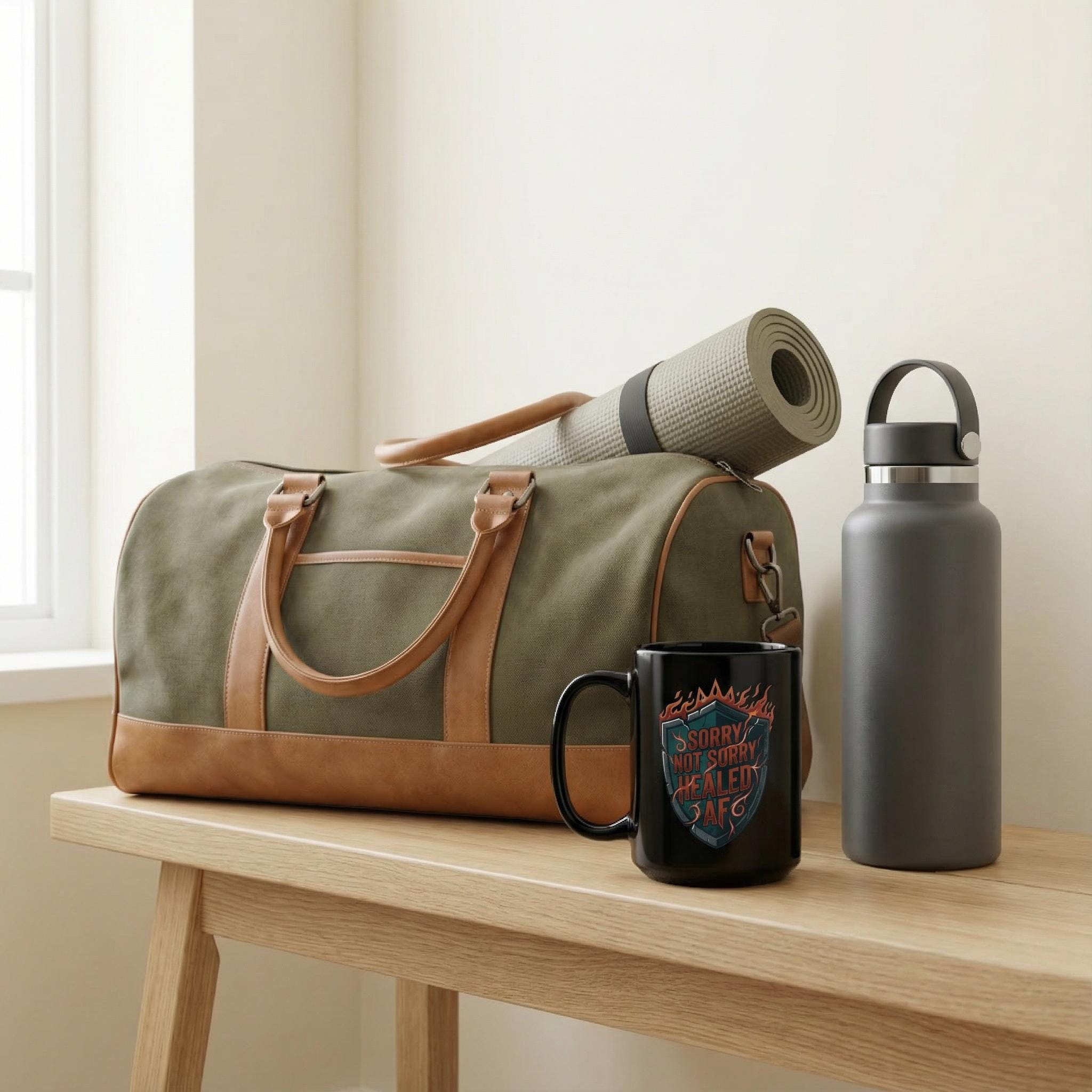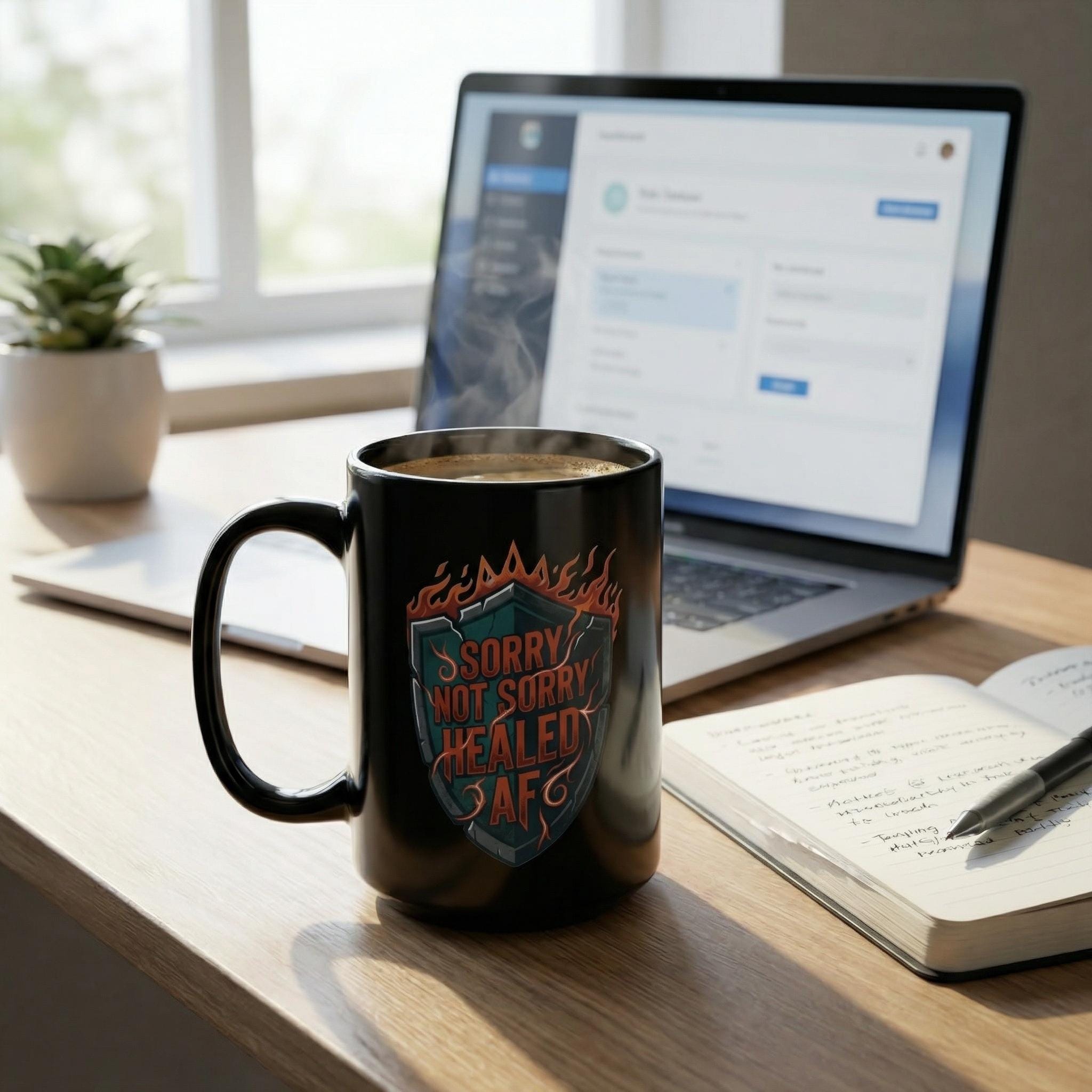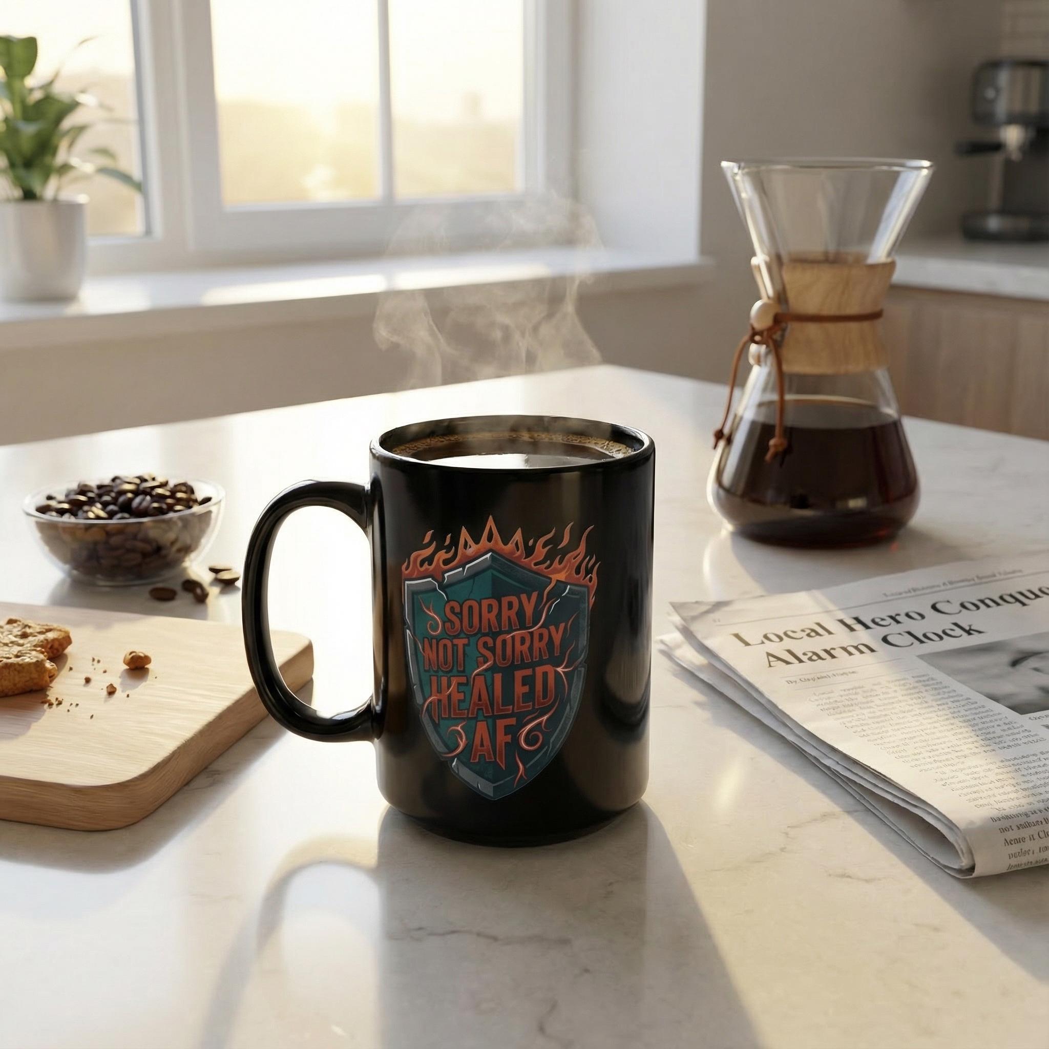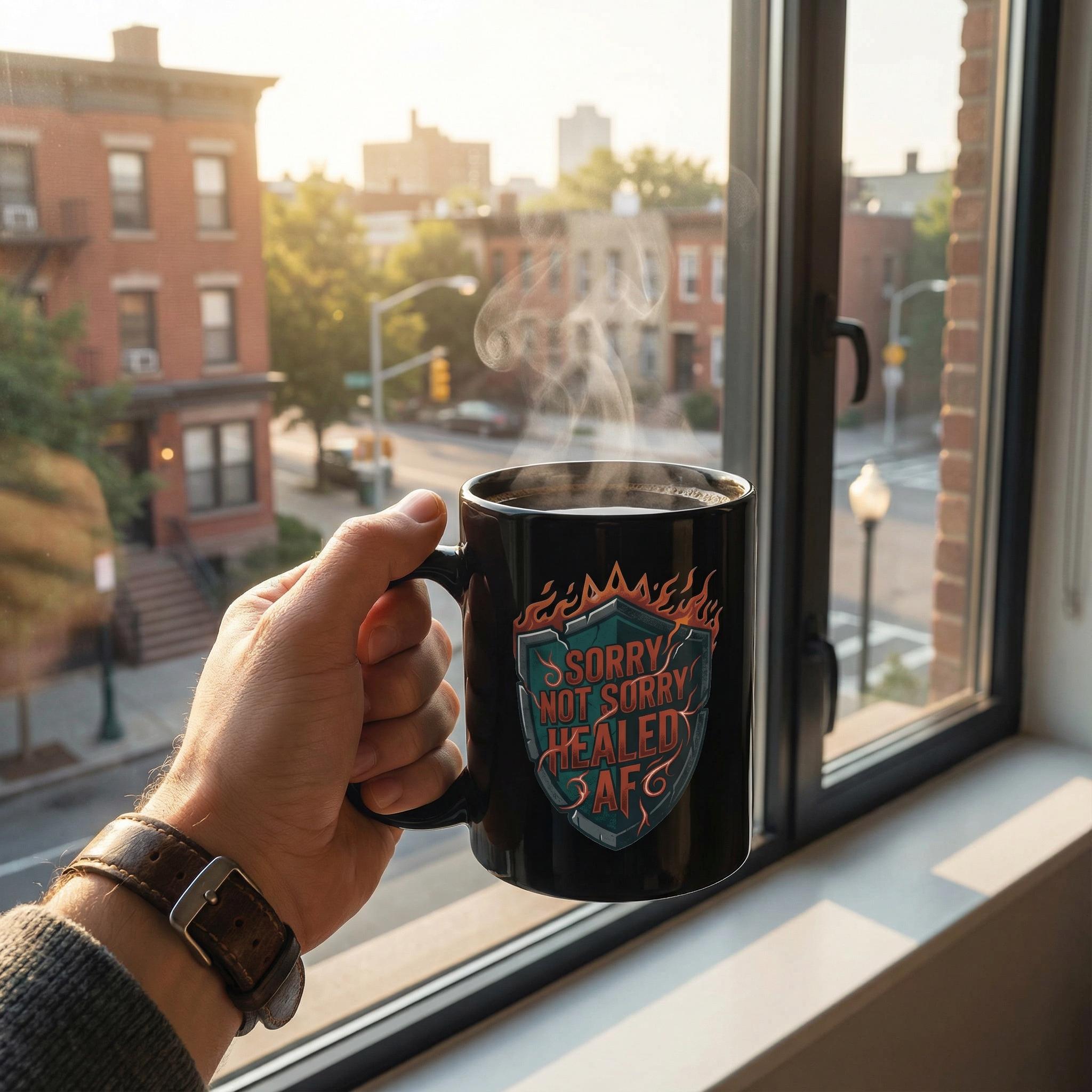 The “Sorry Not Sorry Healed AF” mug is for anyone who’s done the work, learned the lesson, and no longer explains their boundaries. Bold shield artwork and fiery details meet unapologetic humor—because growth doesn’t cancel personality.