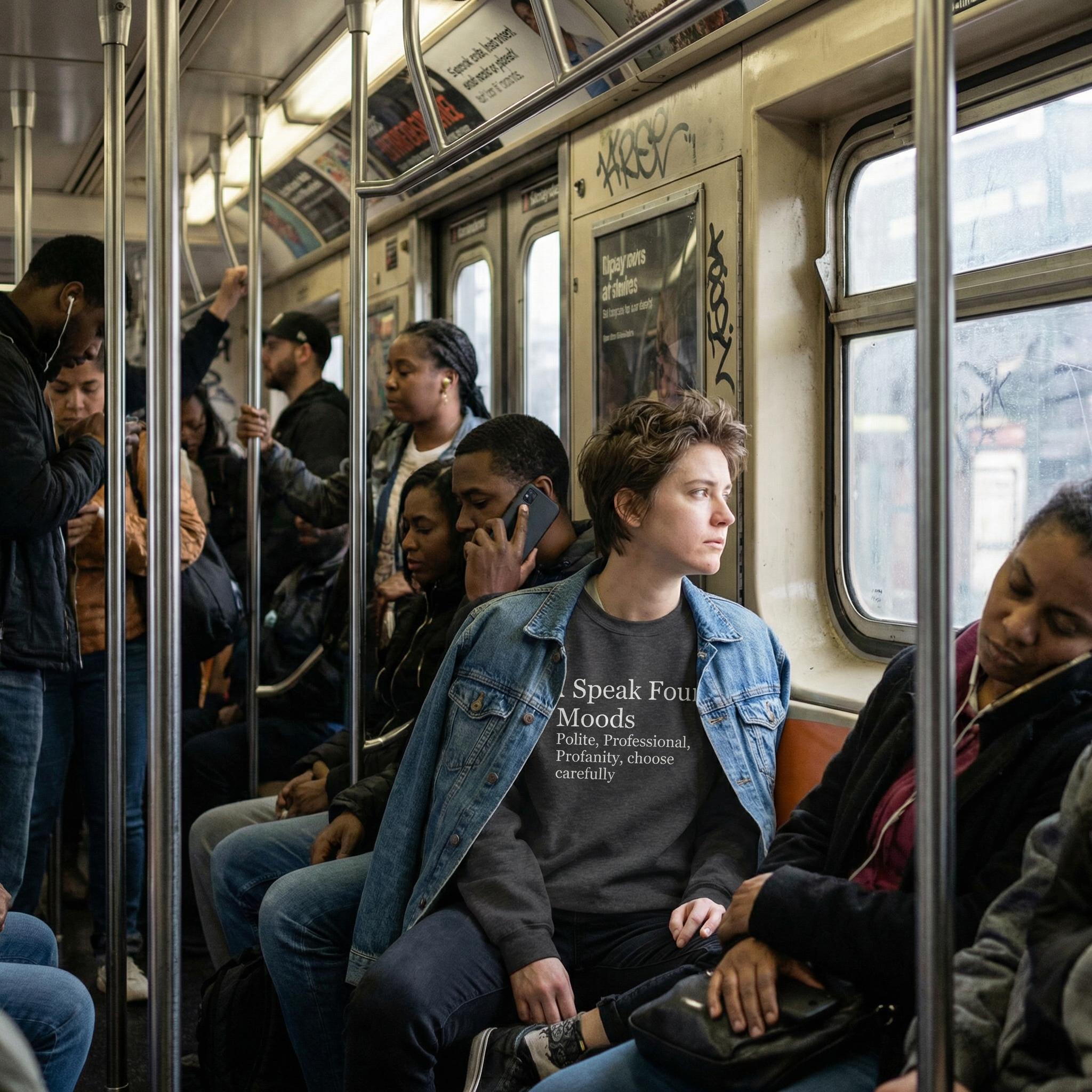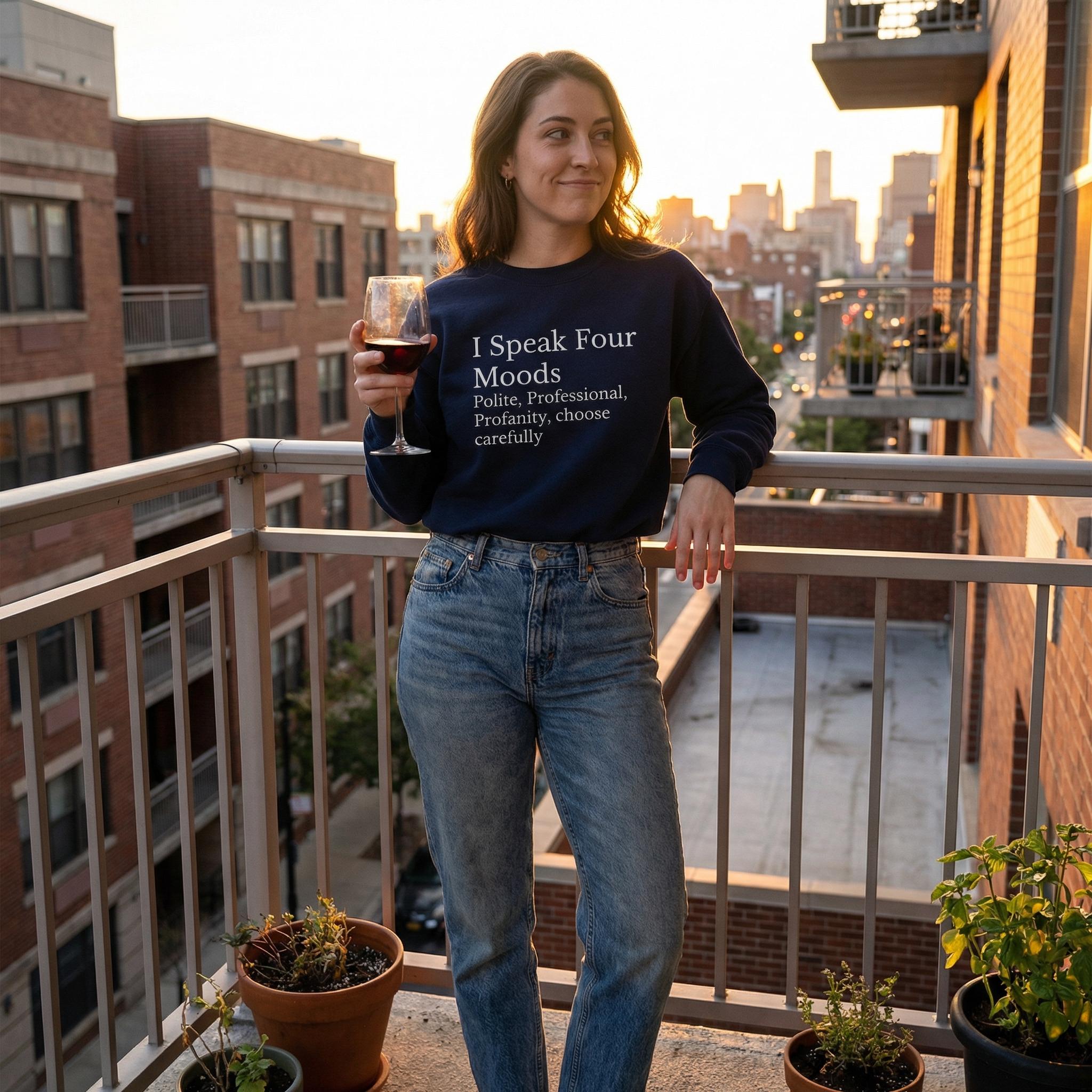 This “I Speak Four Moods” sweatshirt is office humor for people who survive meetings with sarcasm.