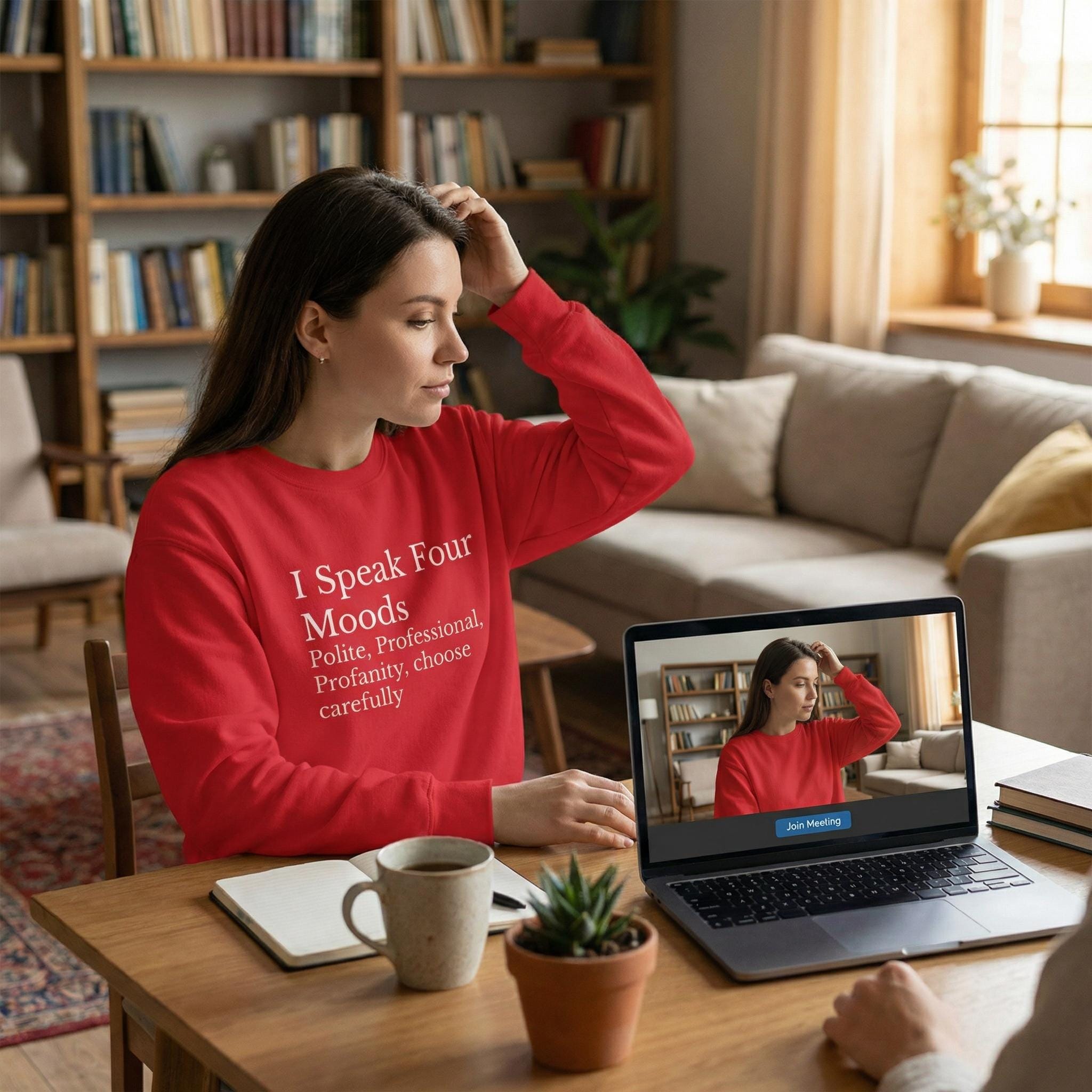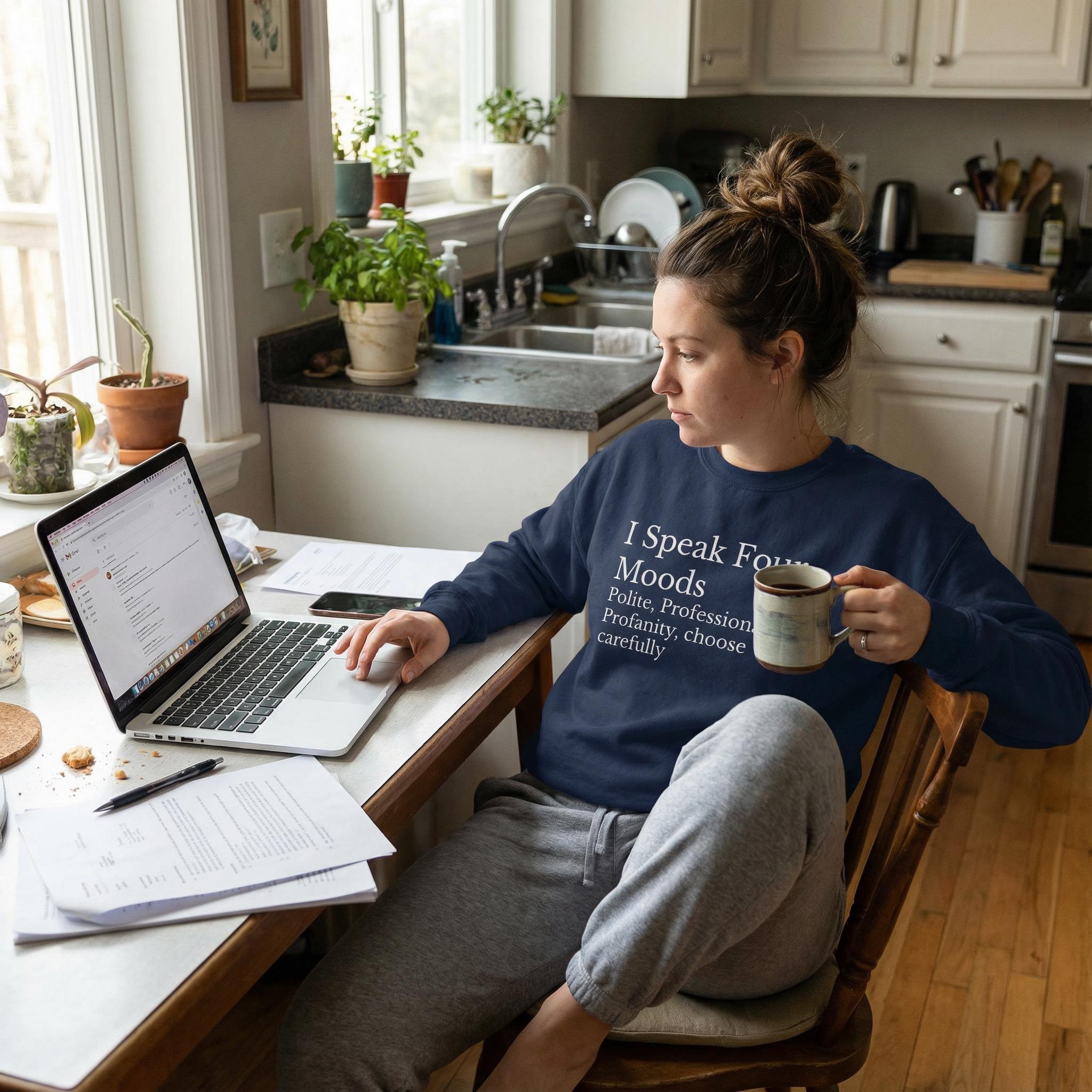 This “I Speak Four Moods” sweatshirt is for women who navigate work, meetings, emails, and life with just the right mix of politeness, professionalism, and quiet sarcasm. Soft, cozy, and relatable, it’s the perfect crewneck for office days, work-from-home life, or anyone surviving burnout with humor intact.
