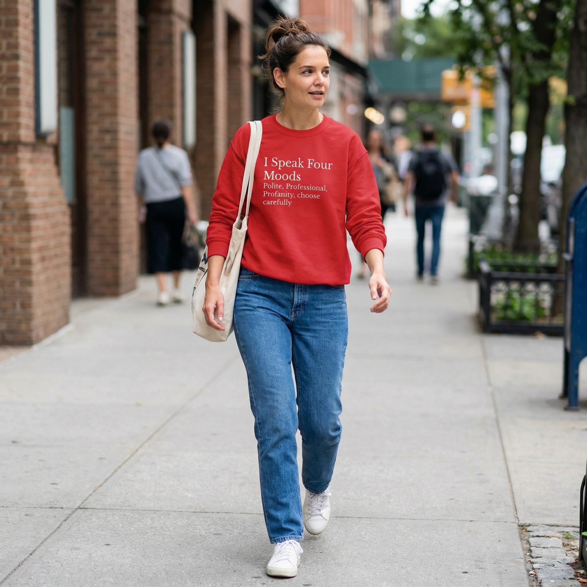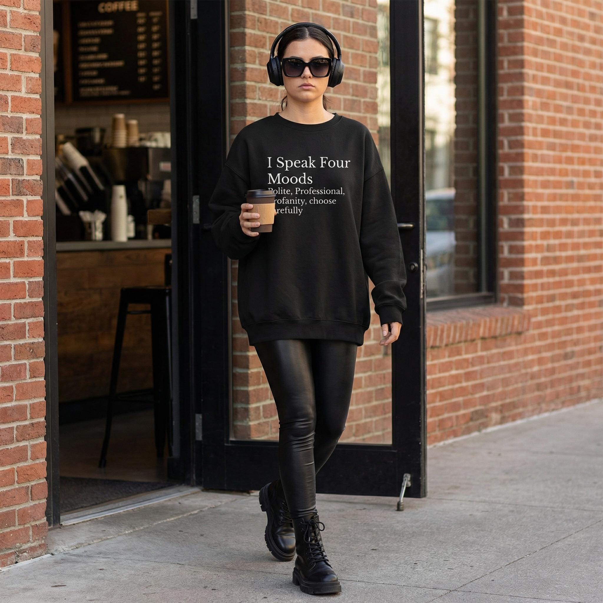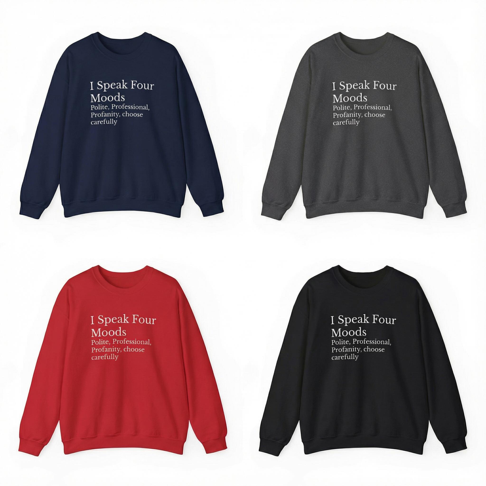 Funny Work Sweatshirt for Women, Office Sarcasm Crewneck, “I Speak Four Moods” Burnout Humor Gift
