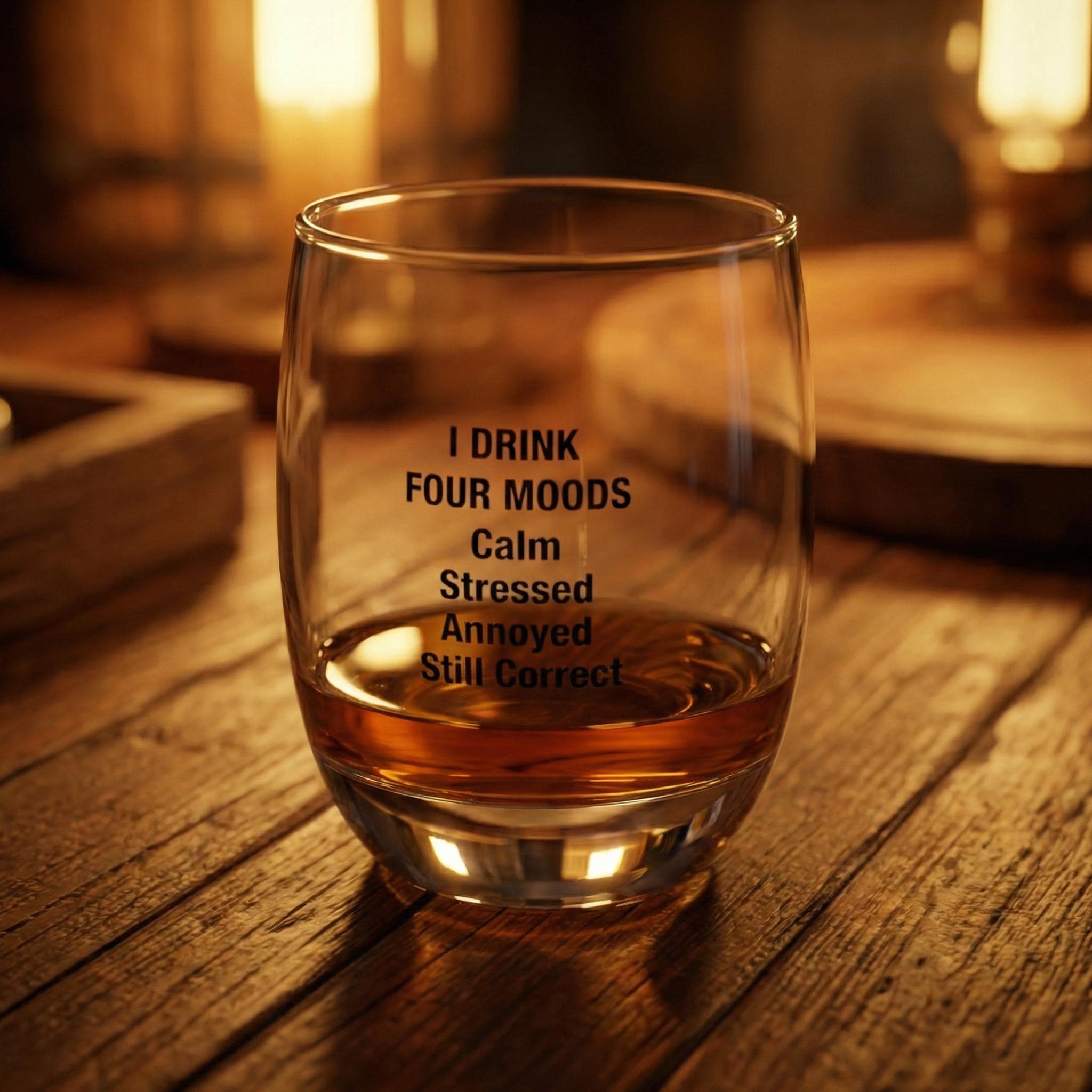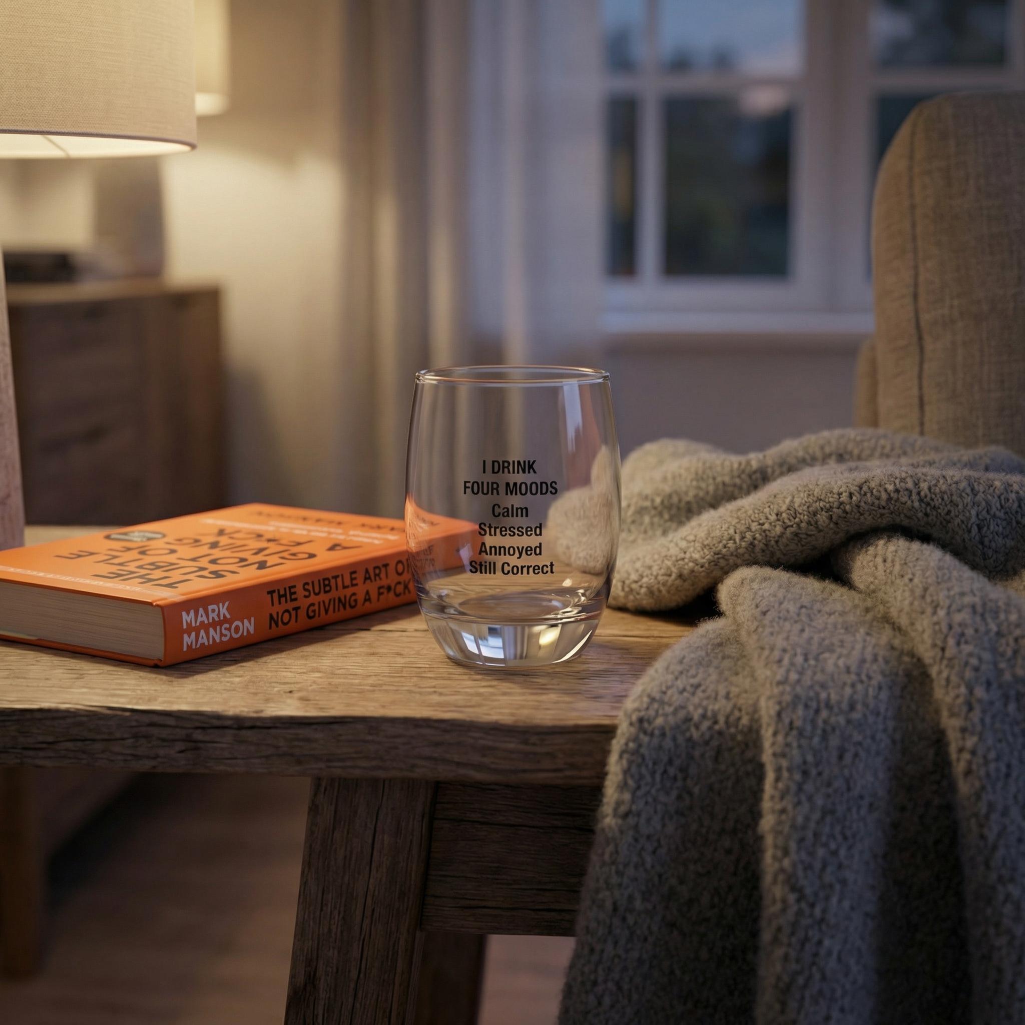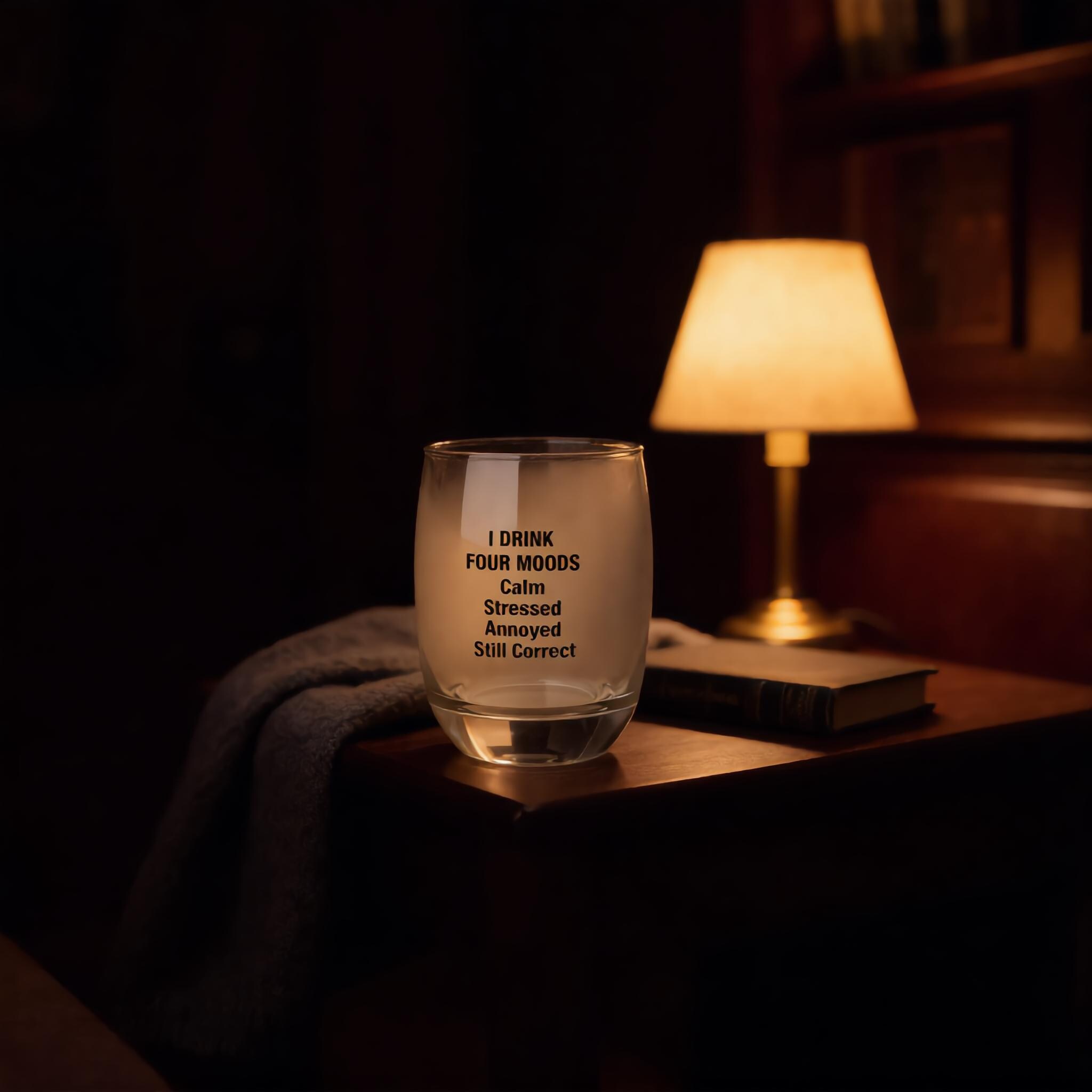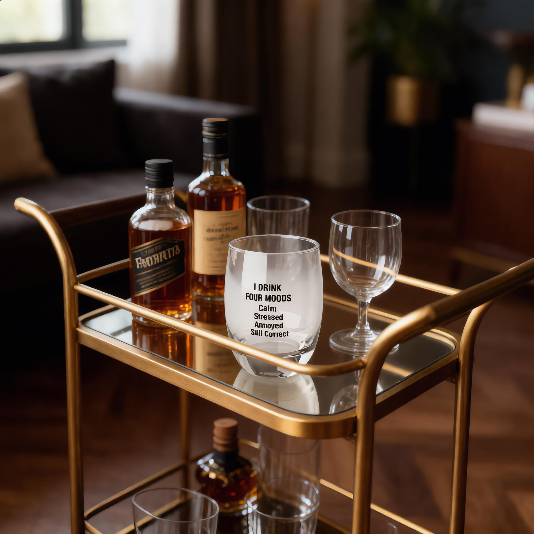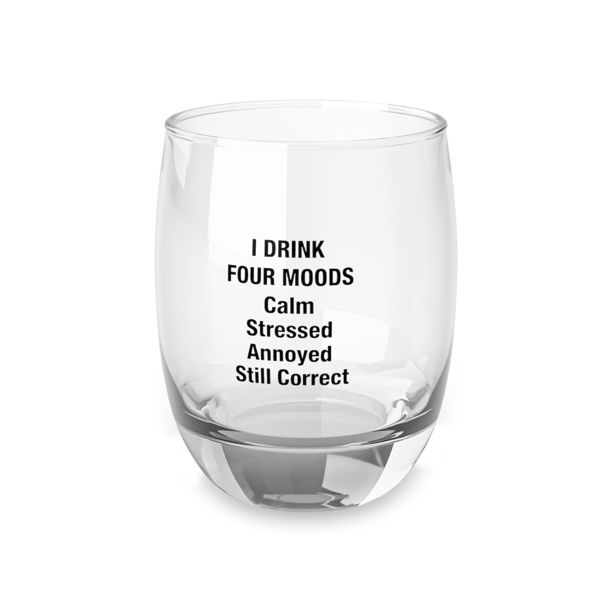 Elevate your barware collection with this fun and witty I Drink Four Moods Whiskey Glass, perfect for home bars, cocktail nights, or as a humorous gift for whiskey lovers. Crafted with a sleek 6 oz capacity, this glass is designed for smaller pours but big attitudes. Its clear, durable glass features a permanent print that won't fade, showcasing a playful list of moods—Calm, Stressed, Annoyed, Still Correct—that perfectly capture the spirit of happy hour or relaxed evenings.