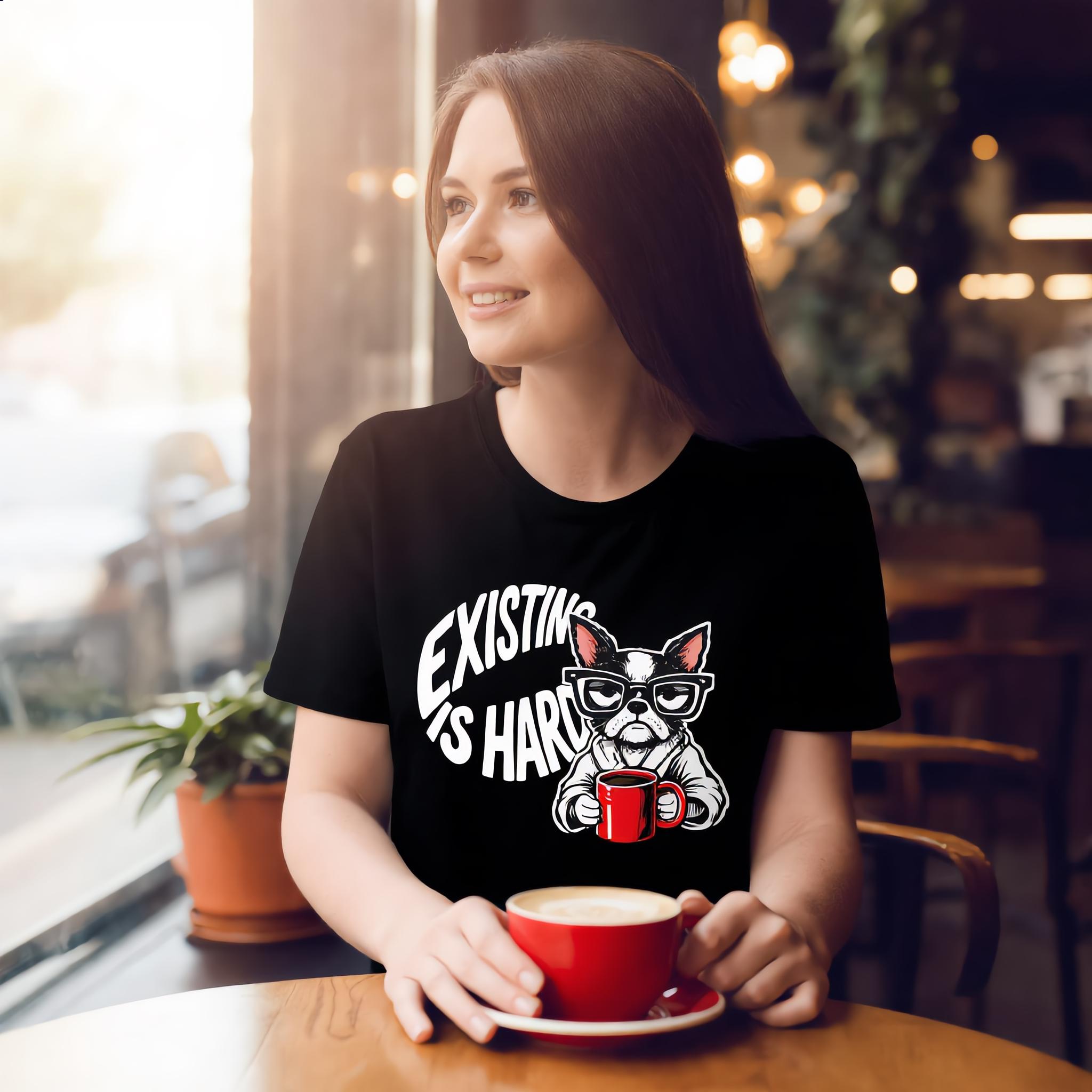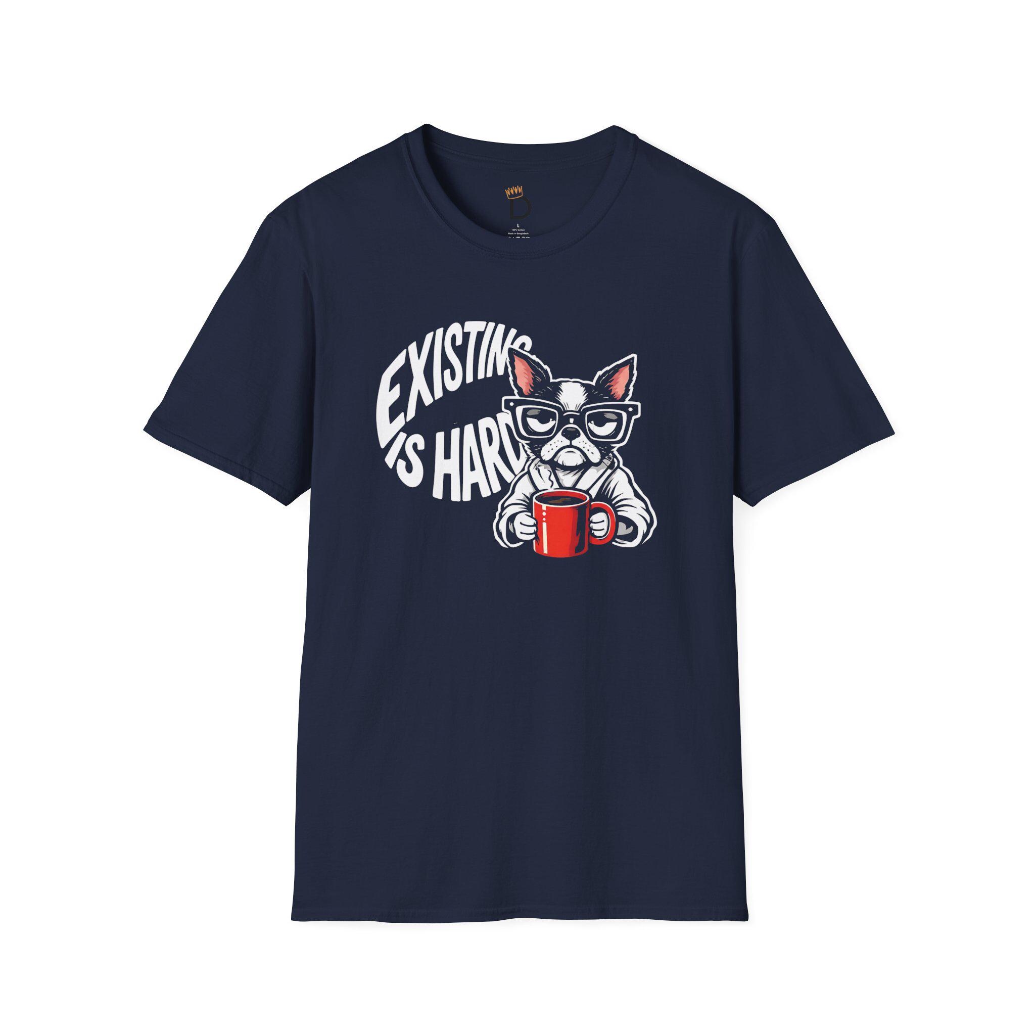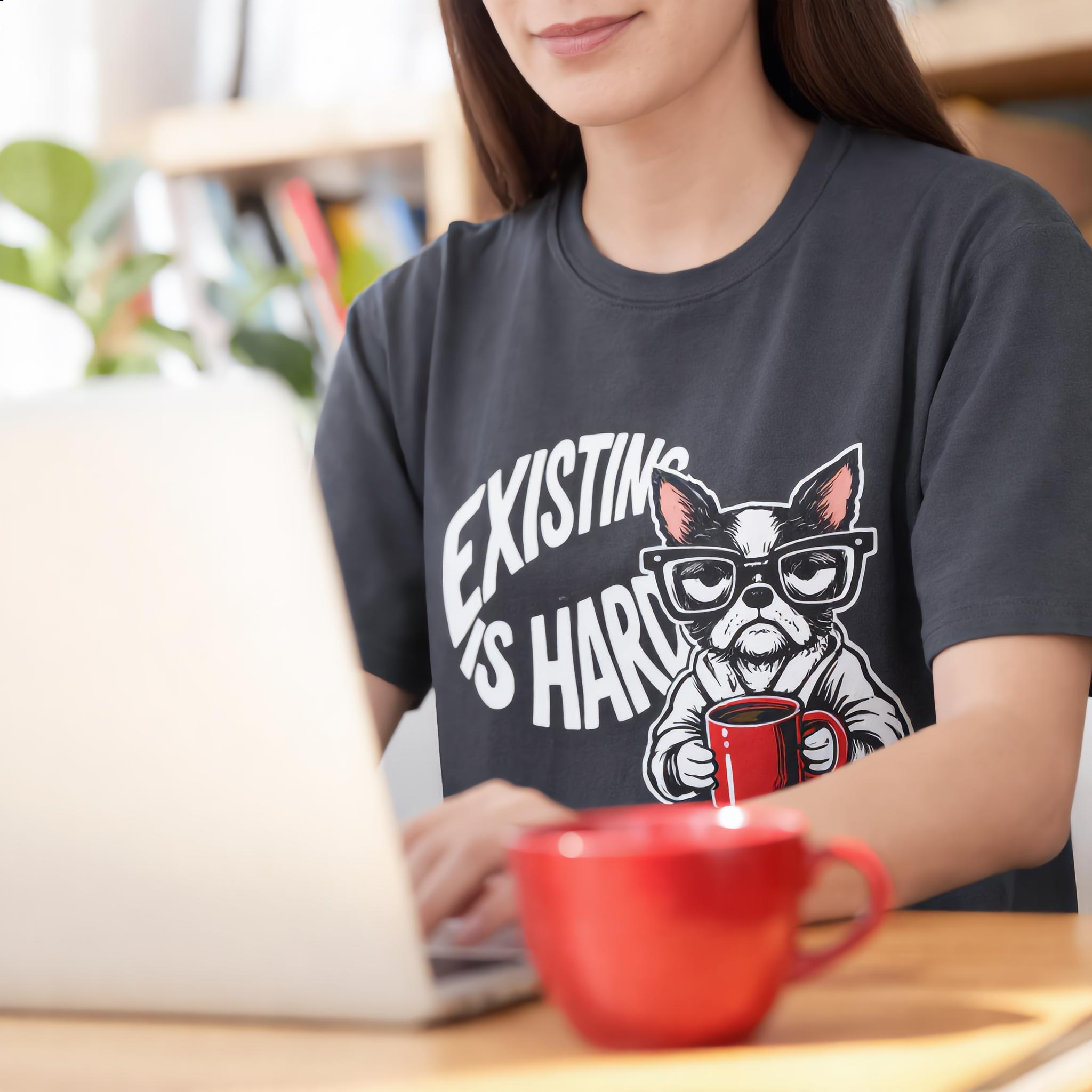 Finally, a shirt that understands your morning energy. Our "Existing Is Hard" tee features a relatable, coffee-clutching pup who is just as over it as you are. Whether you're a dog lover, a caffeine addict, or just someone navigating the daily grind with a side of sass, this soft-style graphic tee is your new go-to.