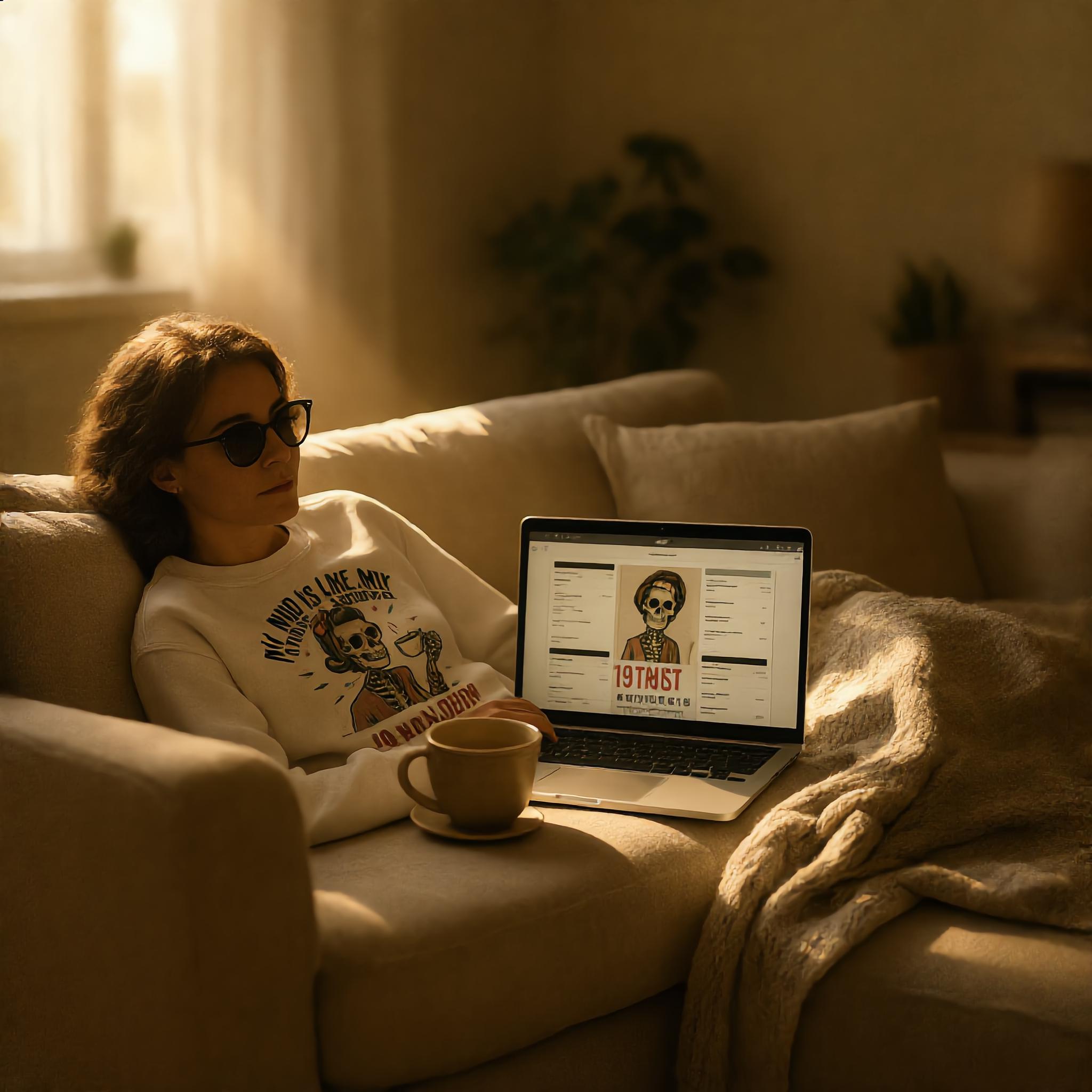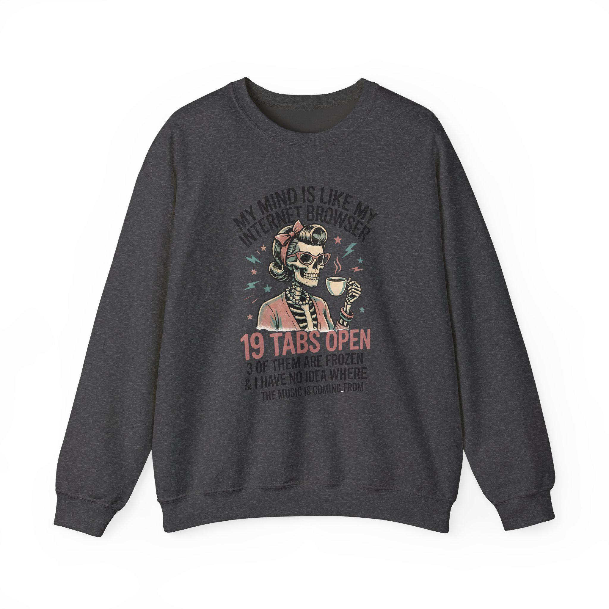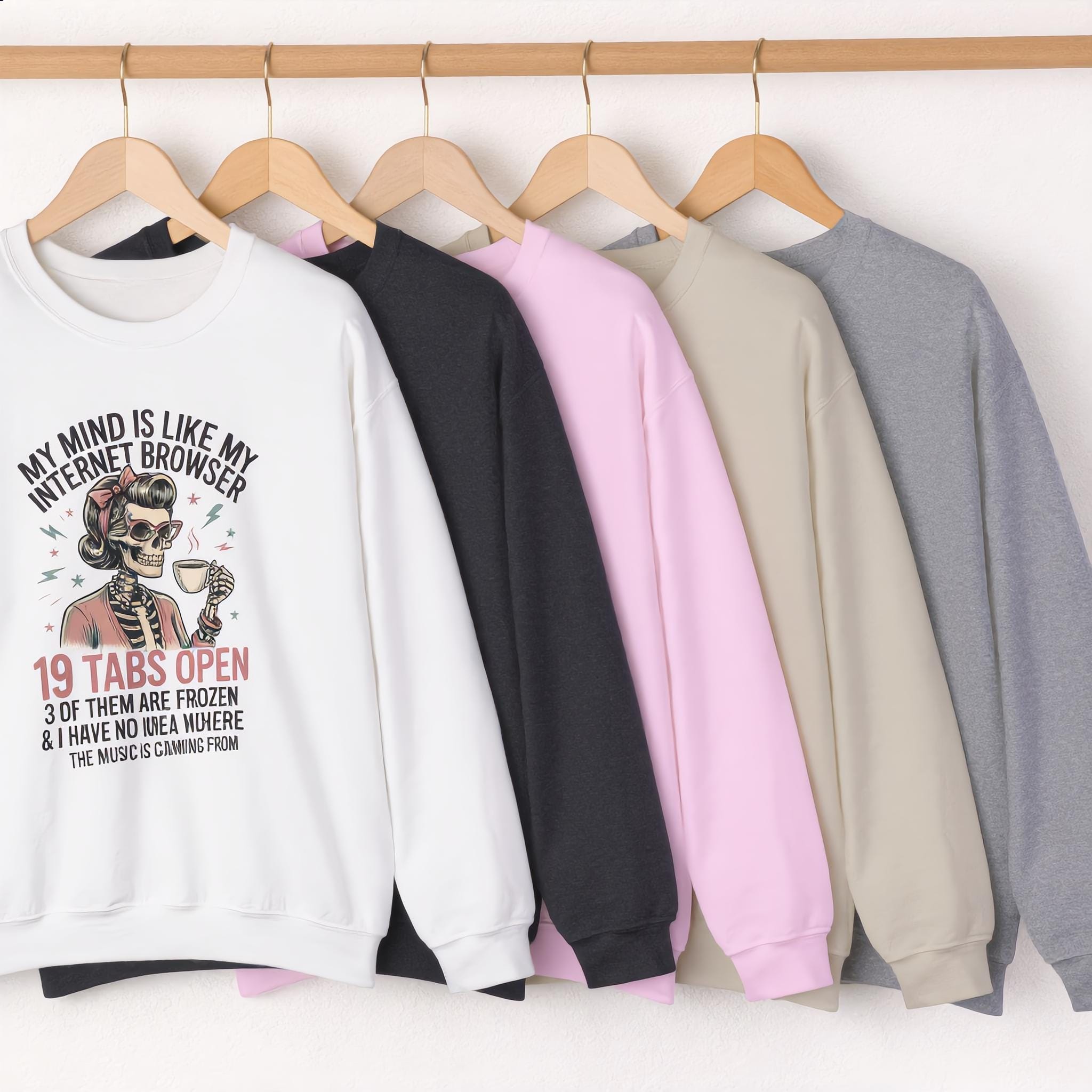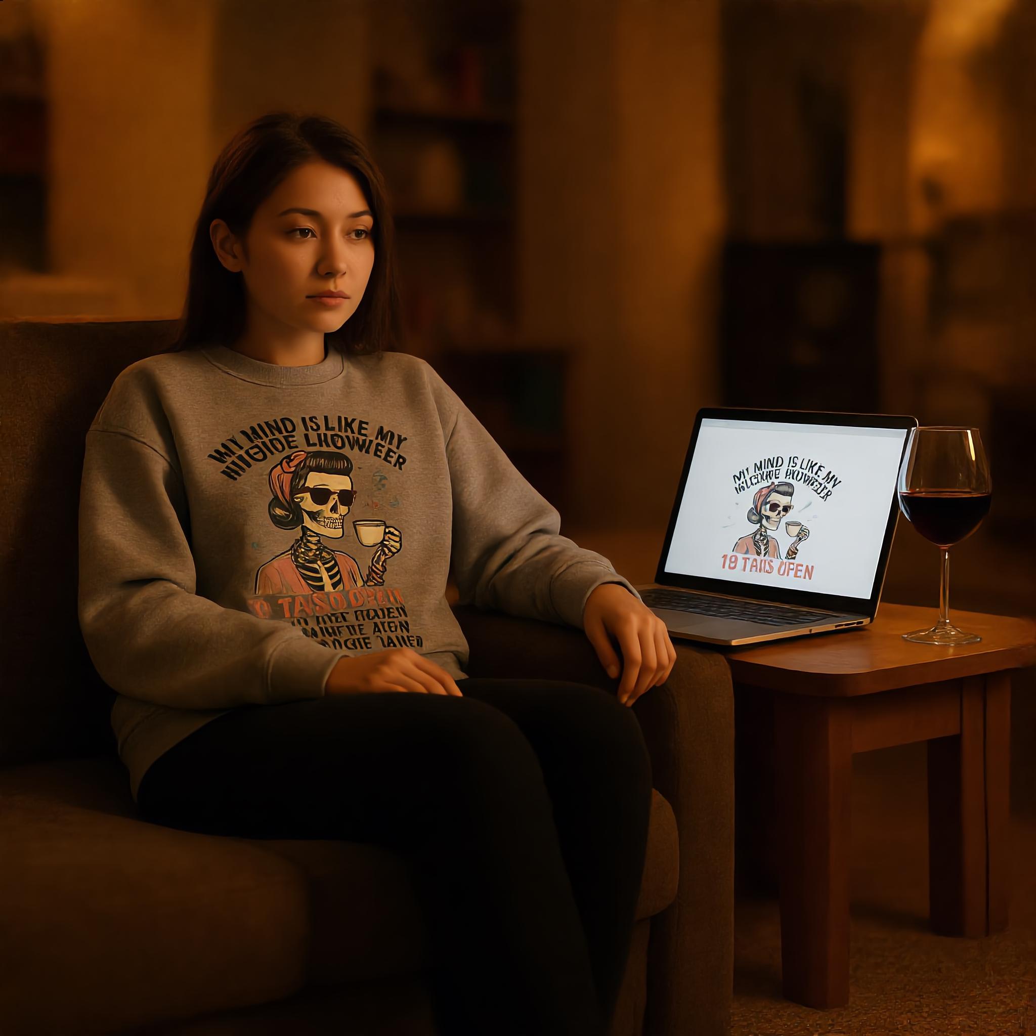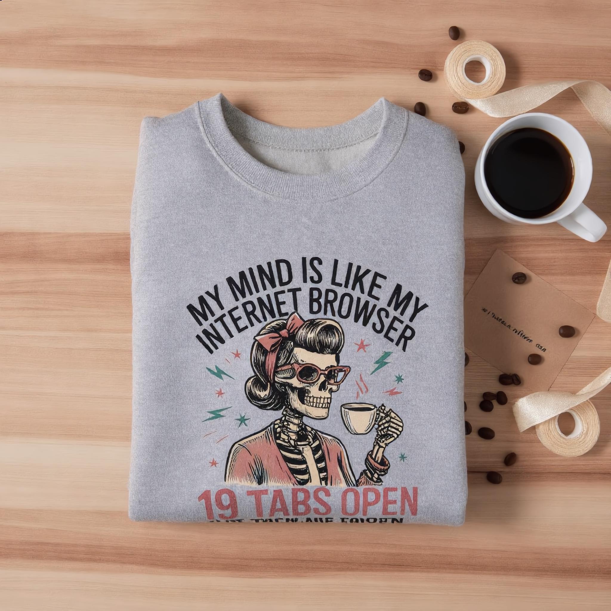 This cozy crewneck features a stylish female skeleton sipping coffee while mentally juggling 19 tabs open, 3 frozen, and zero clue where the music is coming from. It’s the perfect mix of funny, relatable, and just a little unhinged—in the best way.