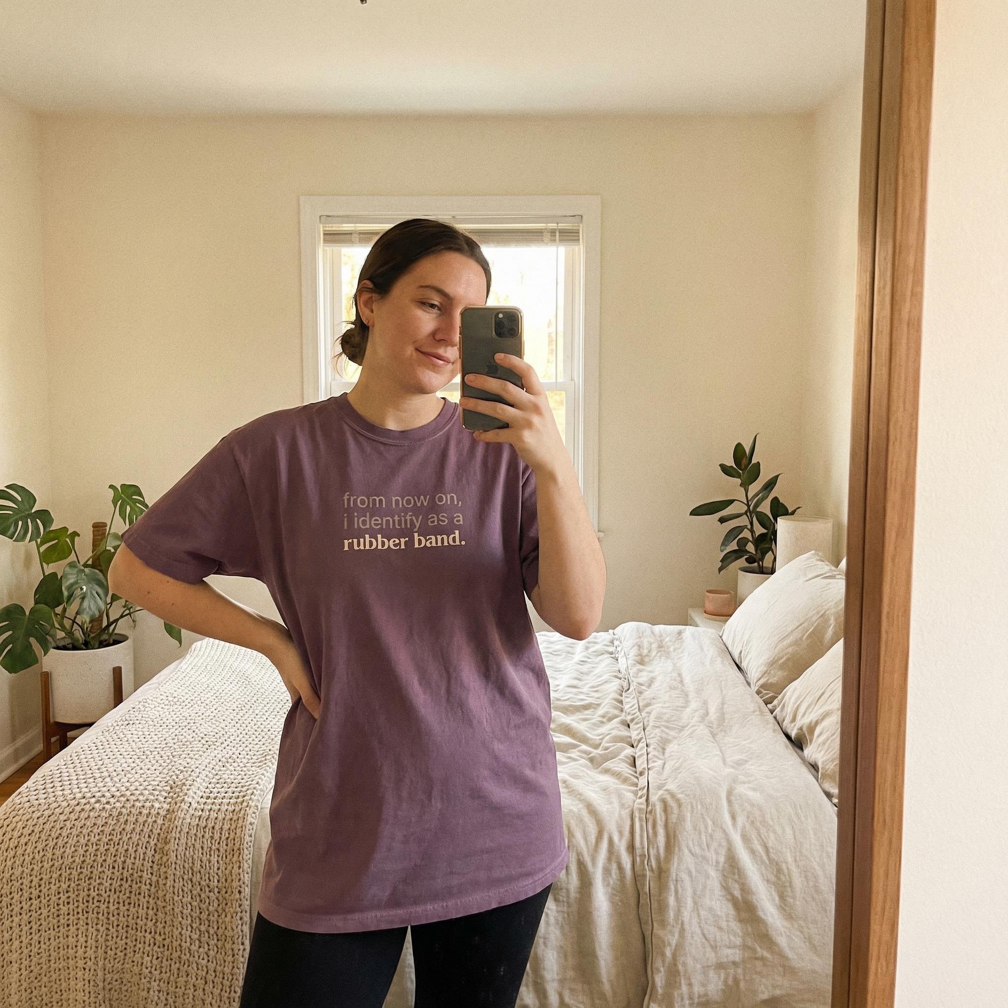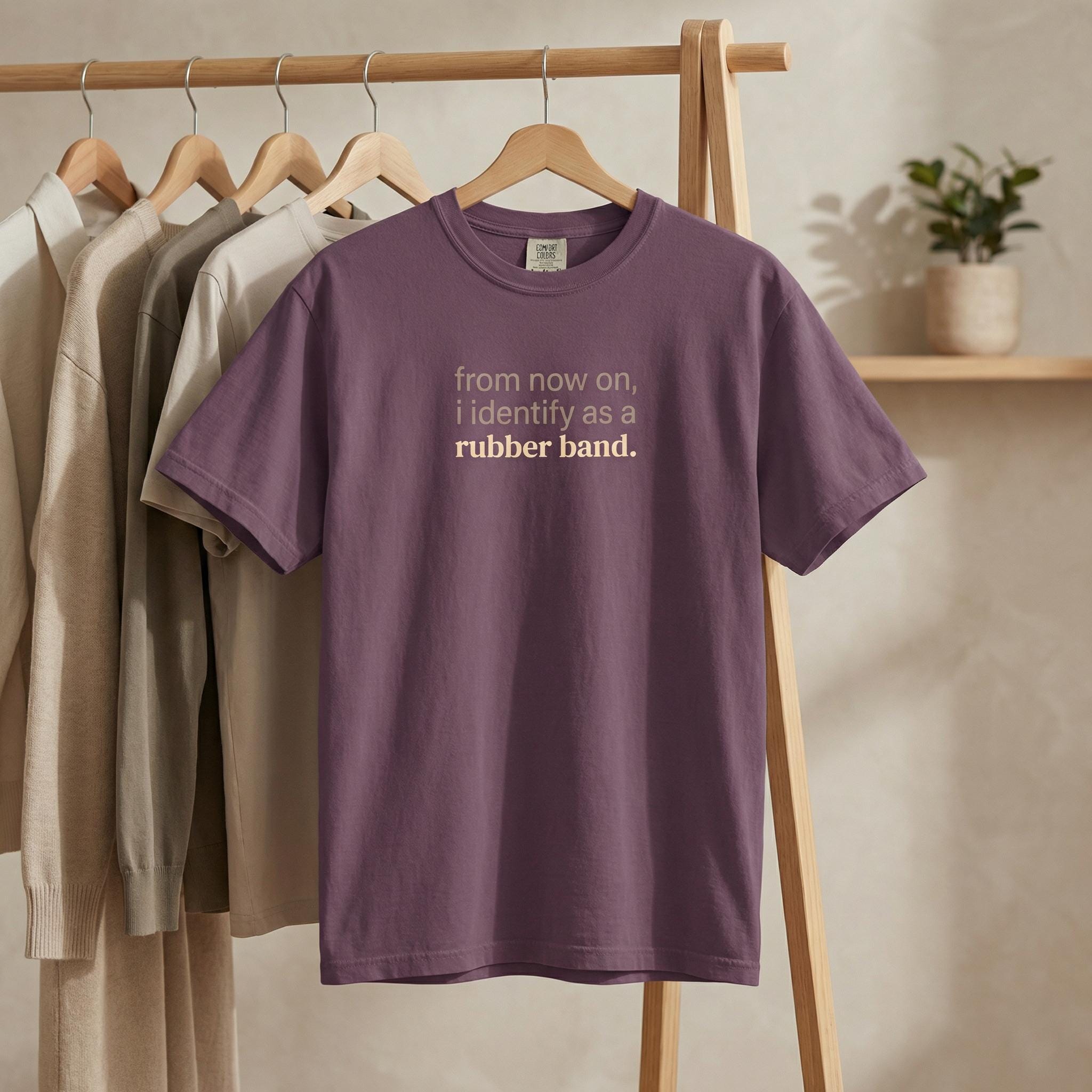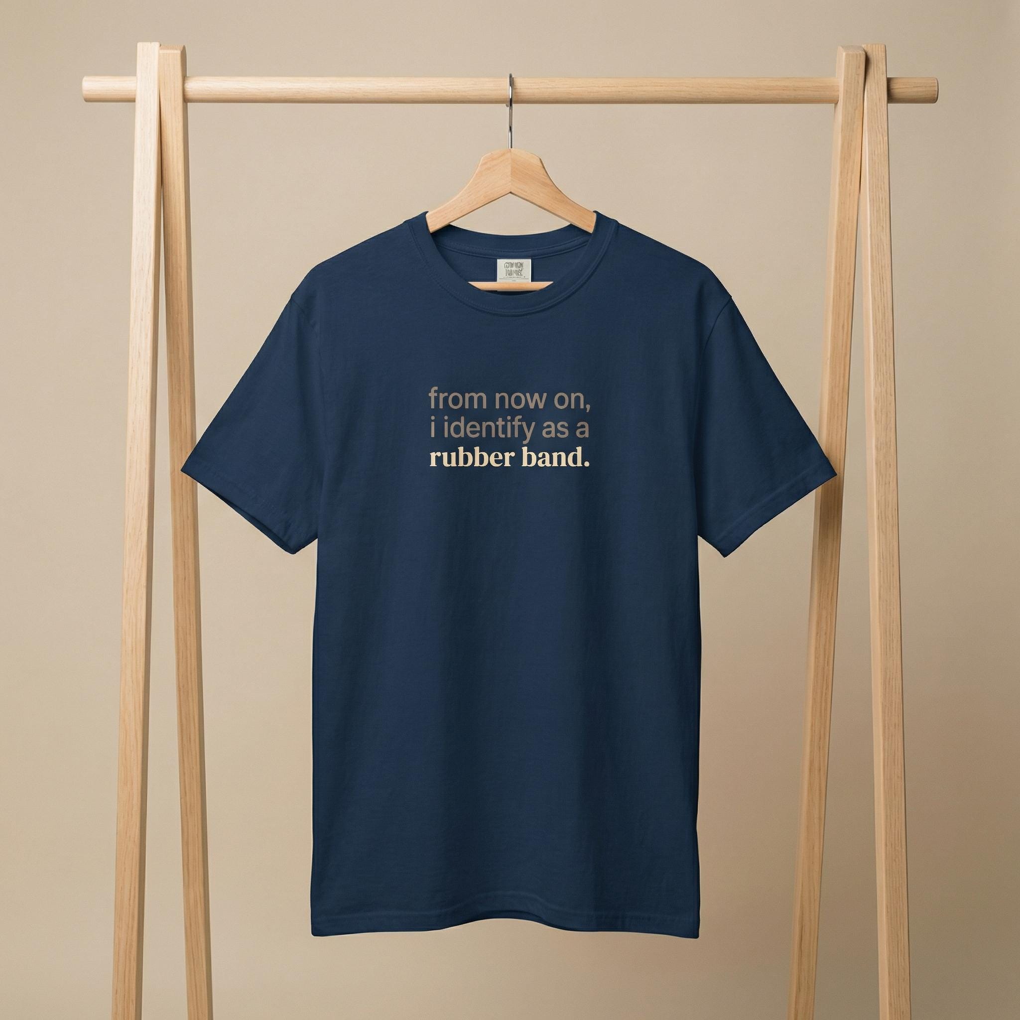 This soft, minimalist Rubber Band tee is for the quietly overwhelmed, the gentle overthinkers, and anyone who survives the day on emotional flexibility and humor.