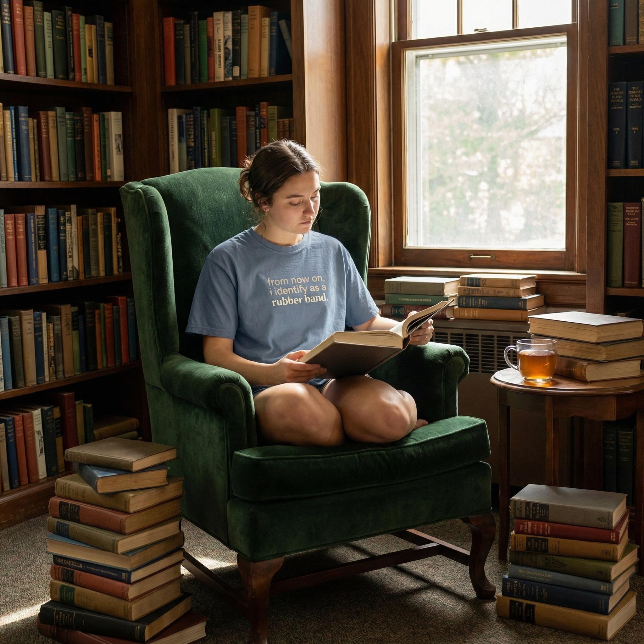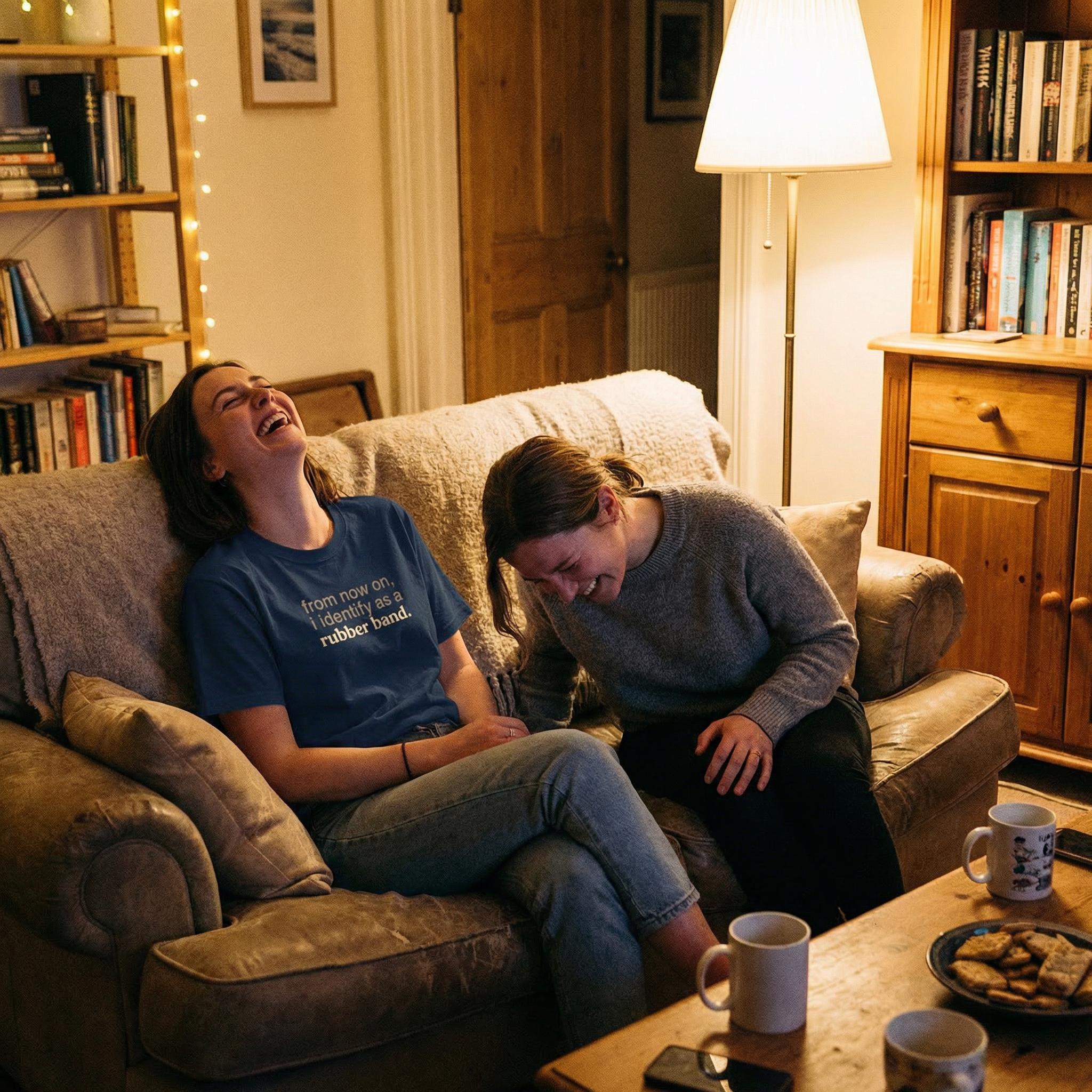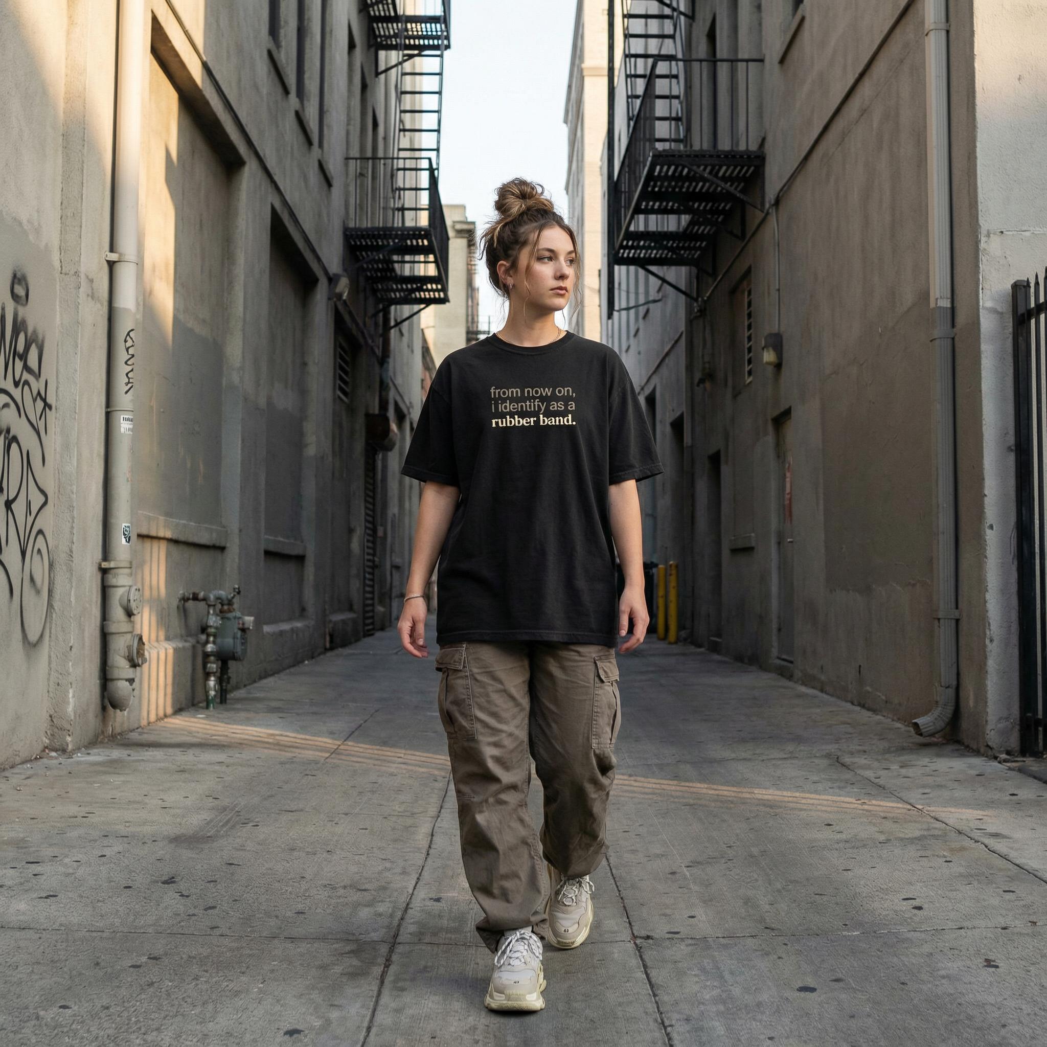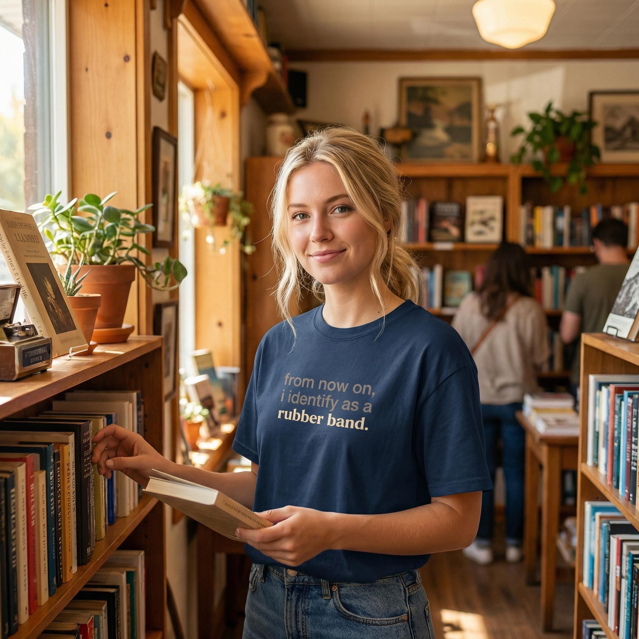 This soft, minimalist Rubber Band tee is for the quietly overwhelmed, the gentle overthinkers, and anyone who survives the day on emotional flexibility and humor.