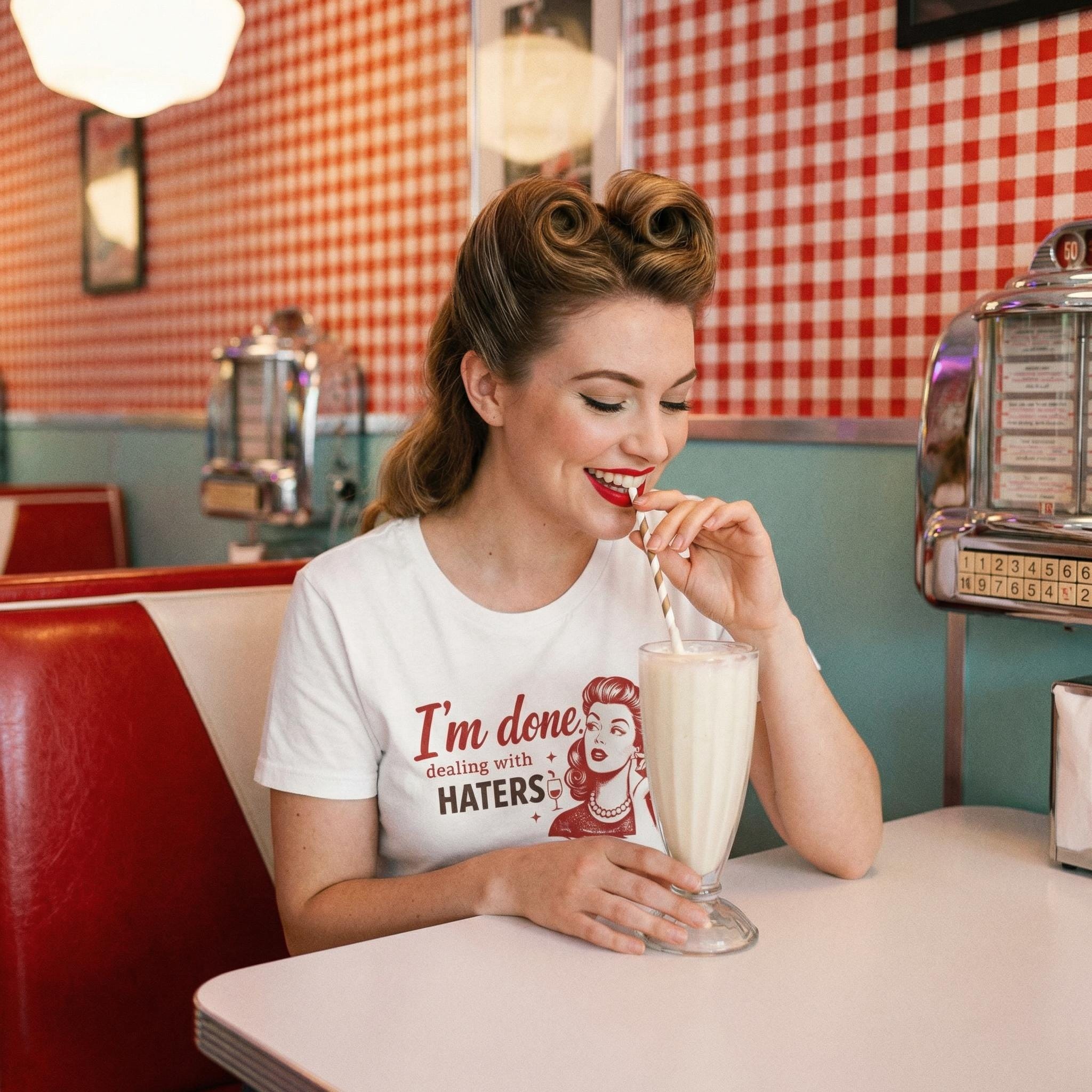 I'm Done Dealing With Haters—and loving it. This vintage retro tee channels sassy pin-up energy for the woman who's all about no-drama vibes and self-empowerment. Premium Bella + Canvas 3001, made-to-order for that perfect fit, with a portion of proceeds fueling The Delia Foundation's mission to empower children with intellectual and developmental disabilities.