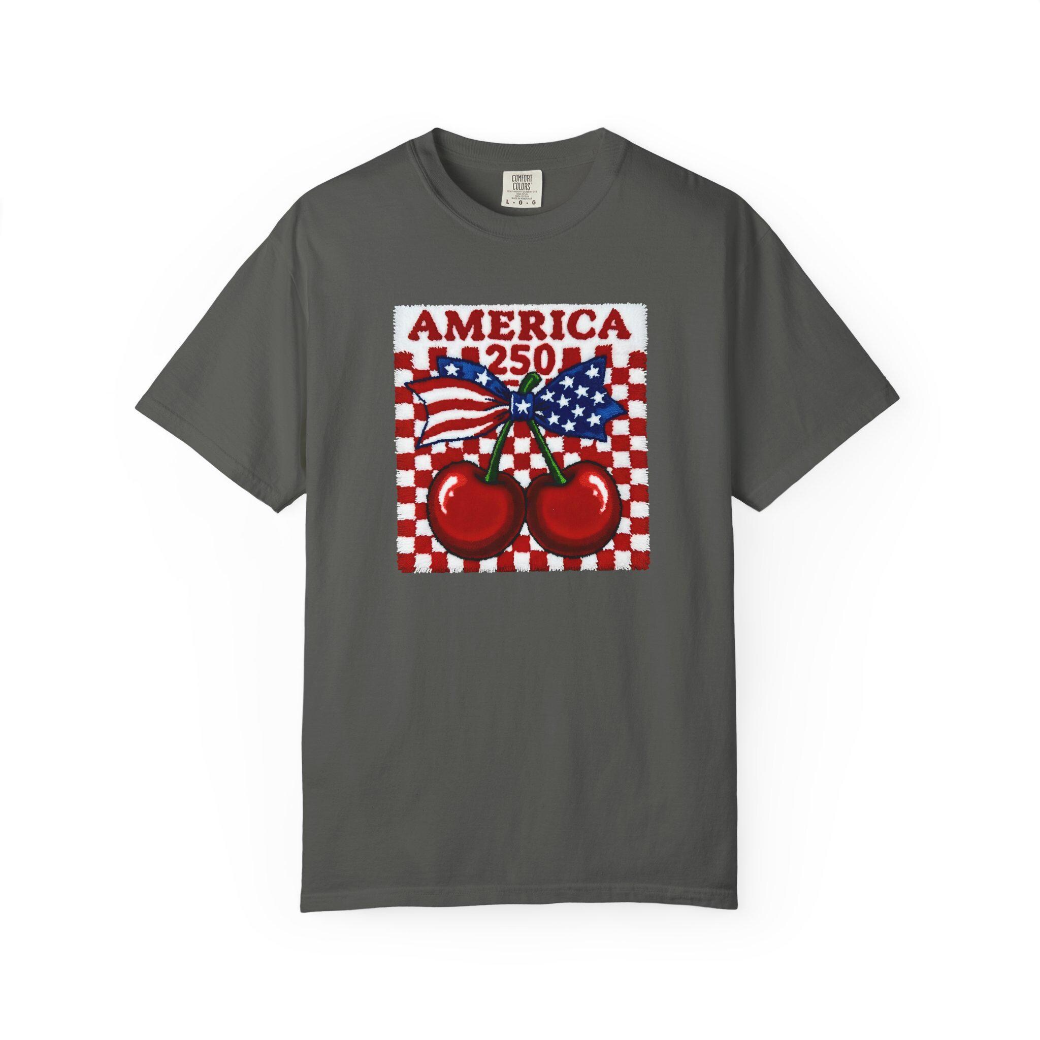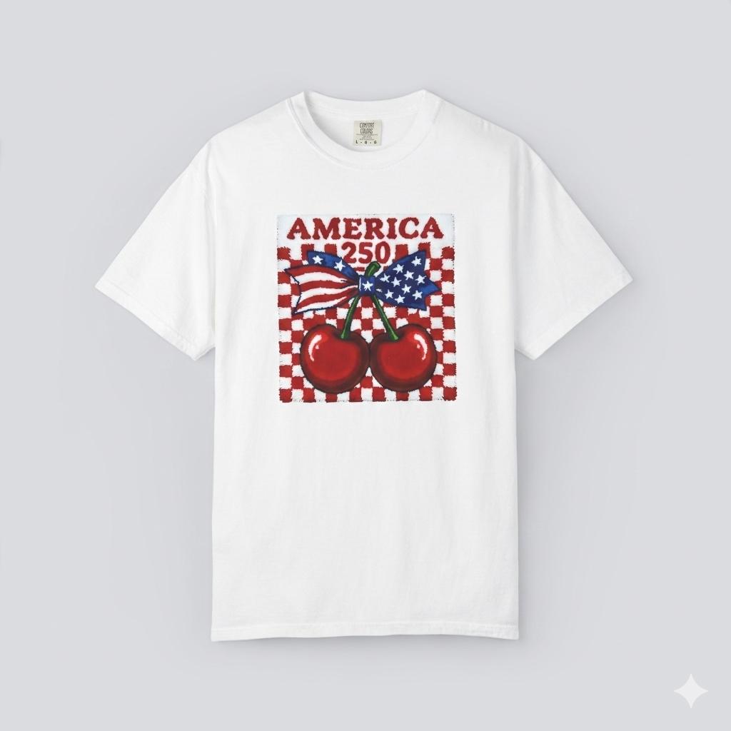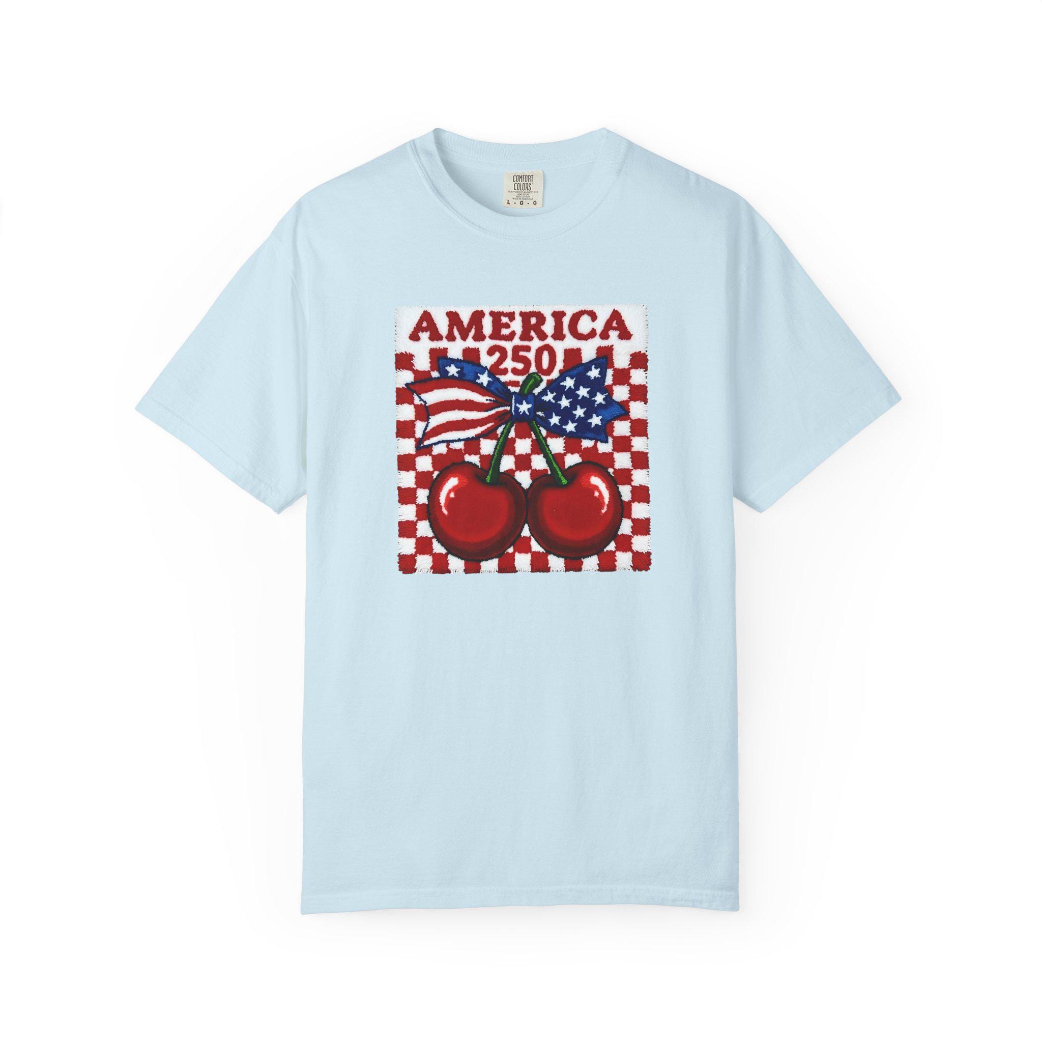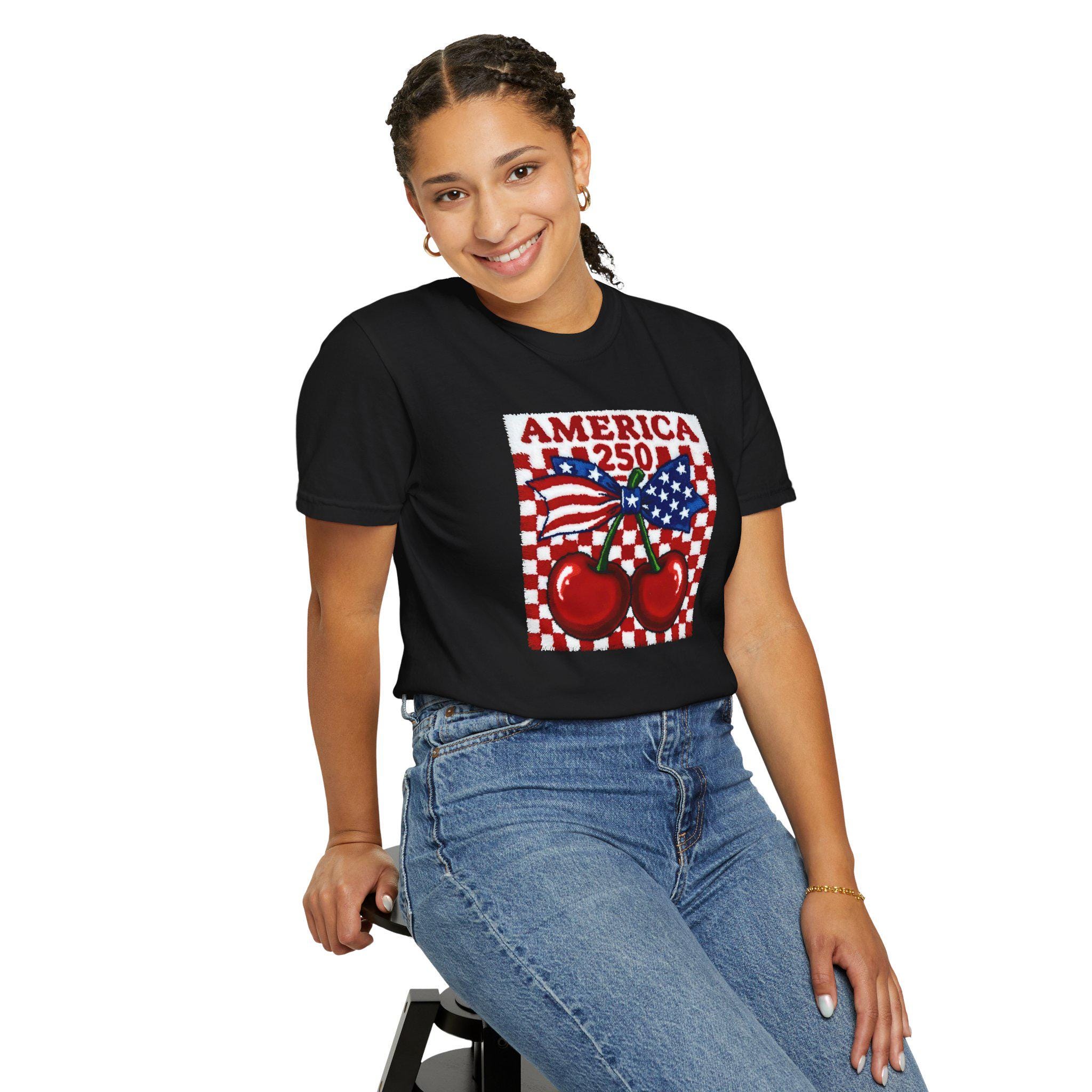America 250 Cherry Tee, Patriotic Faux Knit Comfort Colors Shirt