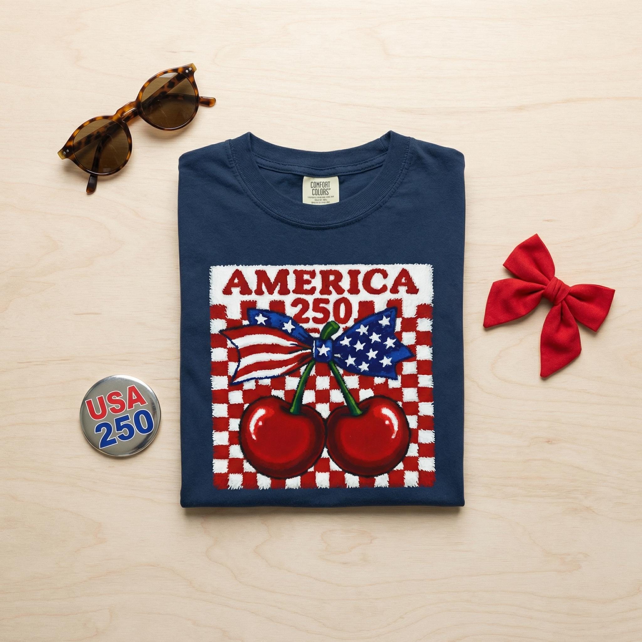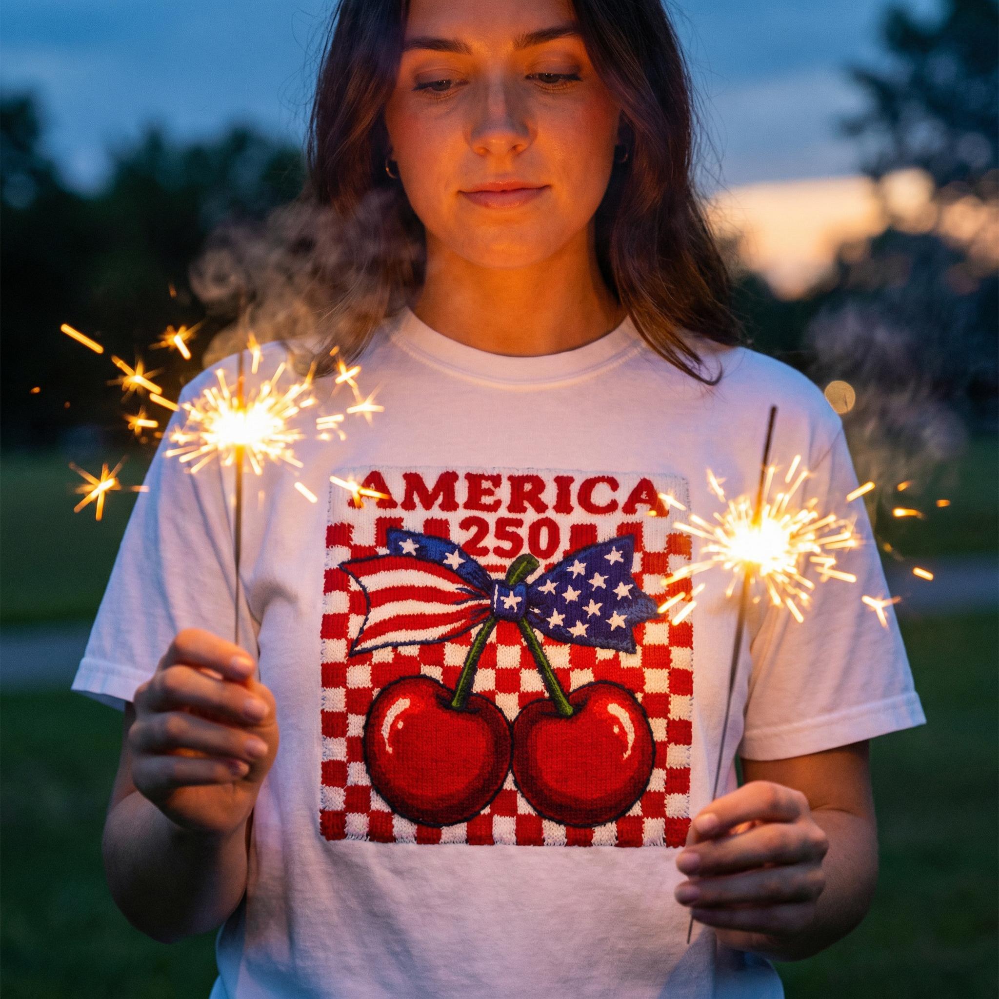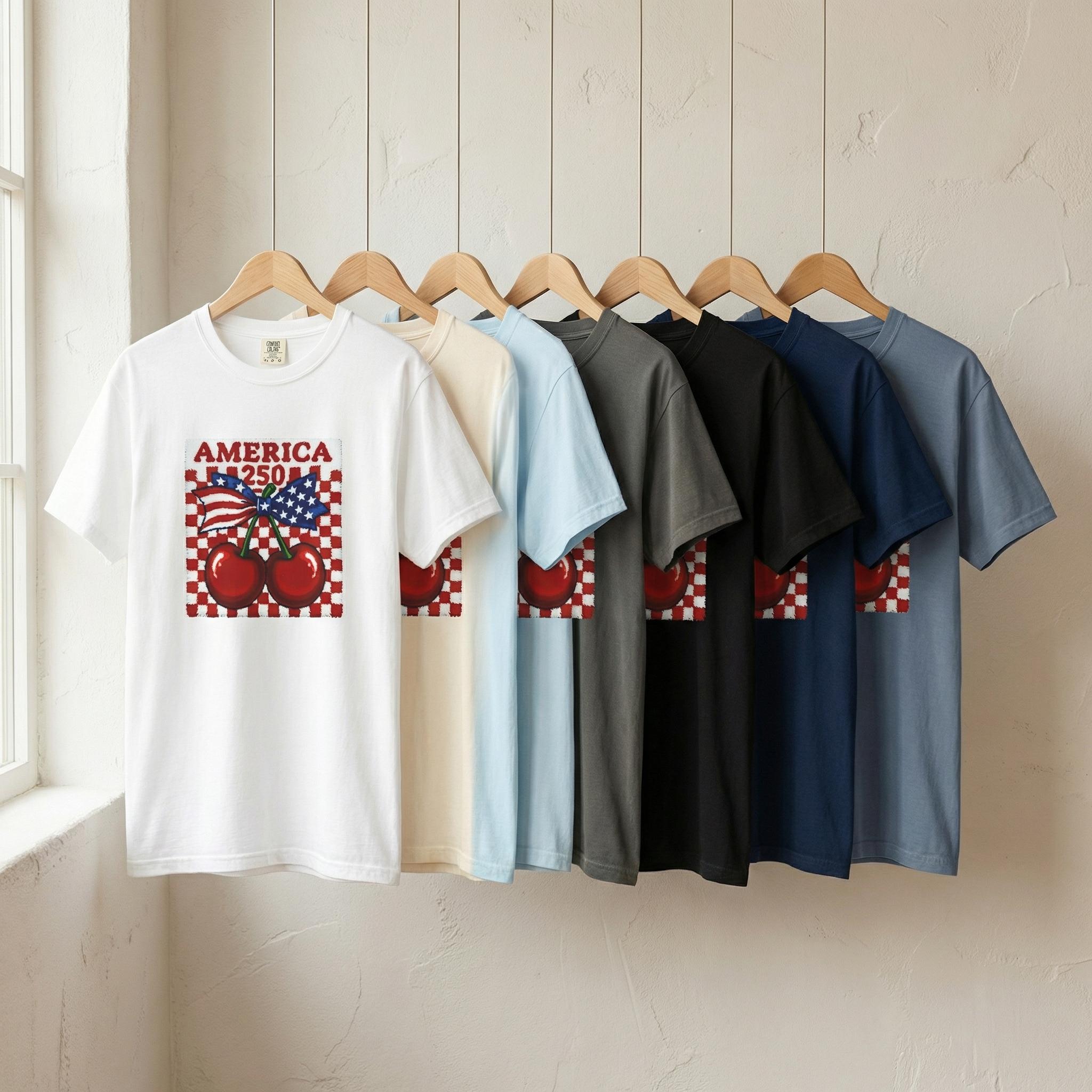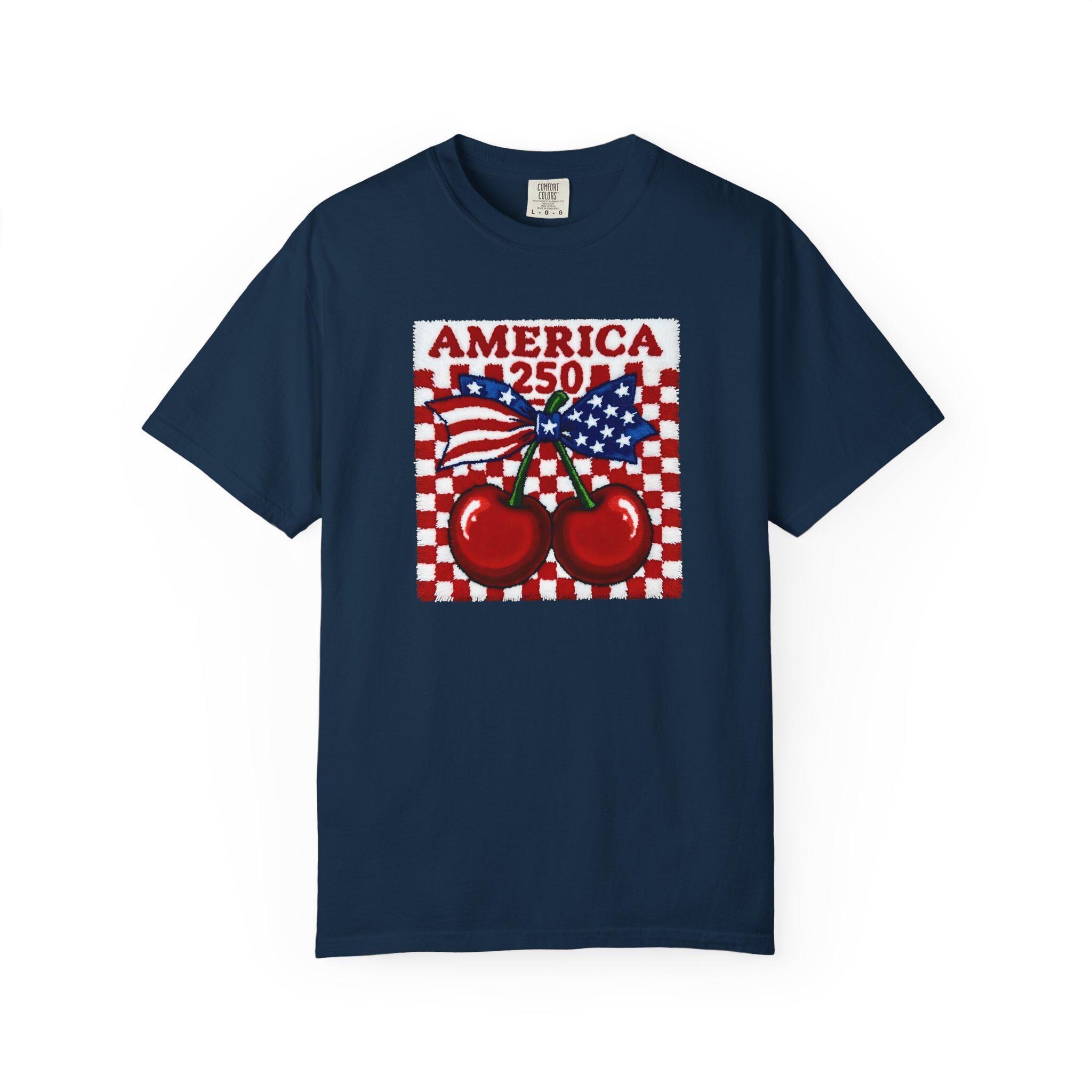 America 250 Cherry Tee, Patriotic Faux Knit Comfort Colors Shirt