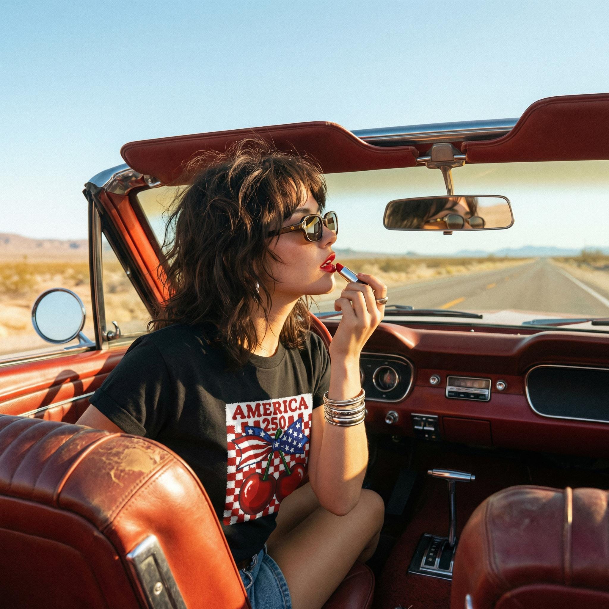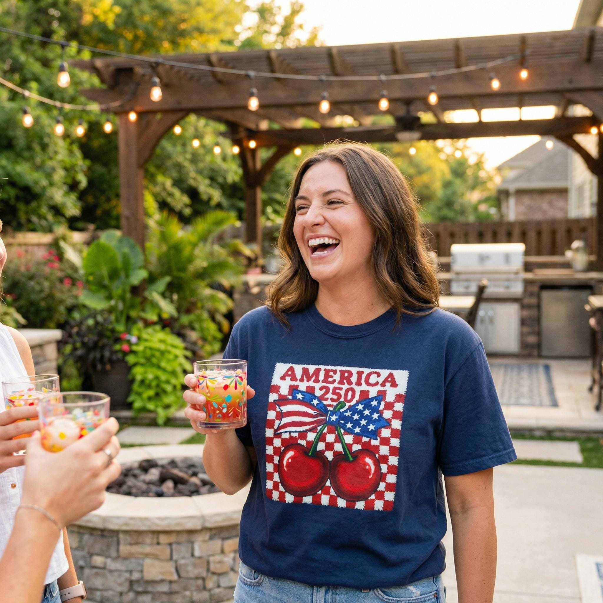 Get the look of a vintage hand-knit sweater with the breezy comfort of your favorite tee. Our "America 250" Patriotic Cherry design features a unique faux-knit texture, a trendy checkered background, and a coquette-style bow, perfect for the Semiquincentennial. Whether you're at a Philadelphia parade or an Arizona backyard BBQ, this is the "Main Character" patriotic top you've been looking for.