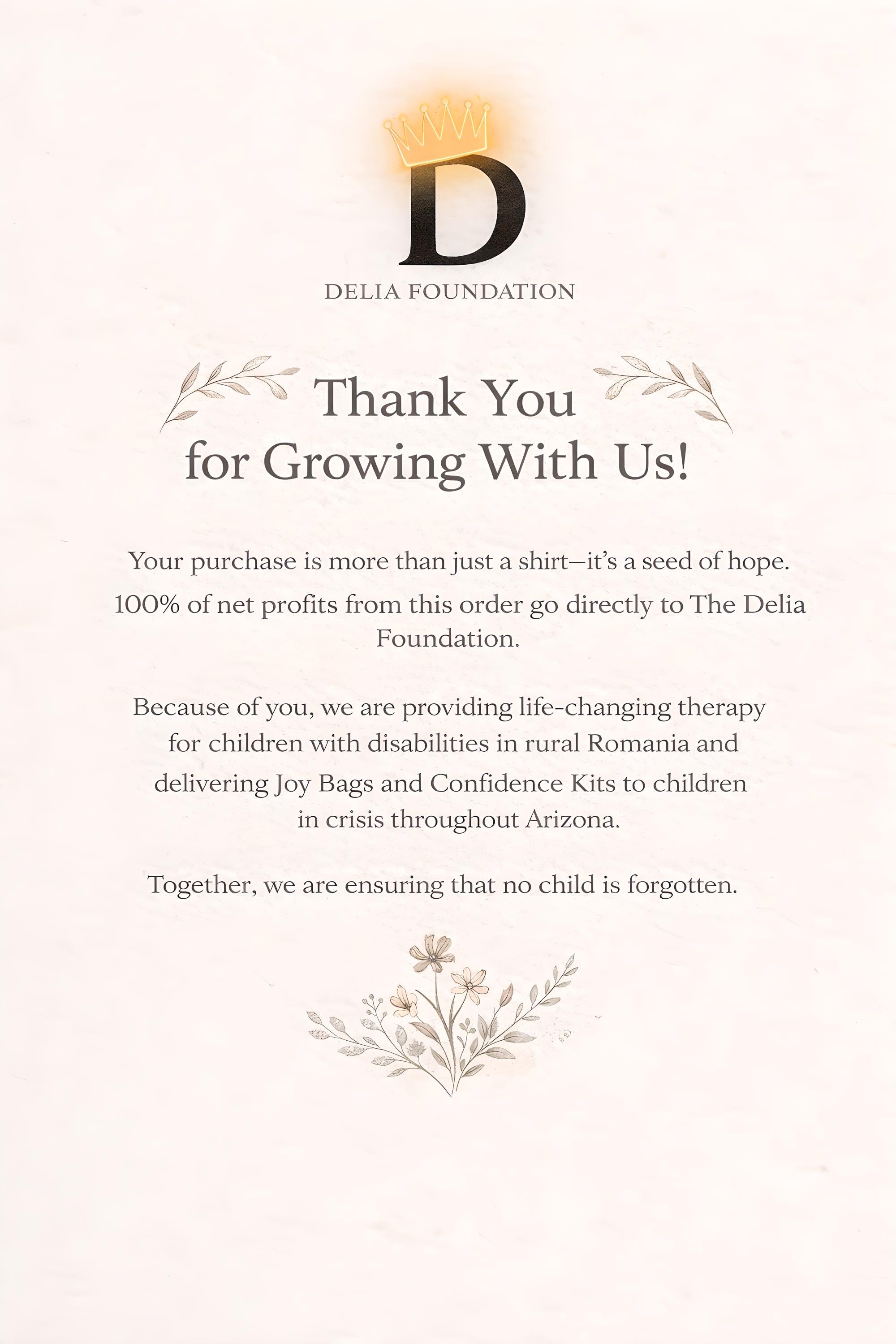 100% of net profits from this purchase go directly to The Delia Foundation. Your support provides specialized therapy for children with disabilities in rural Romania and delivers Joy Bags and Confidence Kits to children in crisis throughout Arizona. At unfilteredconfidence, we ensure that no child is forgotten.