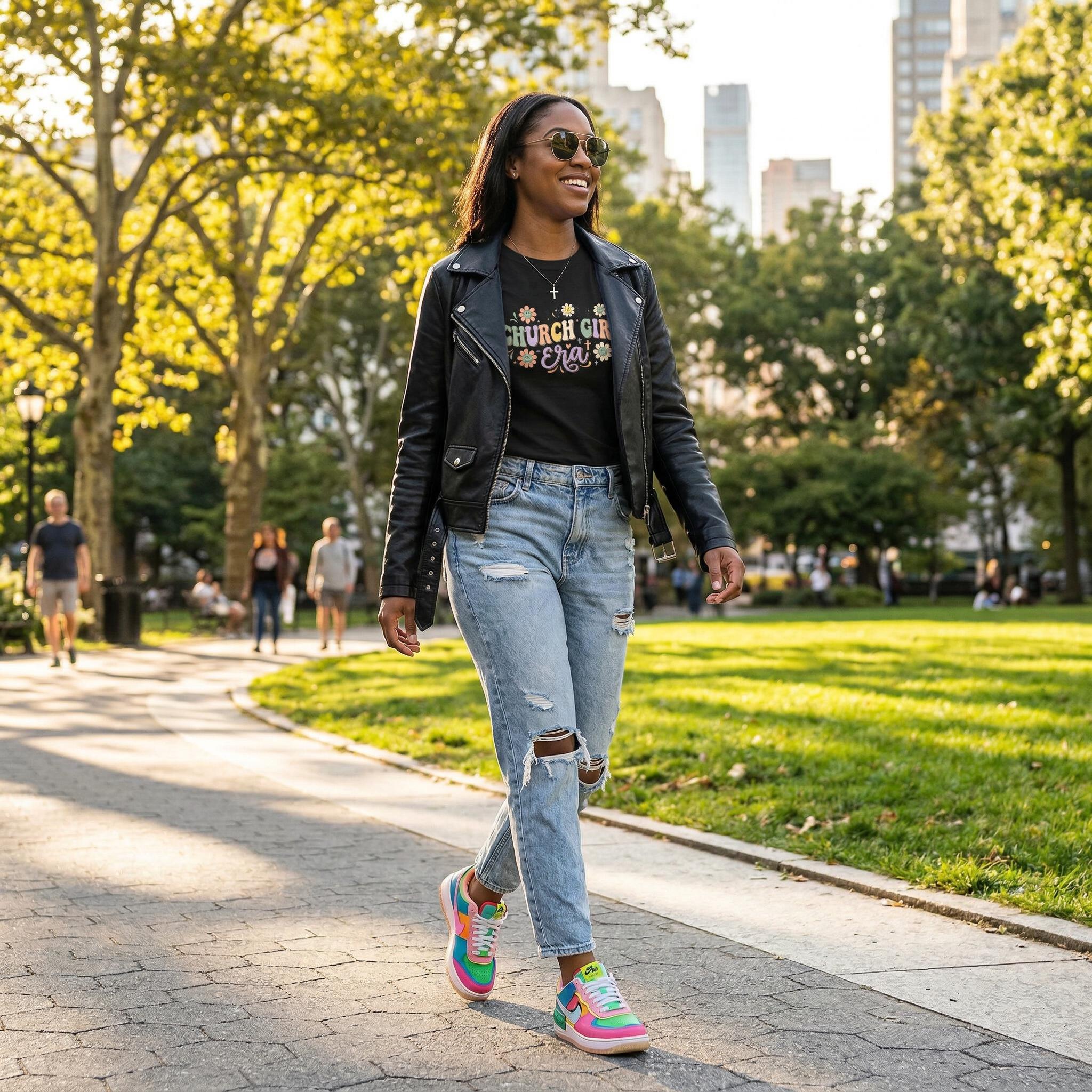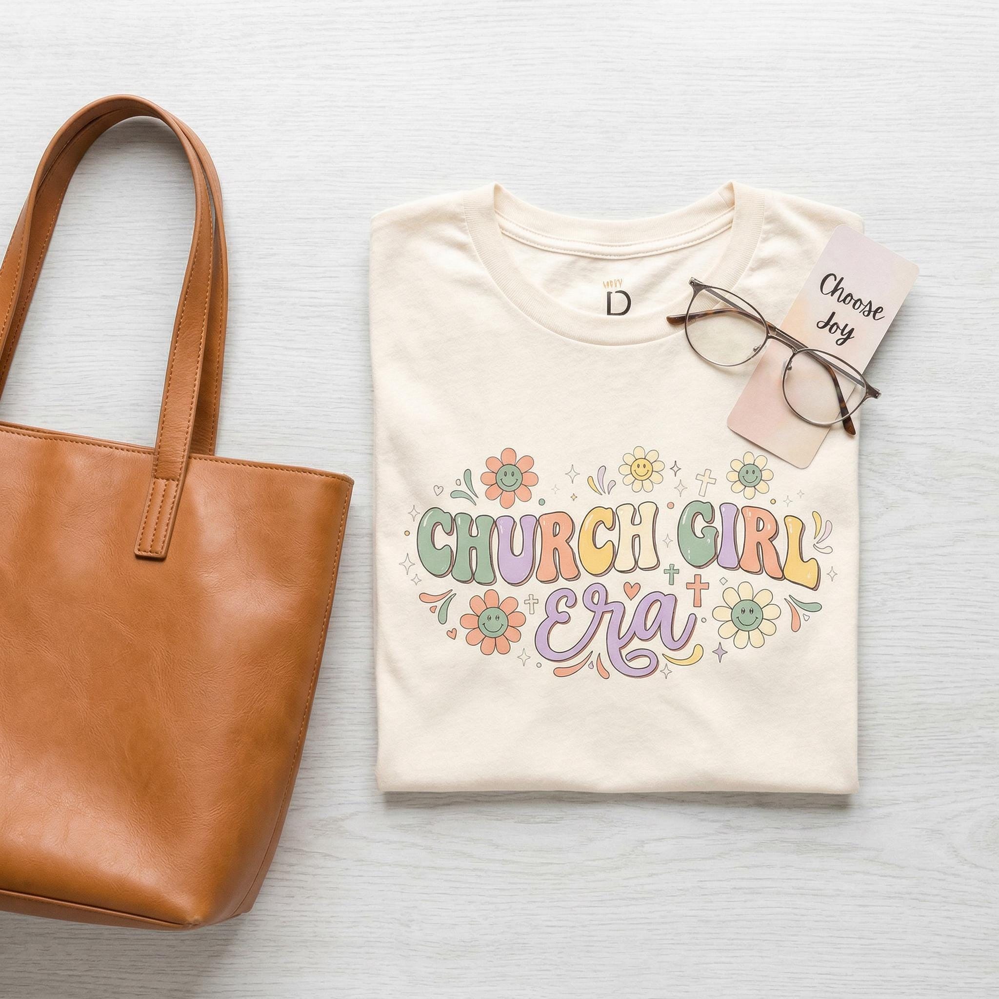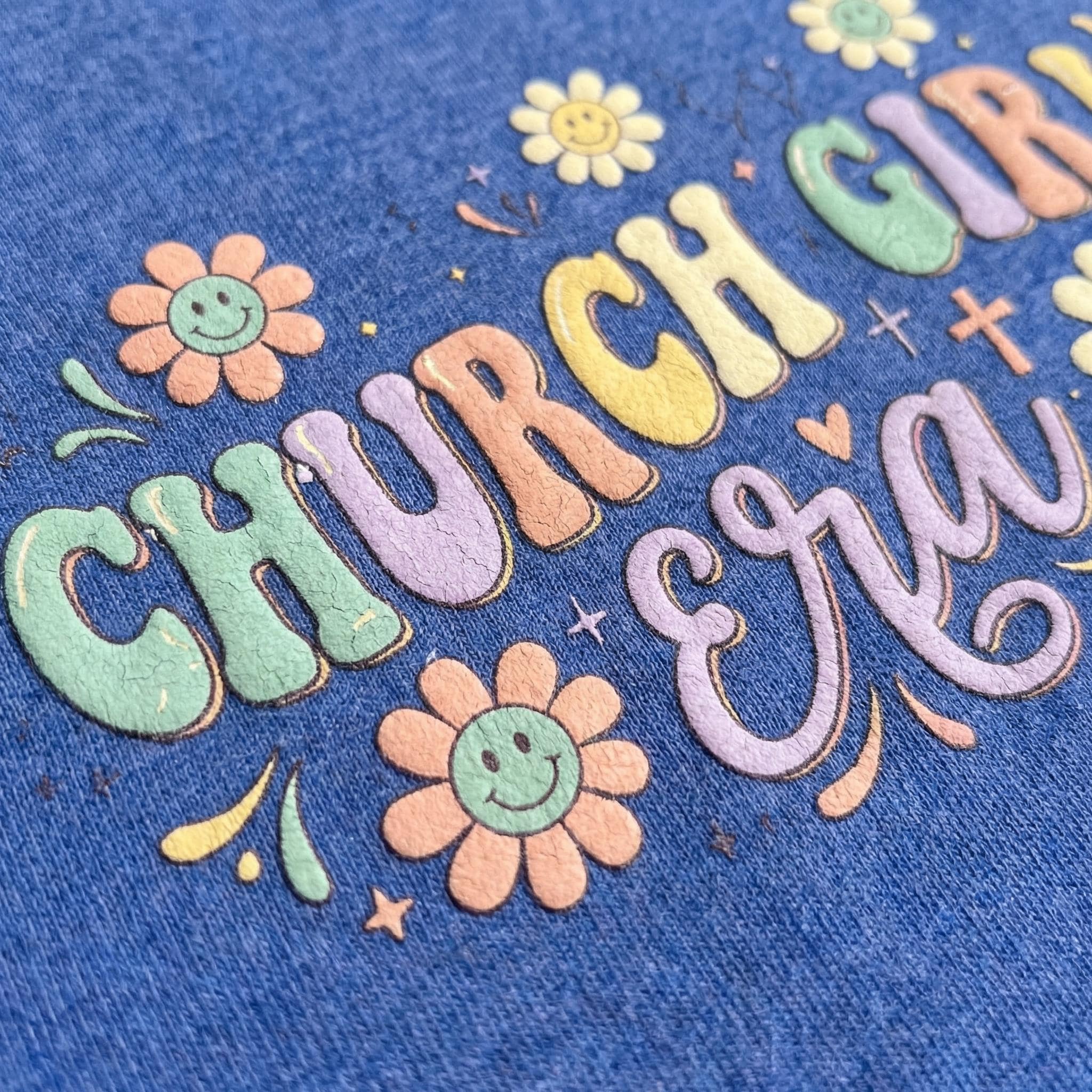 The Design: High-definition, full-color groovy floral print featuring pastel "CHURCH GIRL Era" typography.