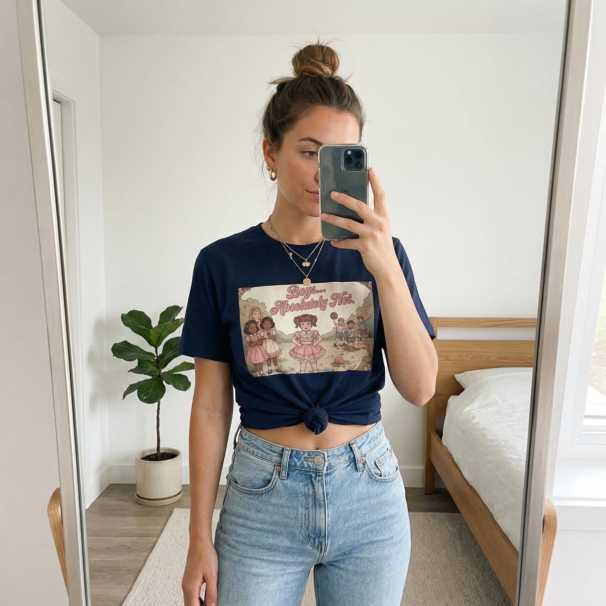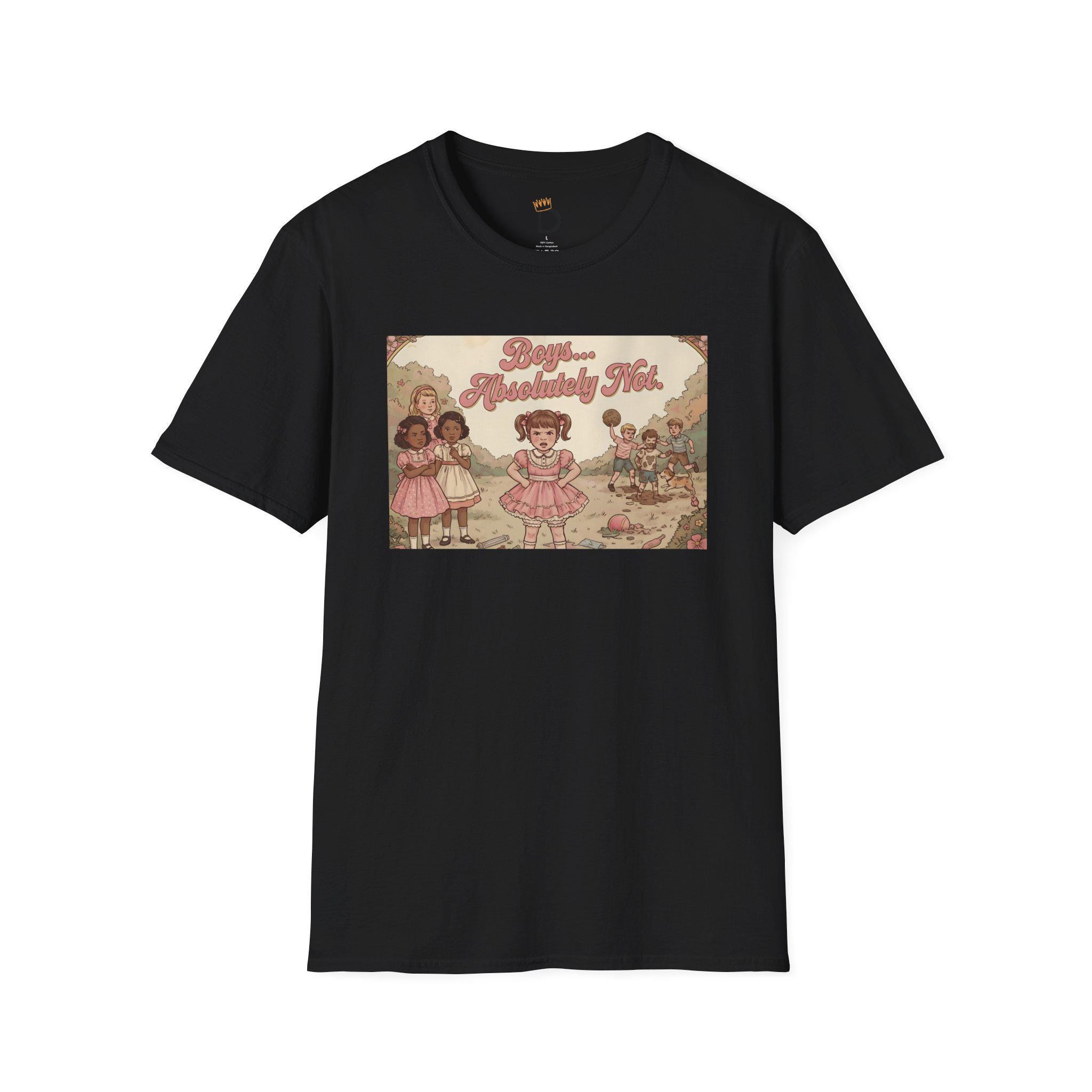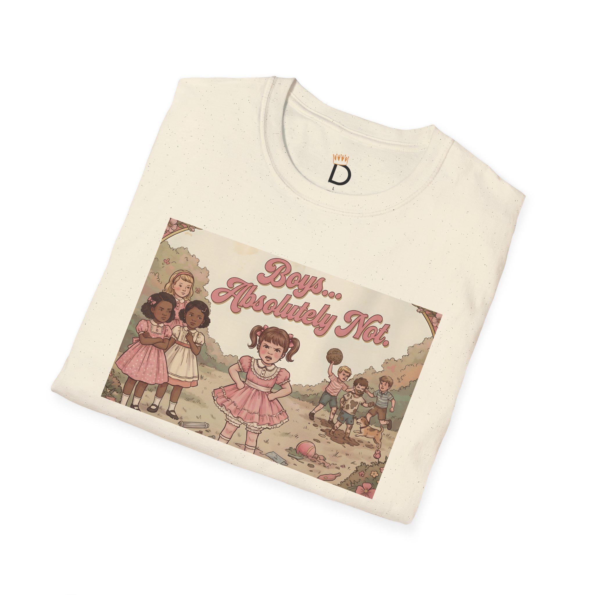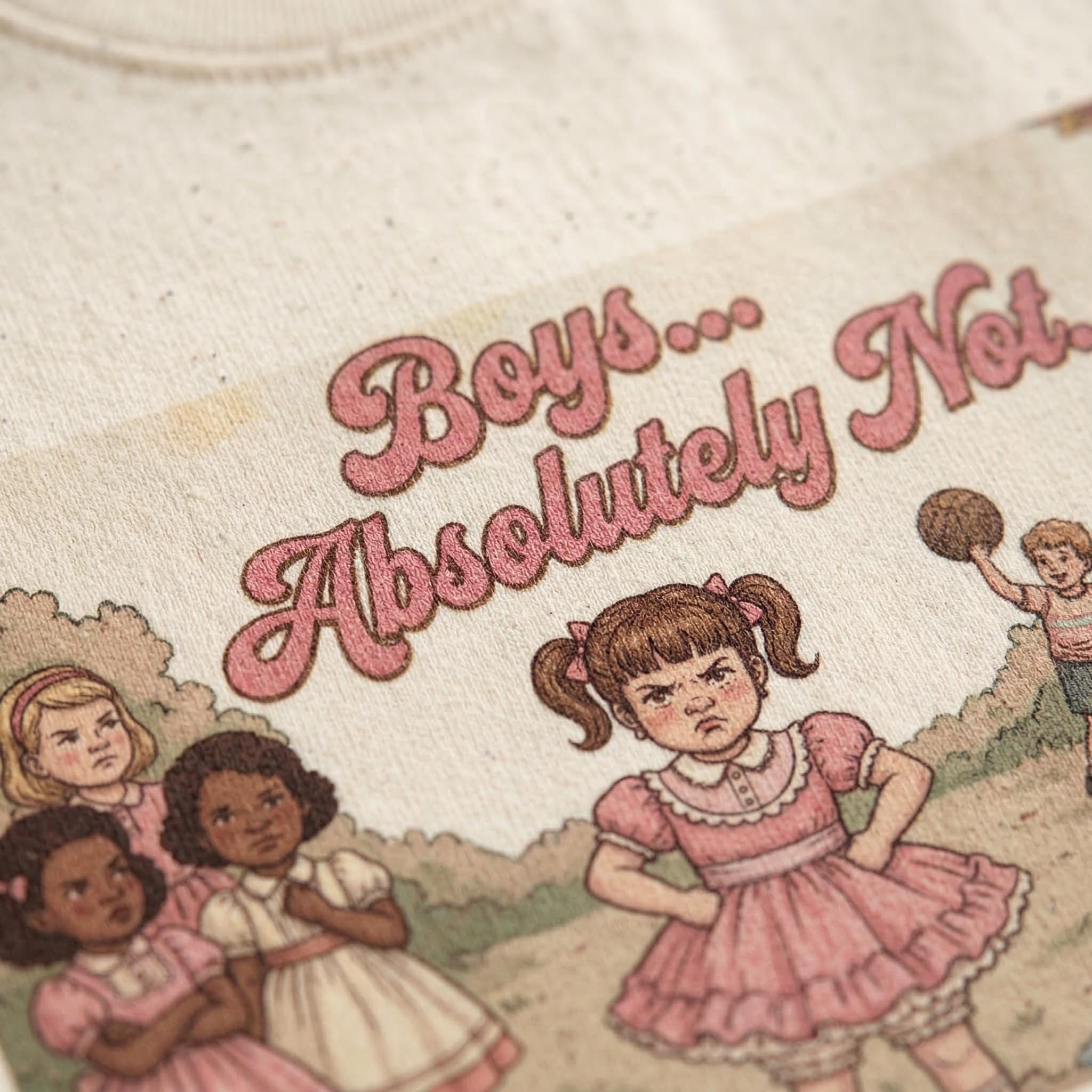 Bring a touch of vintage flair and a lot of attitude to your wardrobe. Our "Boys... Absolutely Not." tee features a beautifully detailed, mid-century inspired illustration of girls reclaiming their space in the park while the boys cause chaos in the background. It’s the perfect blend of nostalgia and empowerment for anyone who knows exactly where they stand.