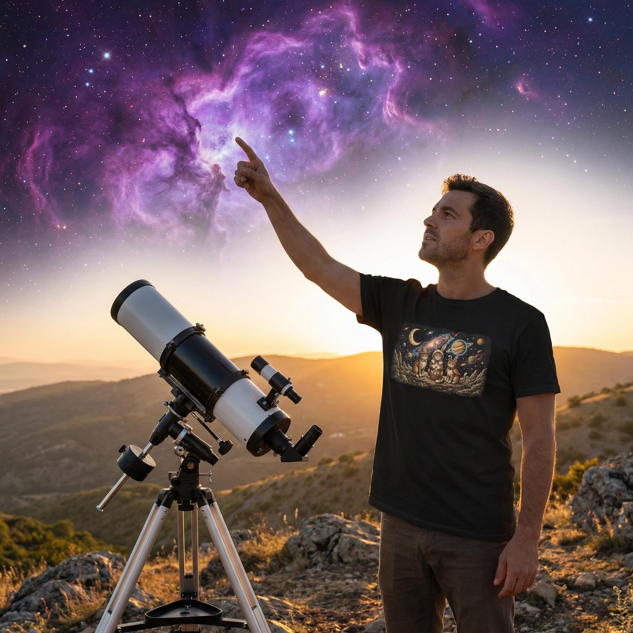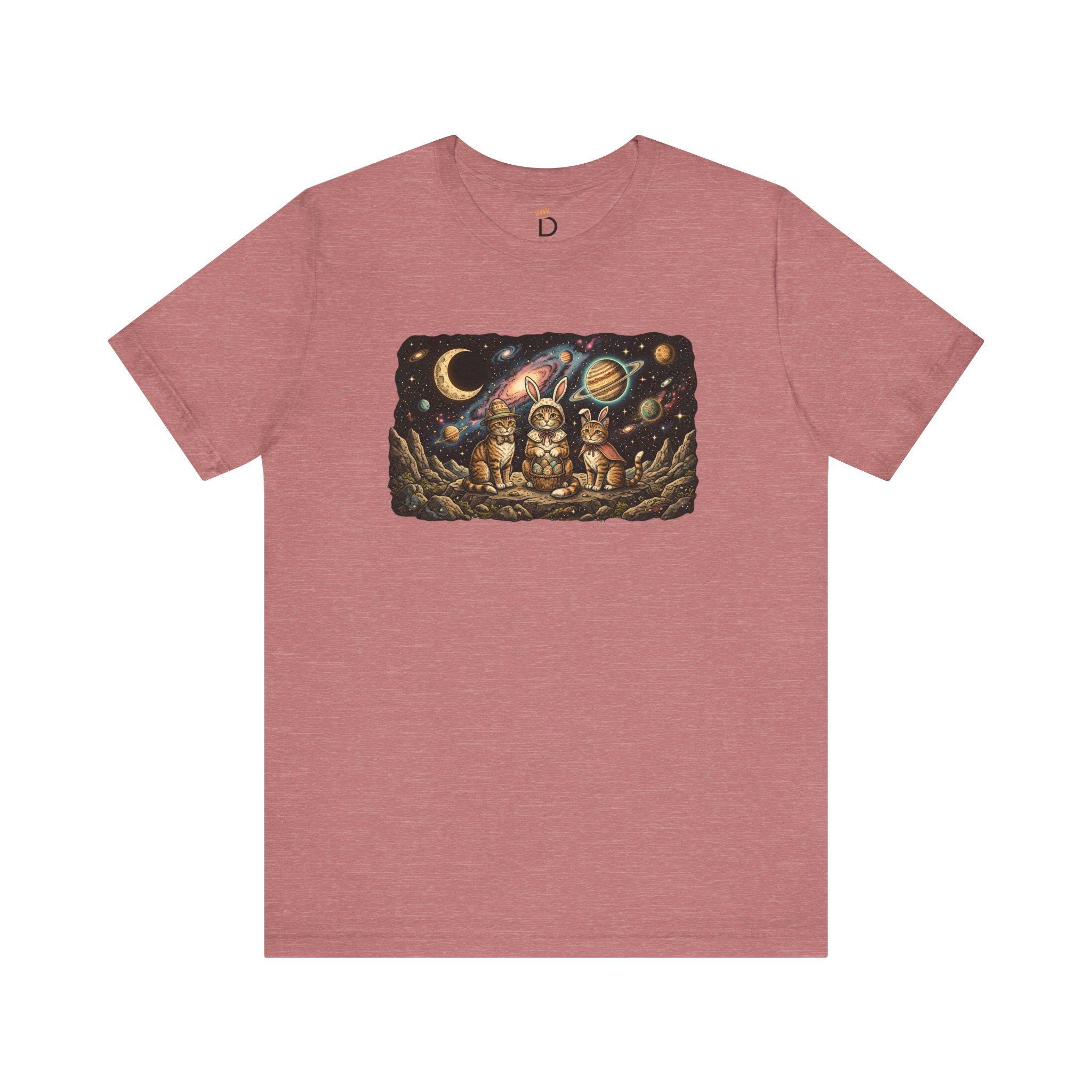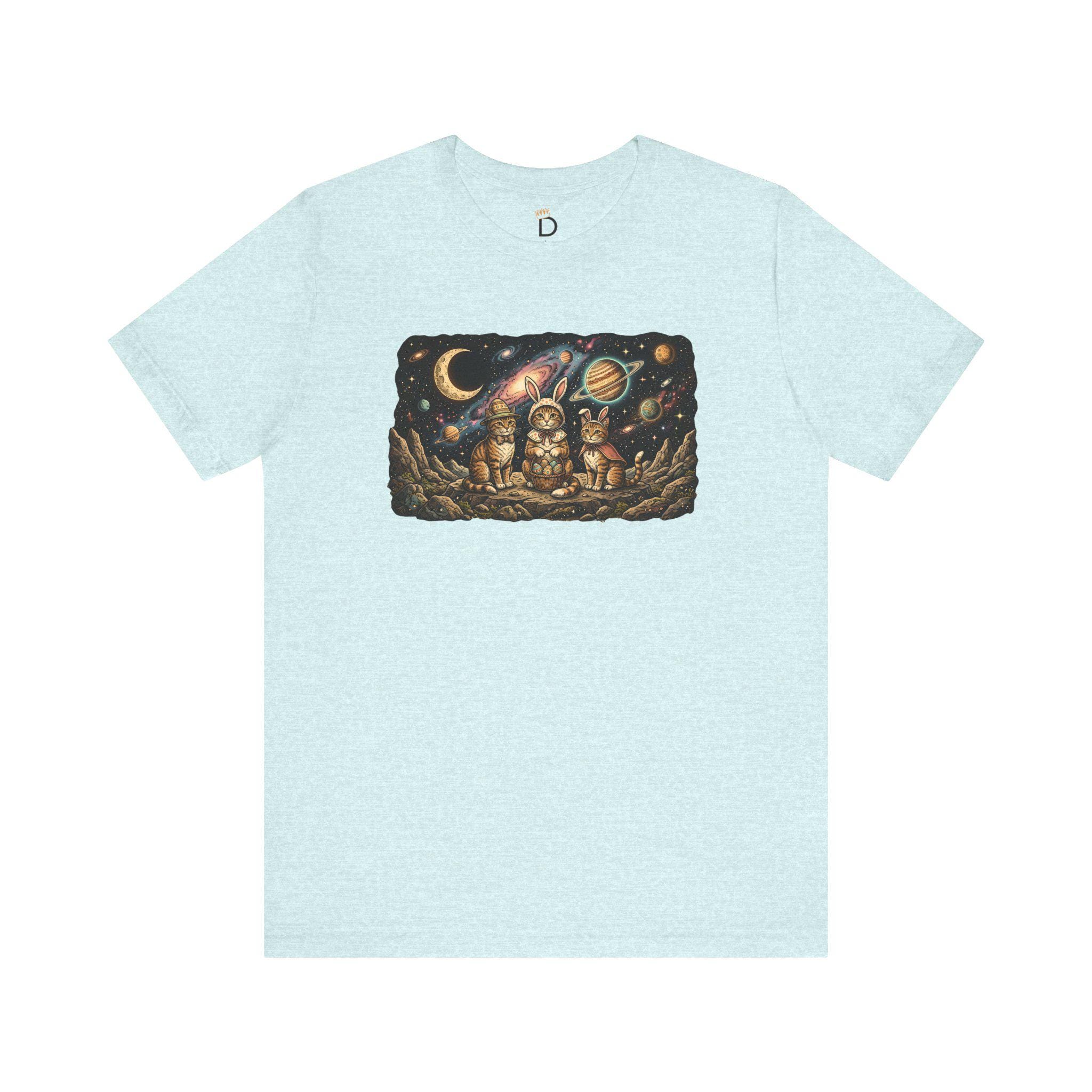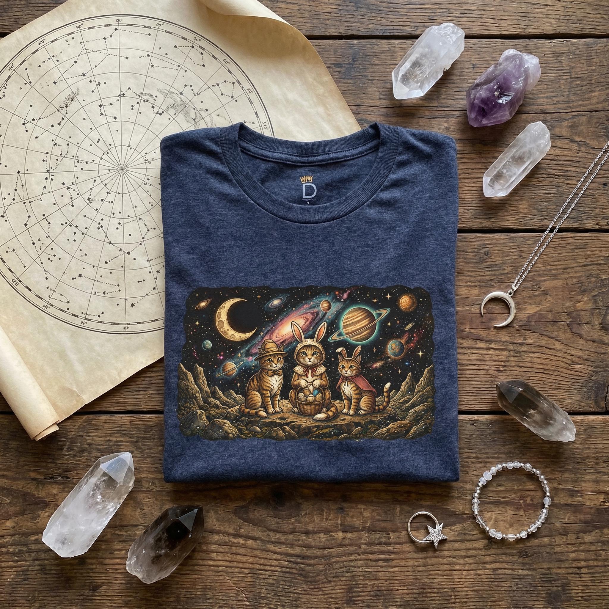 Why stay grounded when you can celebrate among the stars? Our "Cosmic Easter" tee features a high-detail illustration of three space-faring kittens in their finest bunny costumes, sitting on a rocky asteroid with their basket of interstellar eggs. With a vivid background of a purple nebula and a ringed Saturn-like planet, this design captures the magic of the universe and the sweetness of the season.