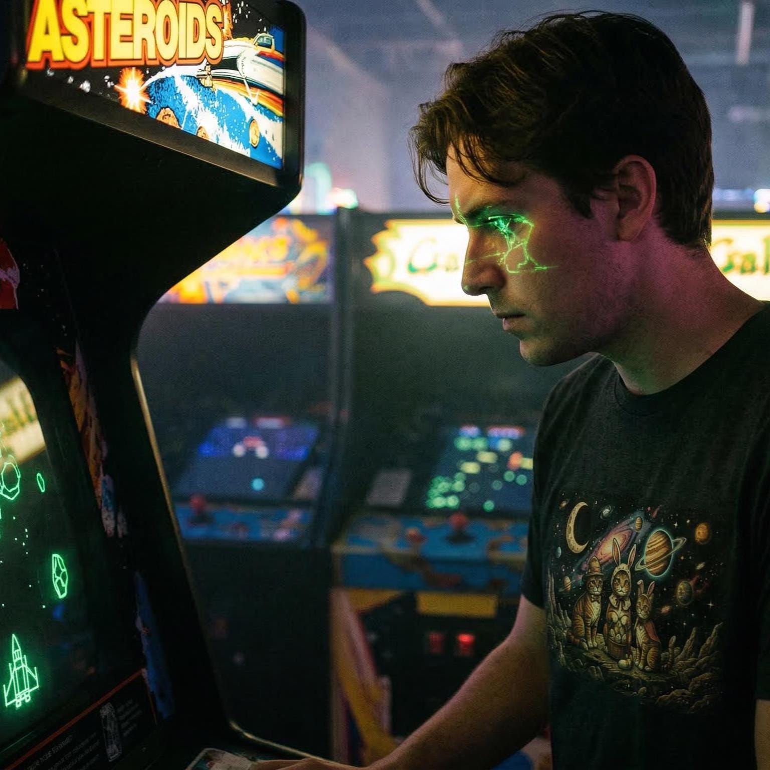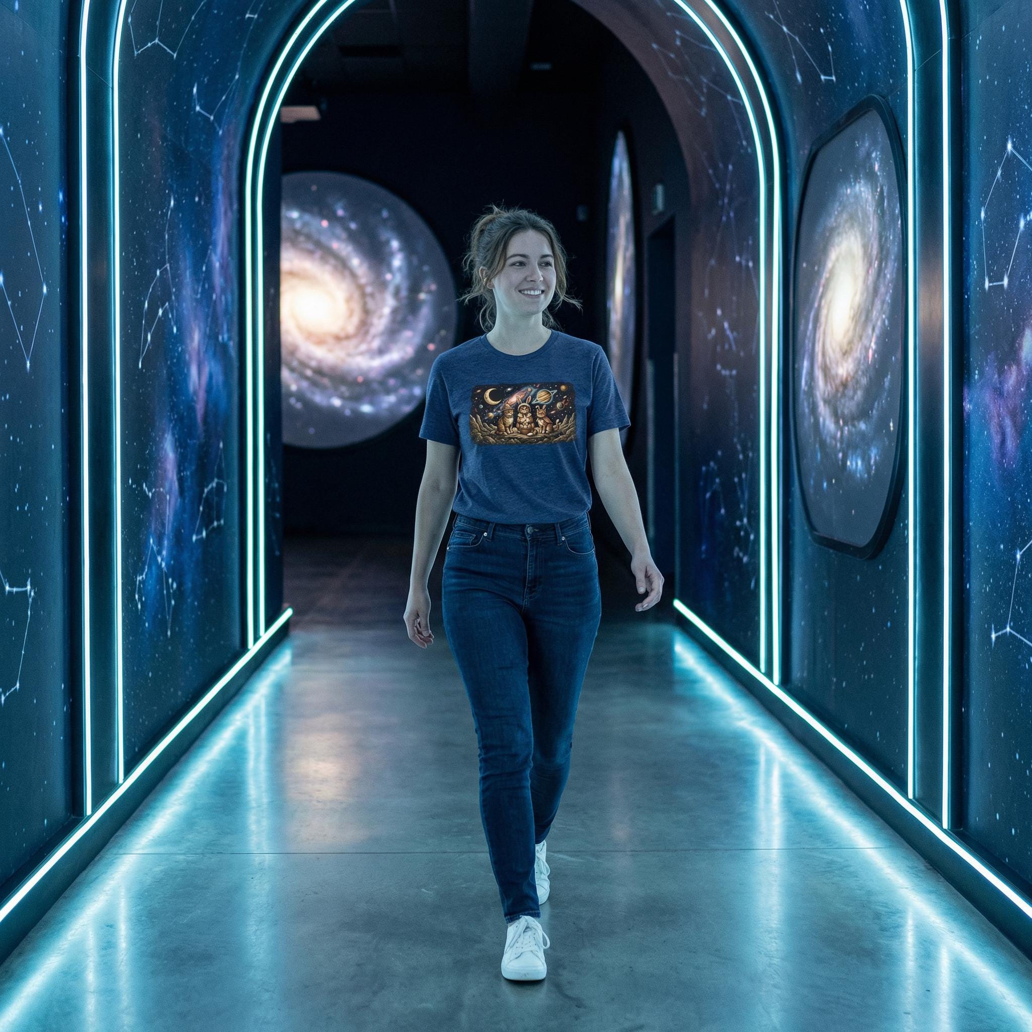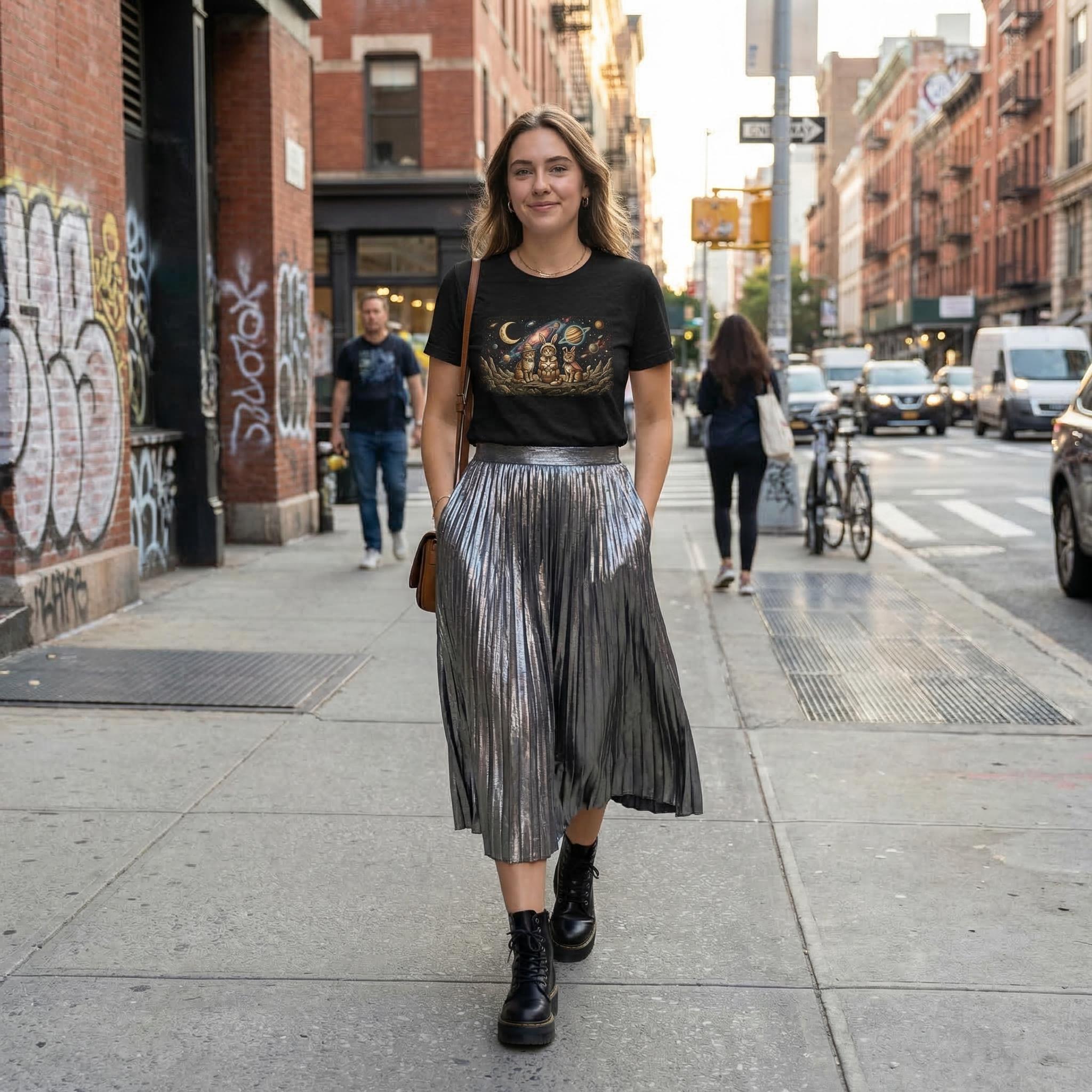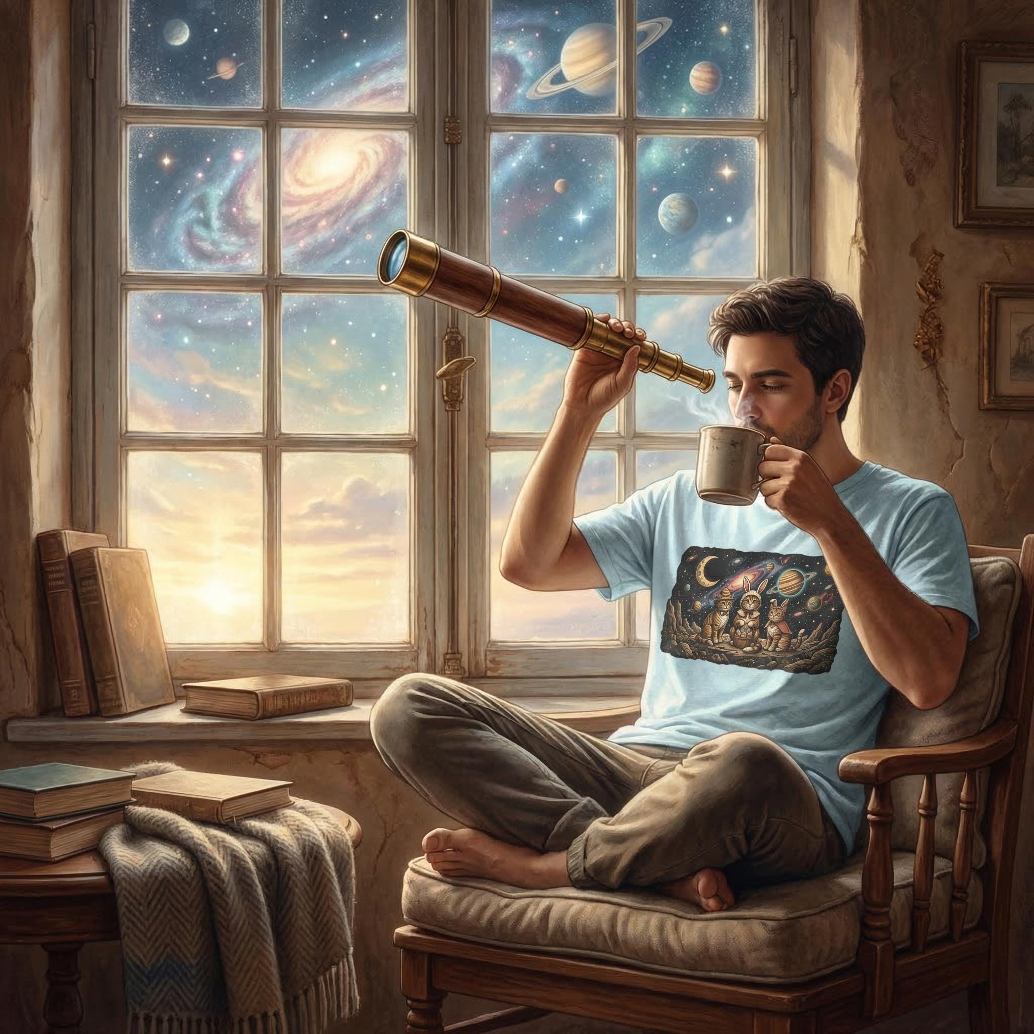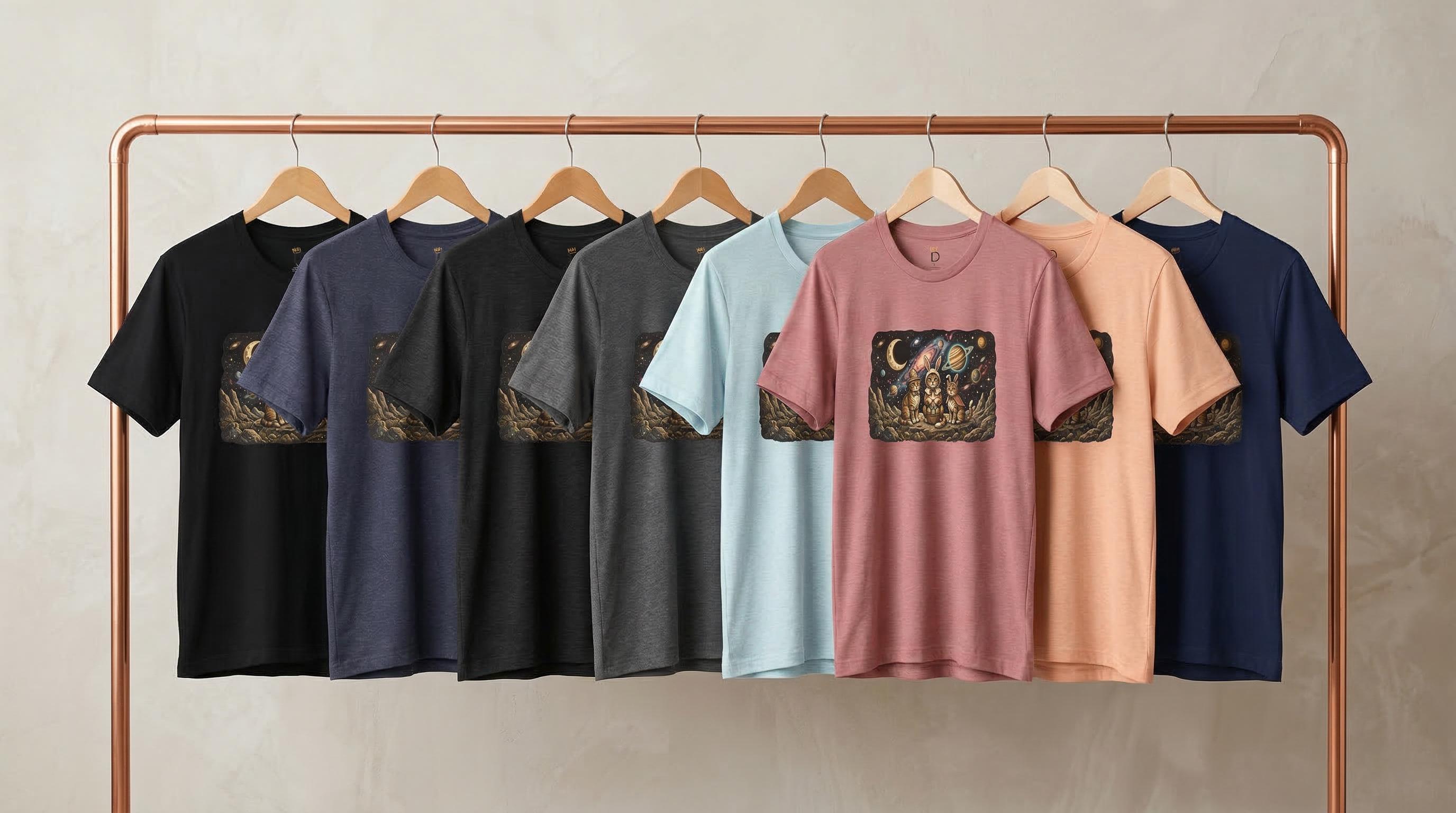 Why stay grounded when you can celebrate among the stars? Our "Cosmic Easter" tee features a high-detail illustration of three space-faring kittens in their finest bunny costumes, sitting on a rocky asteroid with their basket of interstellar eggs. With a vivid background of a purple nebula and a ringed Saturn-like planet, this design captures the magic of the universe and the sweetness of the season.