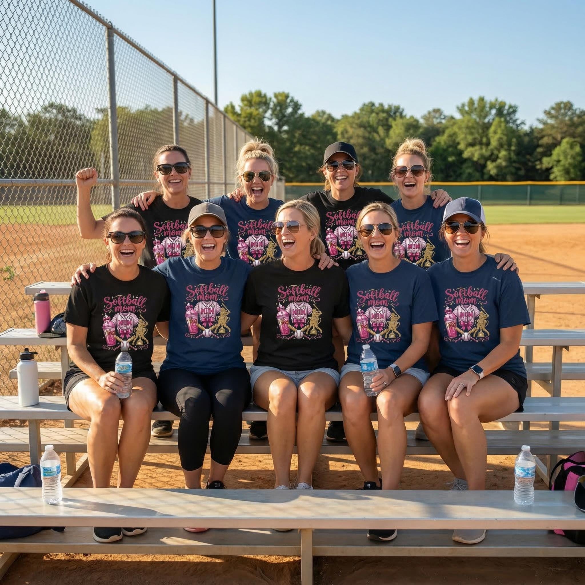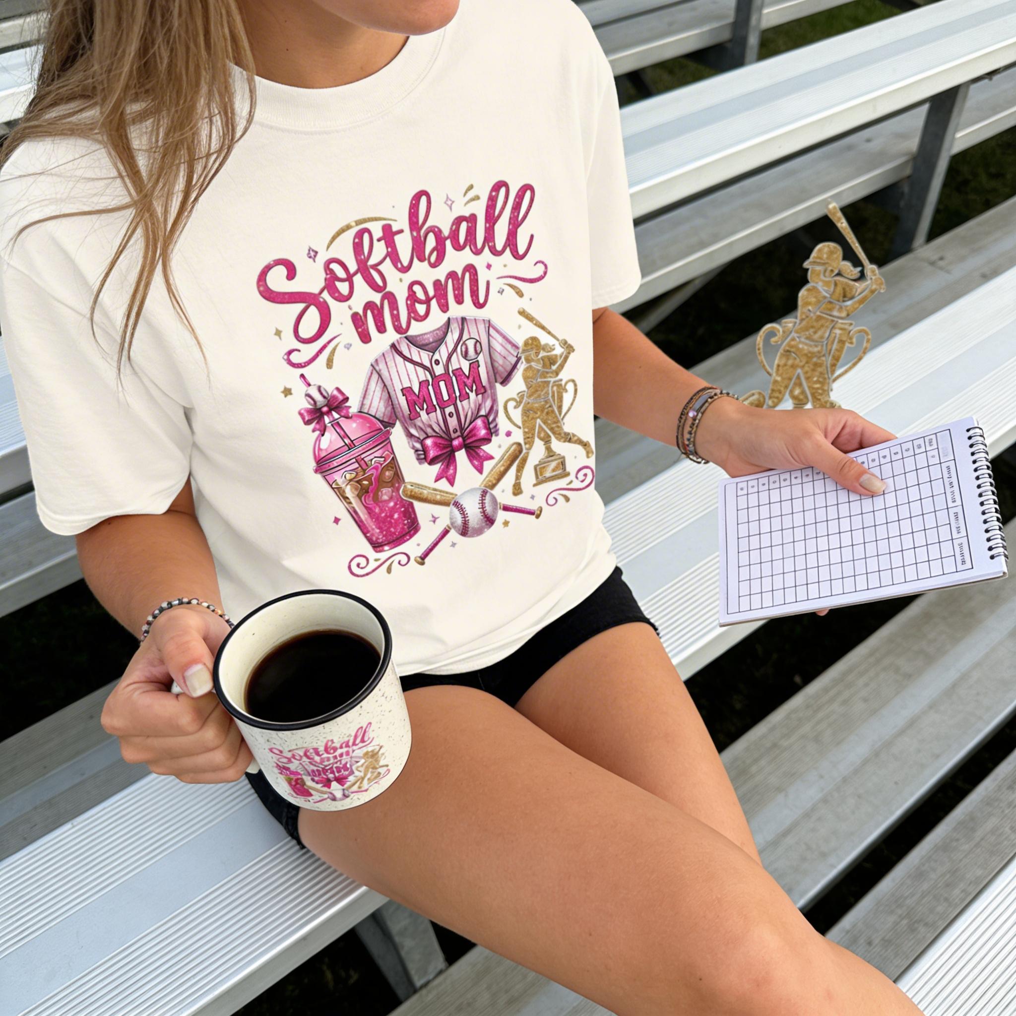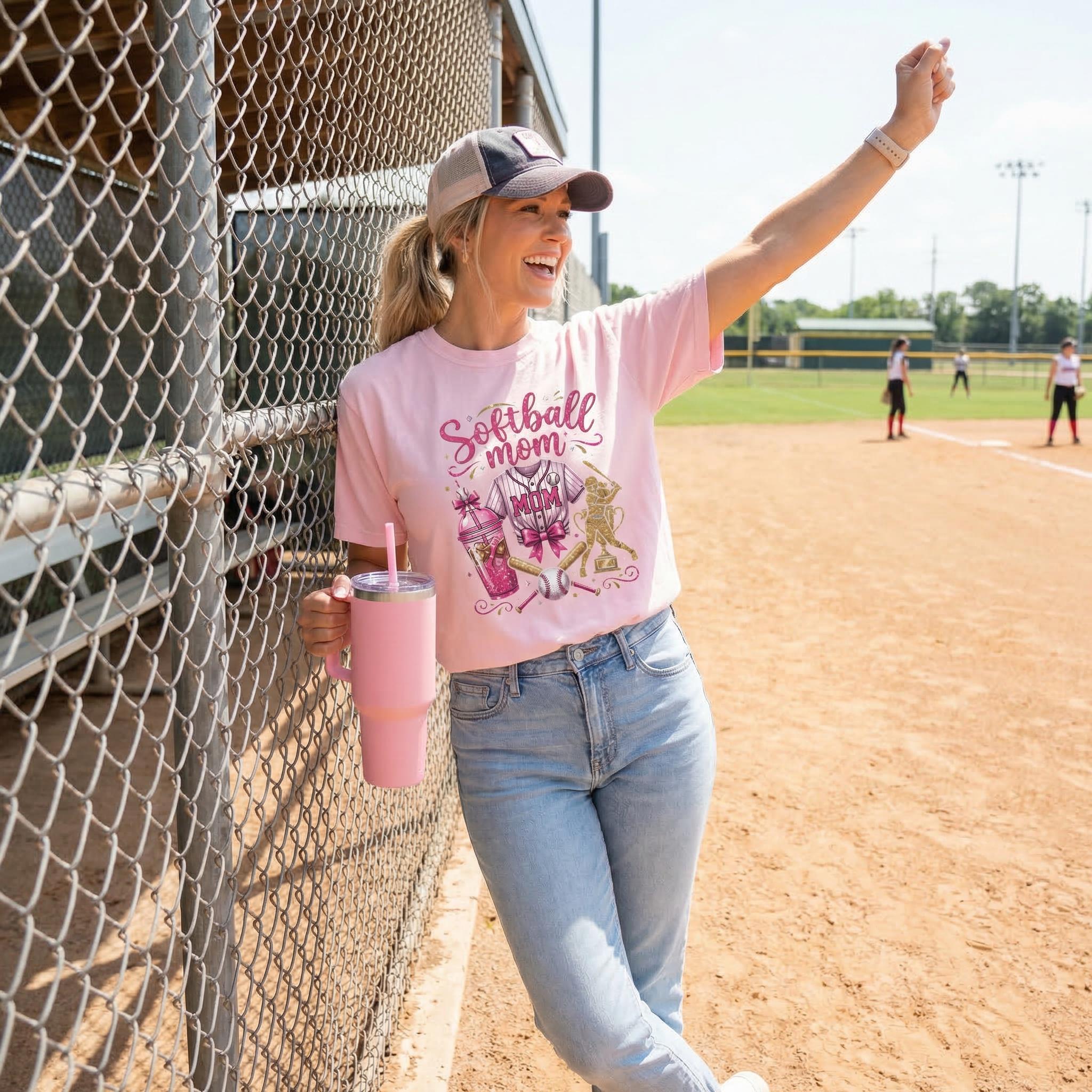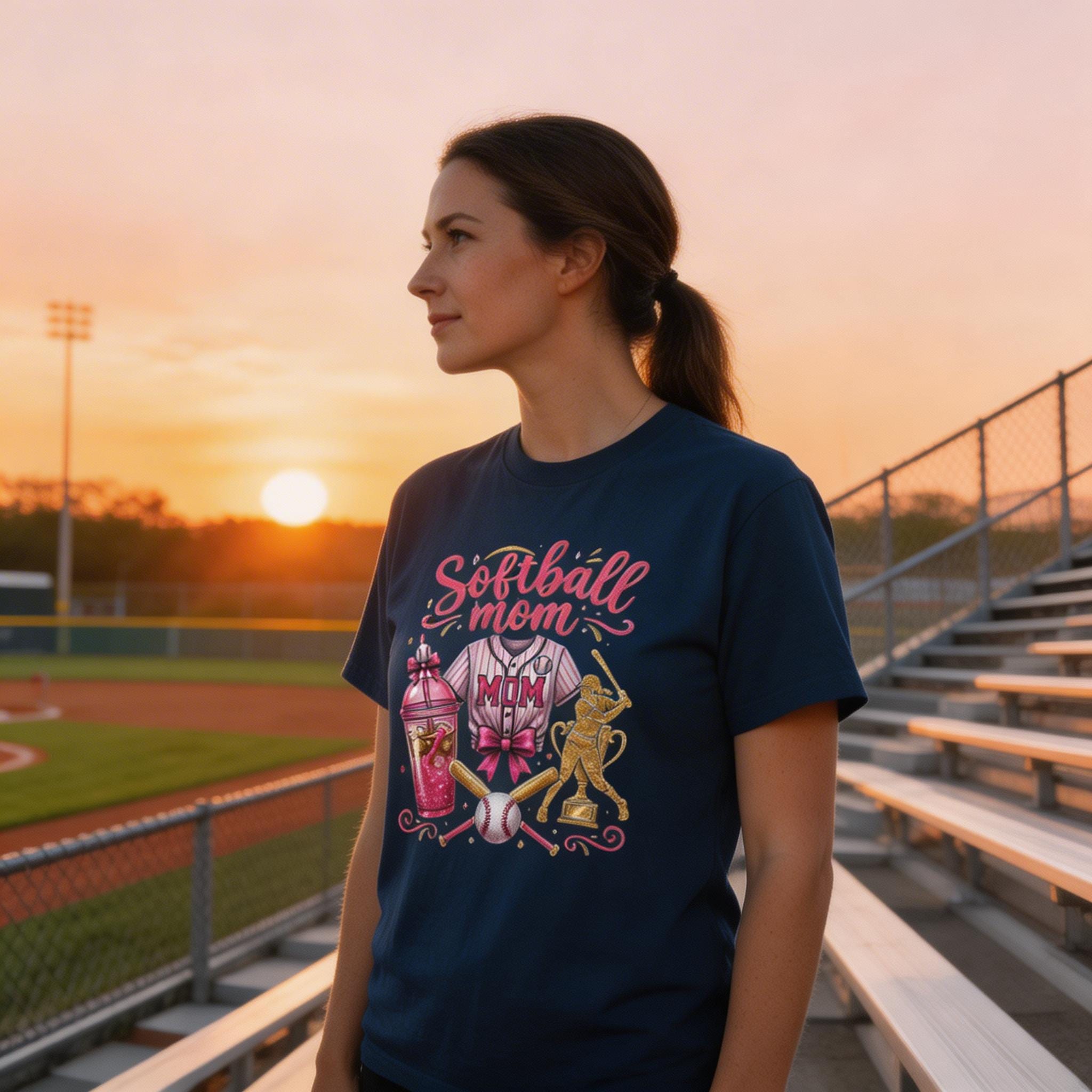 Elevate your bleacher style with our "Sparkle Softball Mom" tee. Designed for the mom who brings the energy to every inning, this shirt features vibrant, glitter-textured icons including a game-ready tumbler, pinstripe jersey, and victory trophy. Whether you're at a weekend tournament or a weeknight practice, this tee keeps you comfortable and stylish.