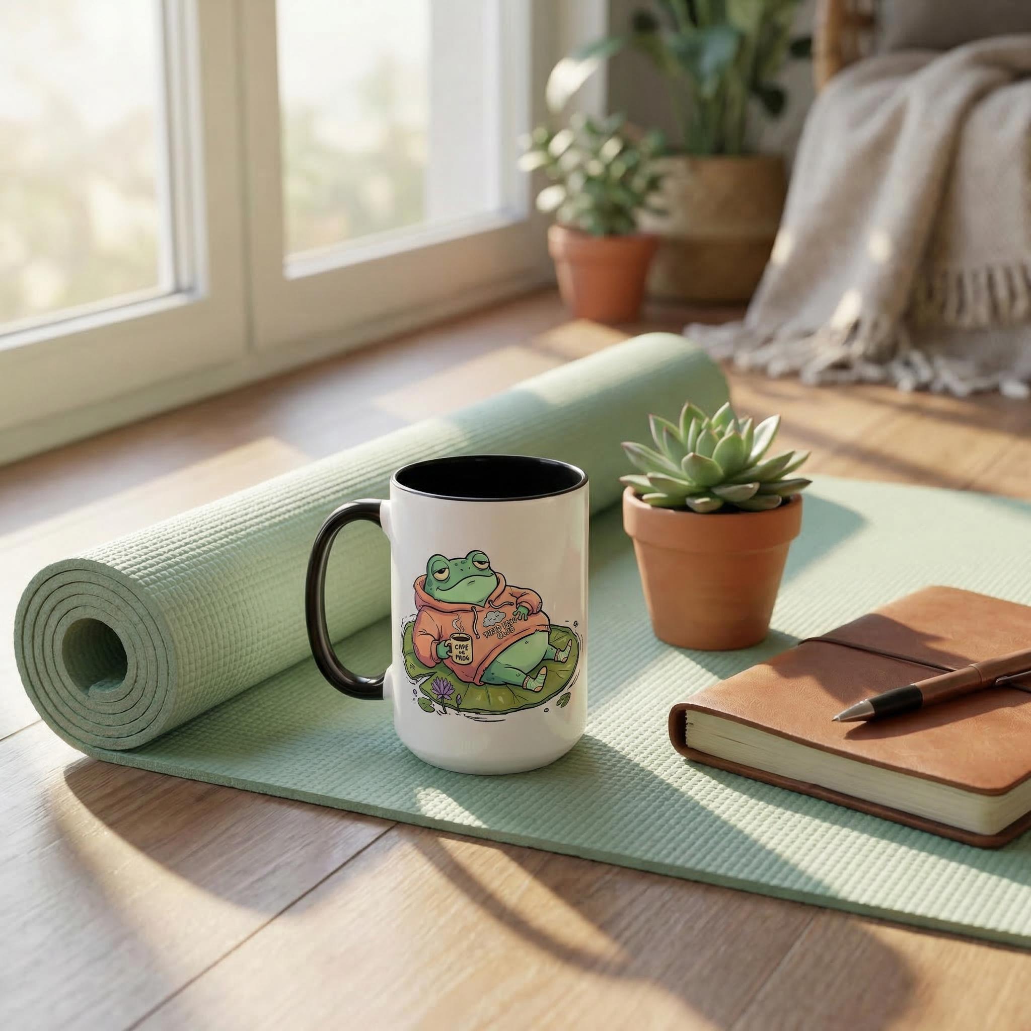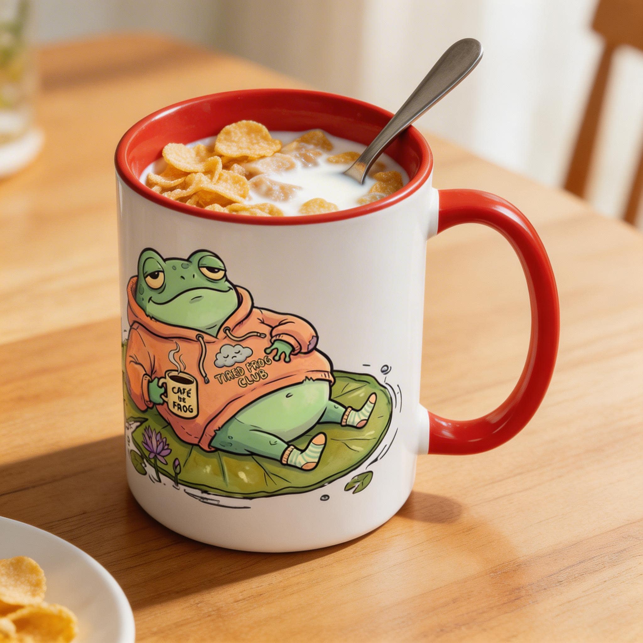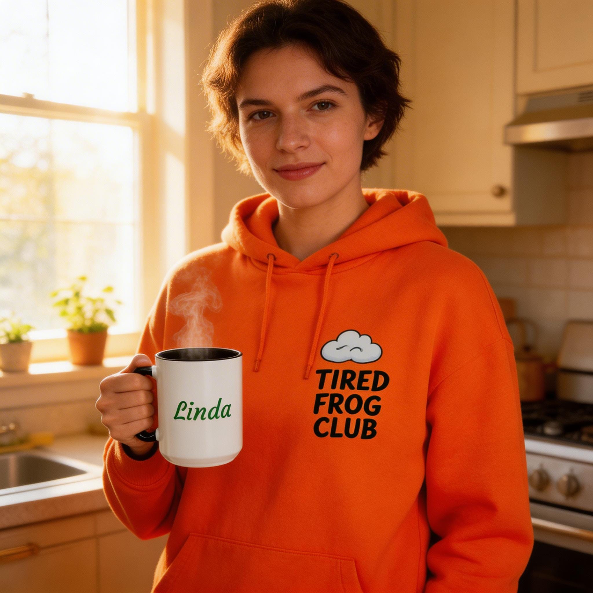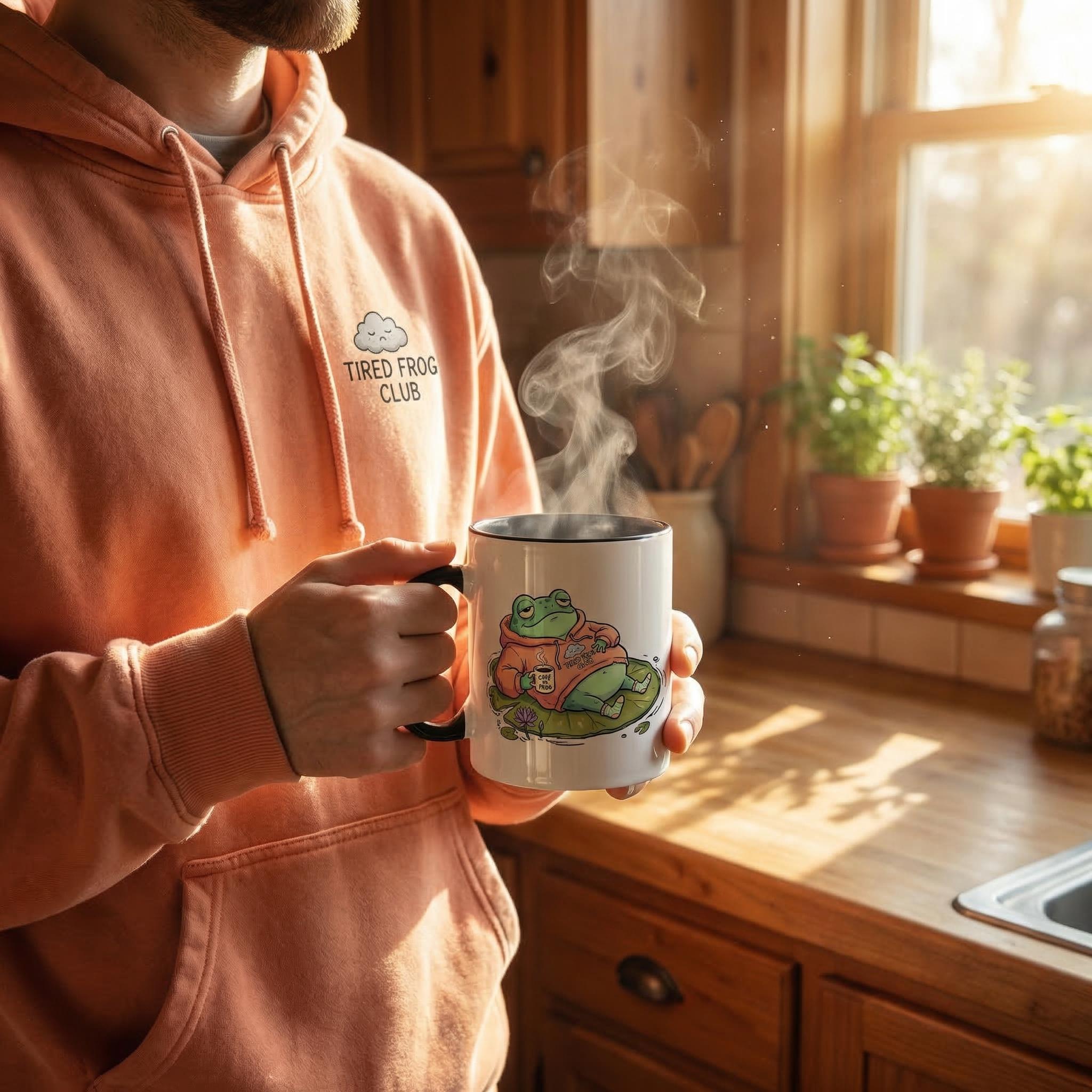 Join the club that understands the struggle of the 7:00 AM alarm. Our "Tired Frog Club" mug features a sleepy, hoodie-wearing frog who is doing his absolute best. Now available with 9 different accent colors for the handle and interior, you can customize your cup to match your style—or the frog’s orange hoodie!