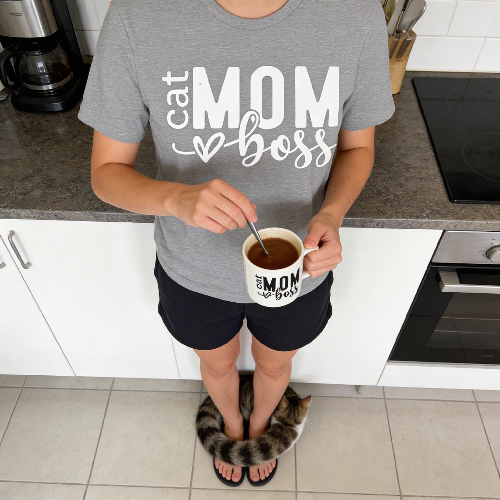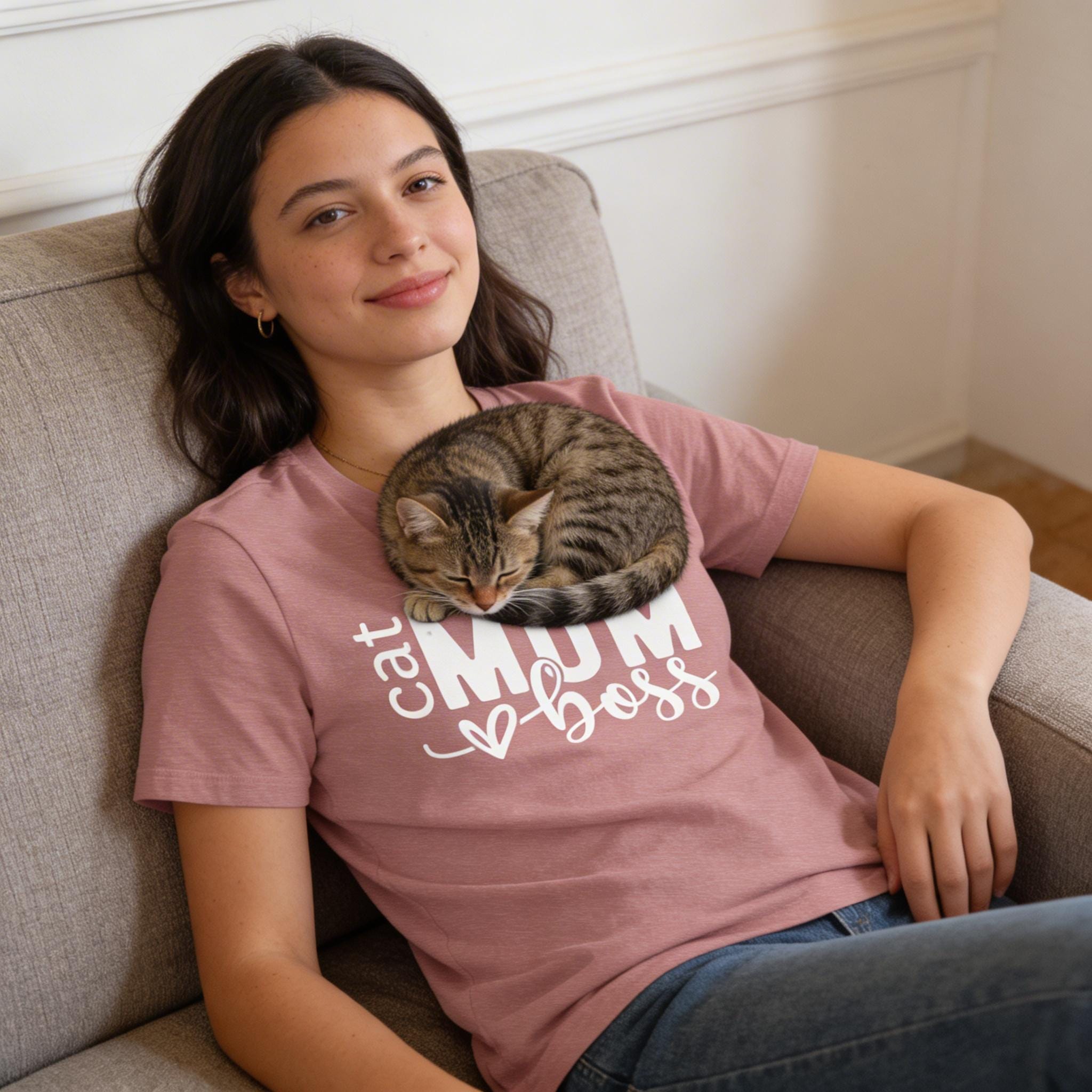 Lightweight, lived-in comfort with a little attitude for anyone who runs a household of whiskers. This soft jersey tee drapes casually over mornings filled with slow stretches, sunlit windows, and the urgent demand of four paws at breakfast. The bold, handwritten-style print reads like a wink from the sofa: cat MOM boss — confident, cozy, and a little playful. Wear it while topping up the water bowl, curled with a novel, or out on quick errands; it layers easily under a cardigan or pairs with worn-in jeans for an effortless, homey look. Breathable fabric and a neat crew neck keep the silhouette simple so the message — and the cat cuddles — take center stage.