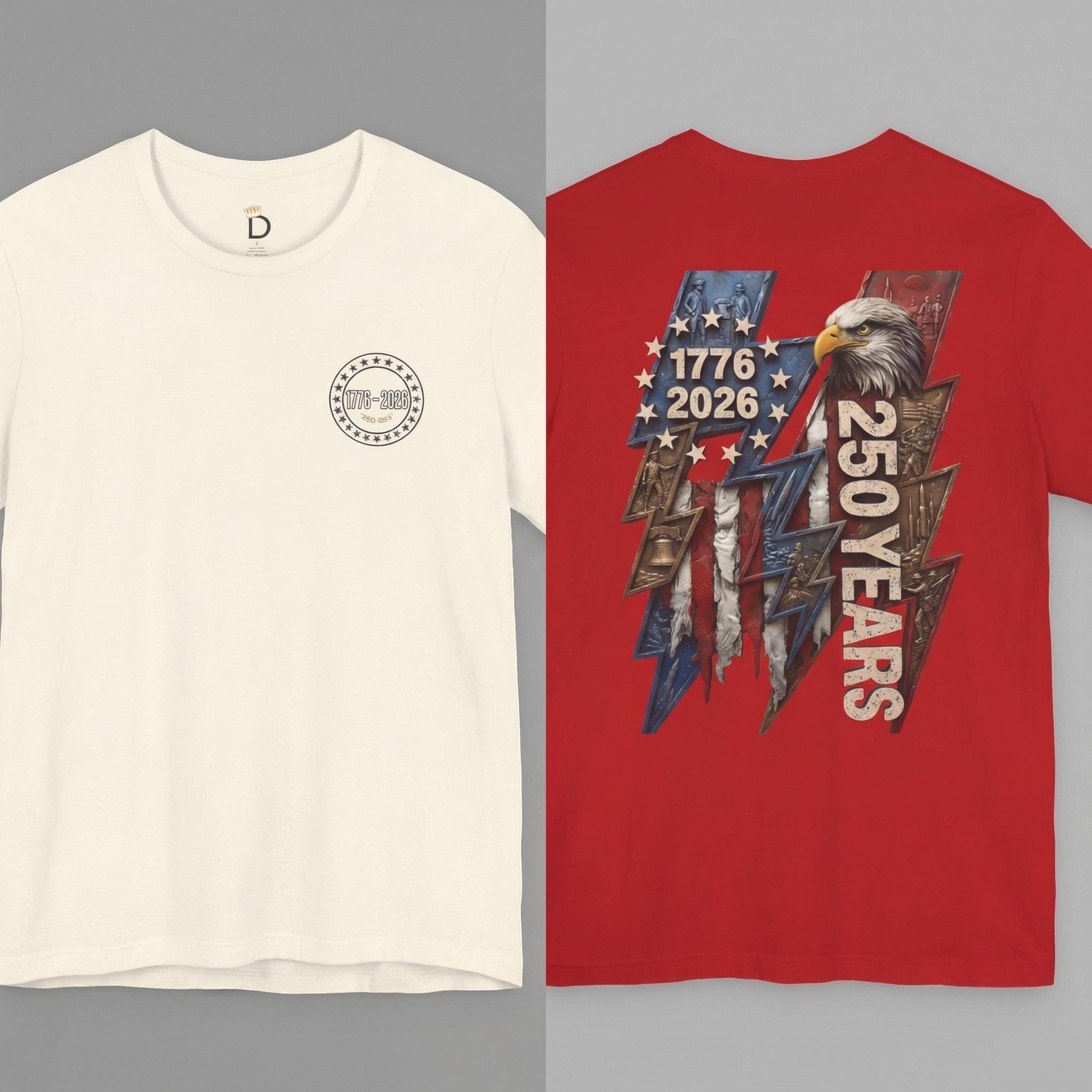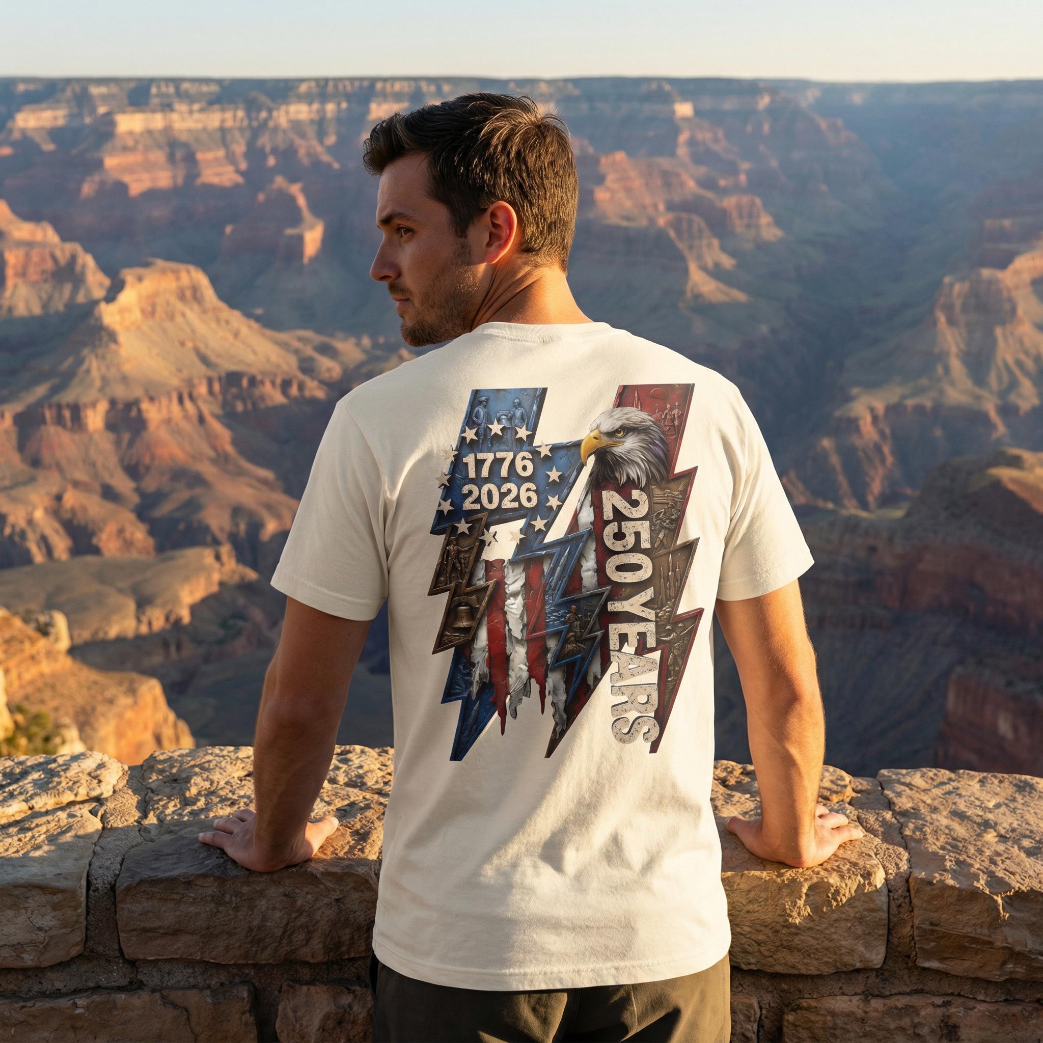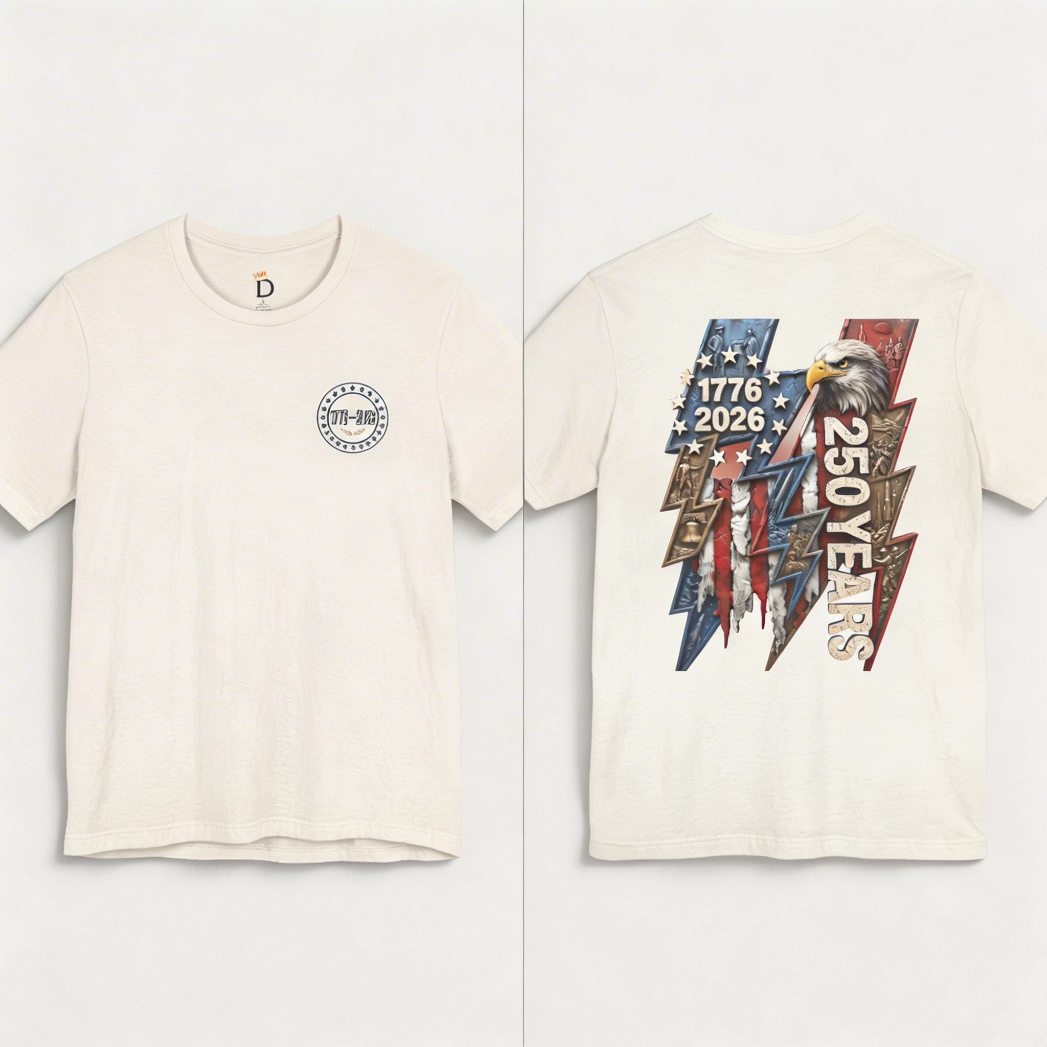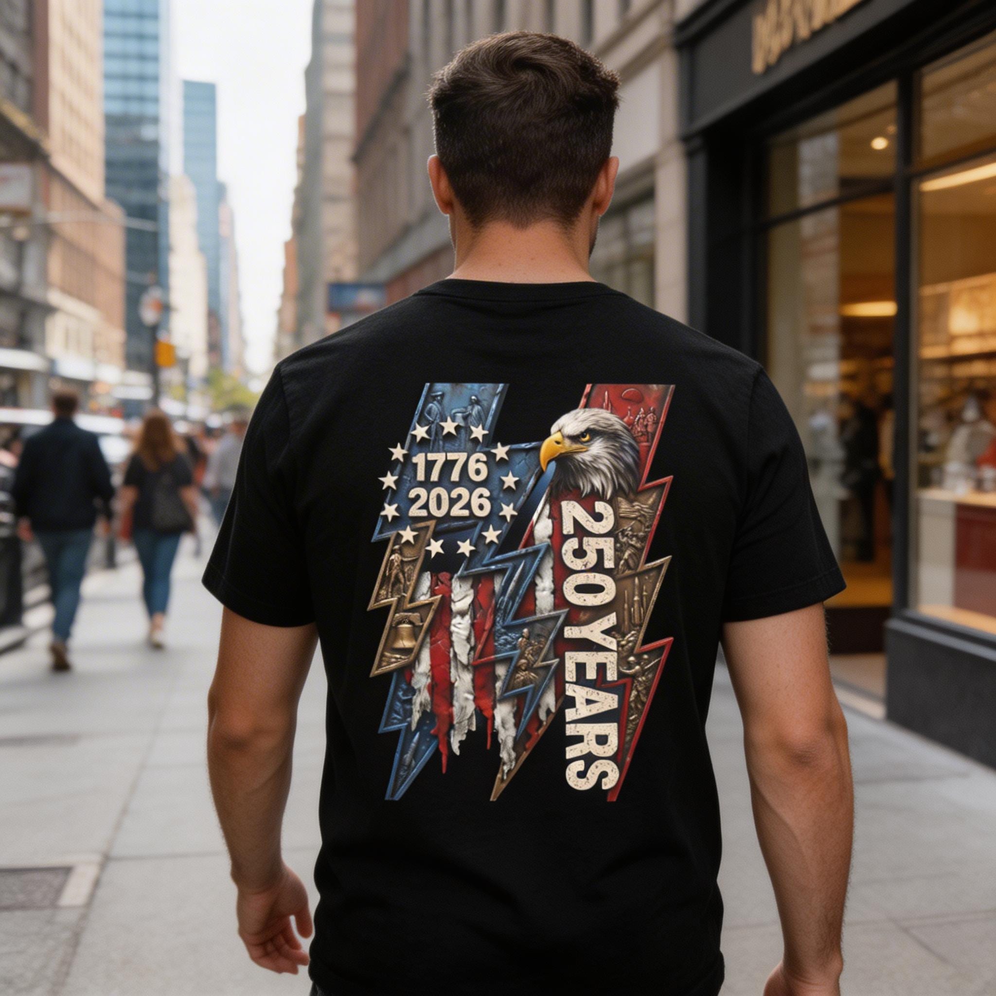 Celebrate the United States 250th Anniversary with a design that tells a story from every angle. Featuring a minimalist 1776–2026 emblem on the front chest and a powerful, multi-layered 250 Years masterpiece on the back, this is the ultimate collector’s tee for 2026.