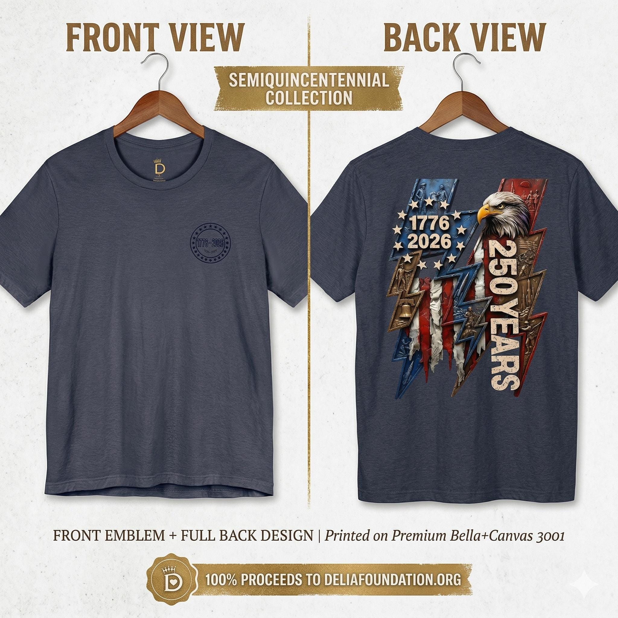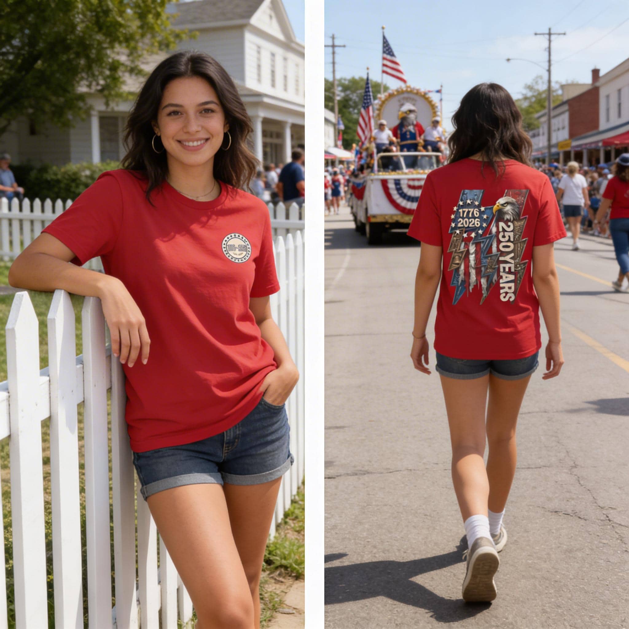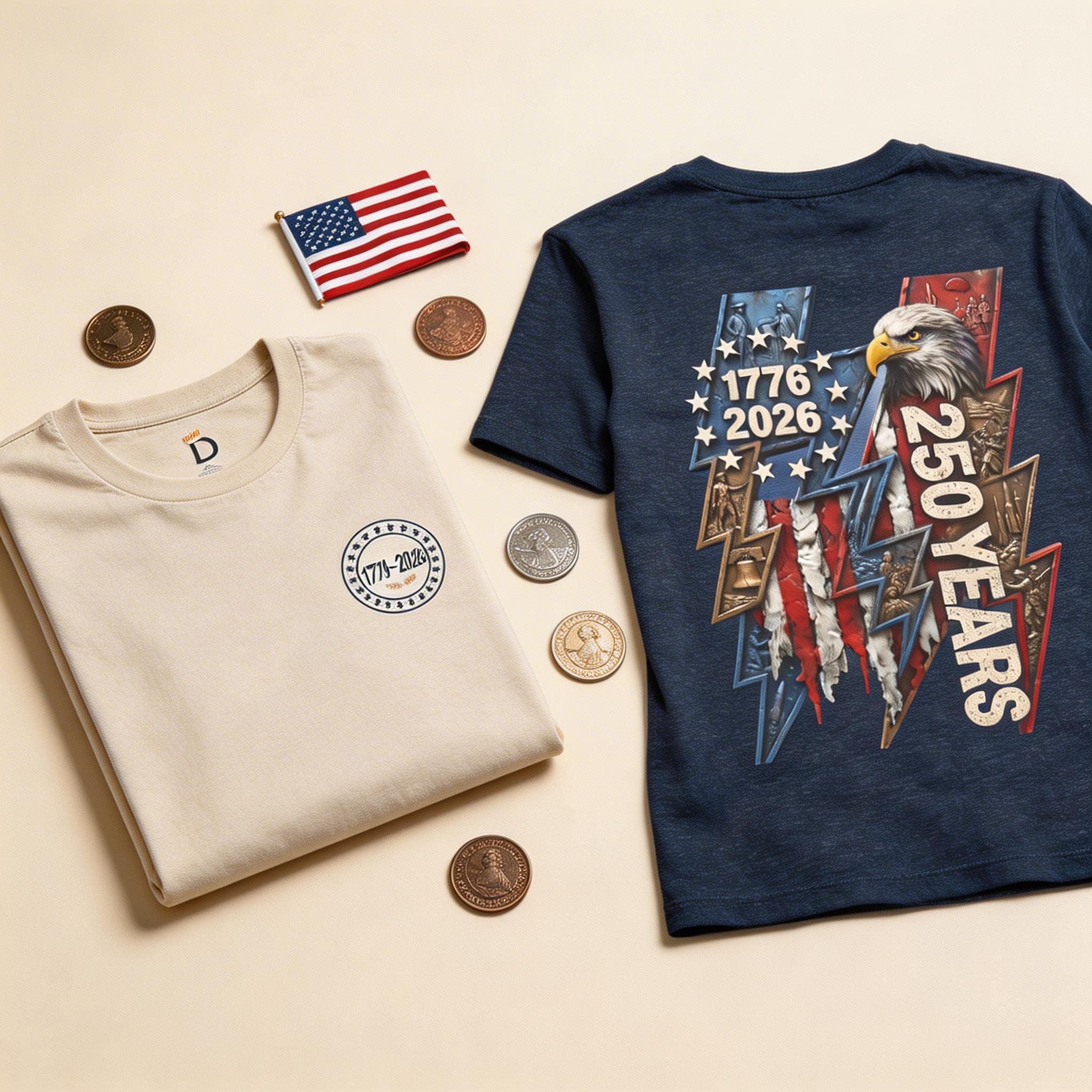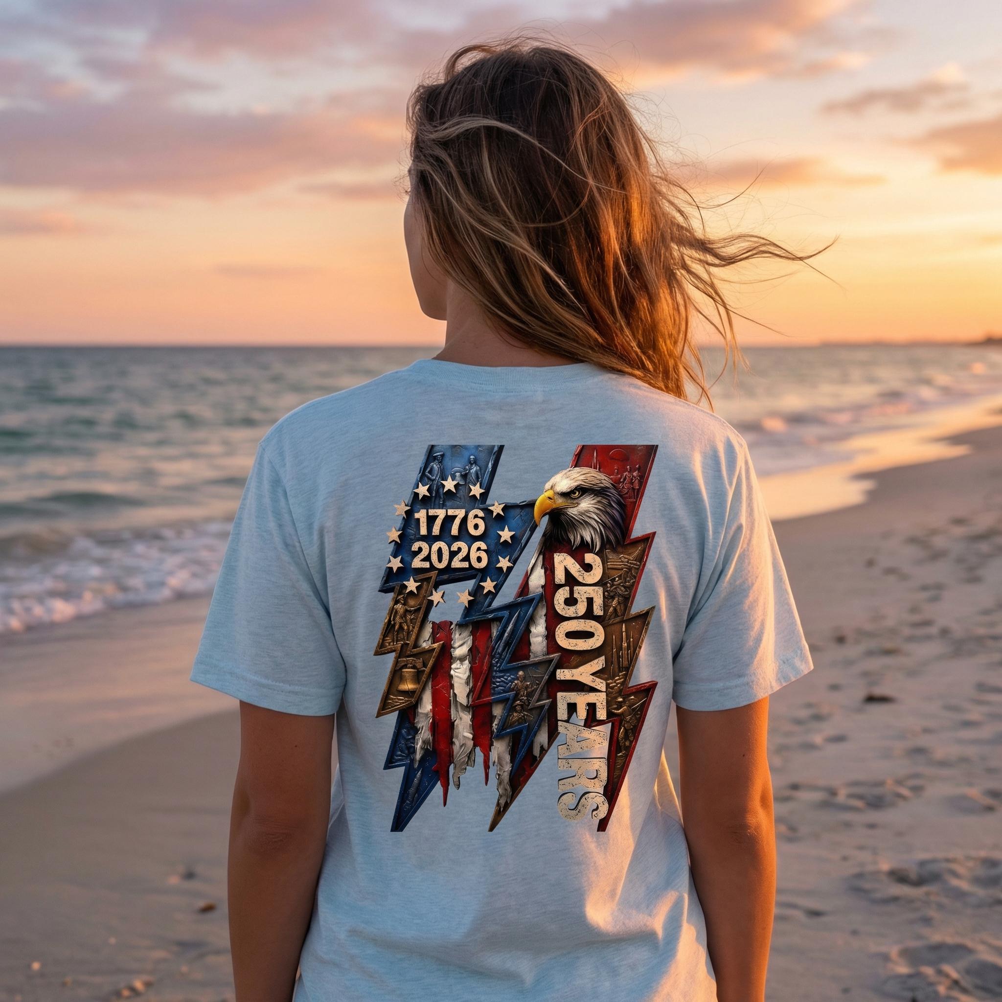 Celebrate the United States 250th Anniversary with a design that tells a story from every angle. Featuring a minimalist 1776–2026 emblem on the front chest and a powerful, multi-layered 250 Years masterpiece on the back, this is the ultimate collector’s tee for 2026.