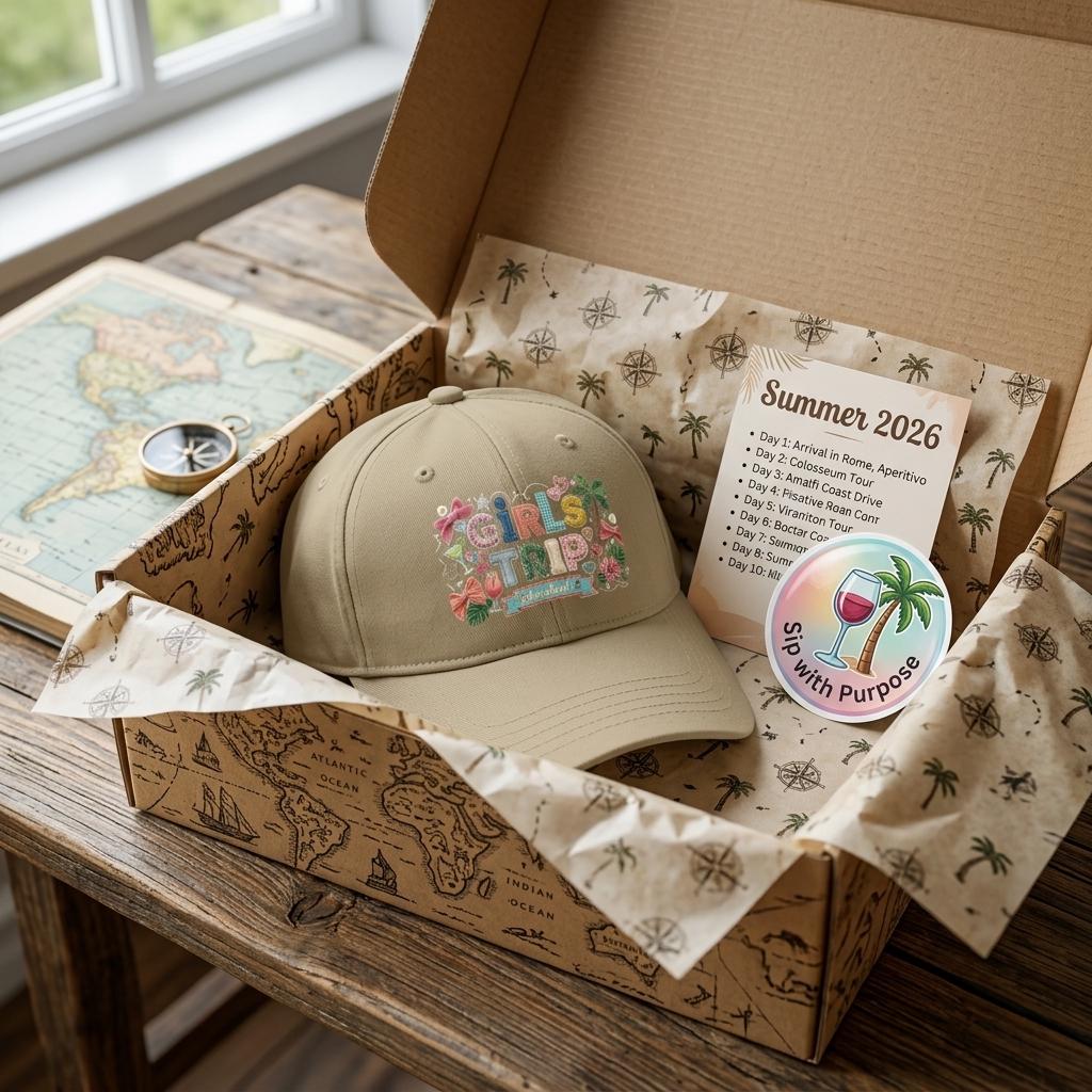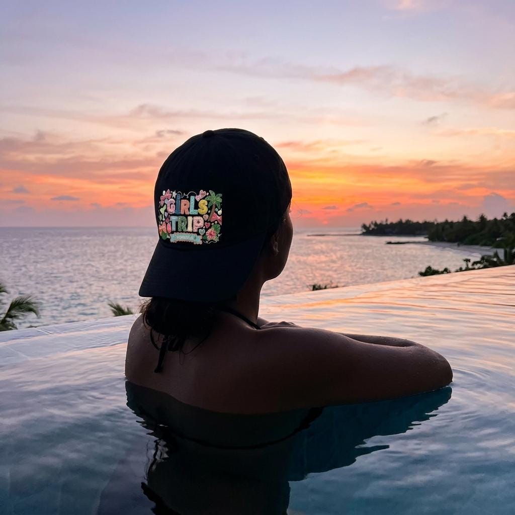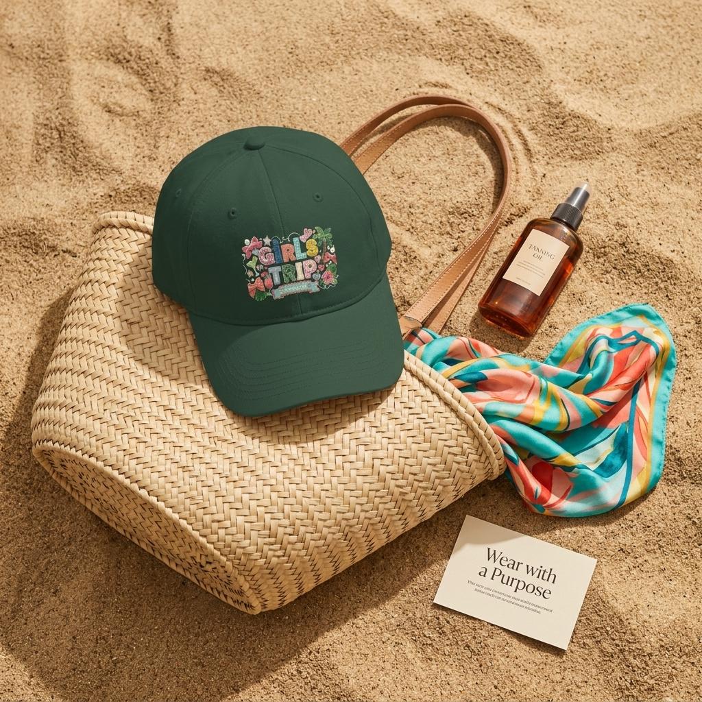 Top off your vacation outfit with our "Girls Trip Booked" low-profile baseball cap. Designed for style and comfort, this hat features our signature 3D-effect patchwork collage. From the hibiscus flowers to the "booked" anchor banner, every detail is crafted to look like an authentic, hand-stitched travel patch.
