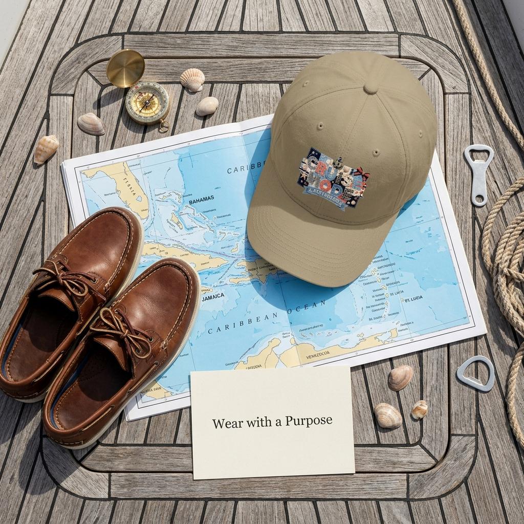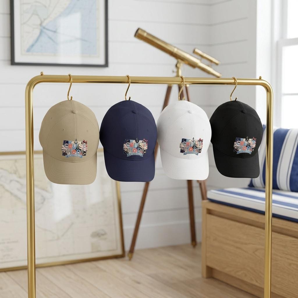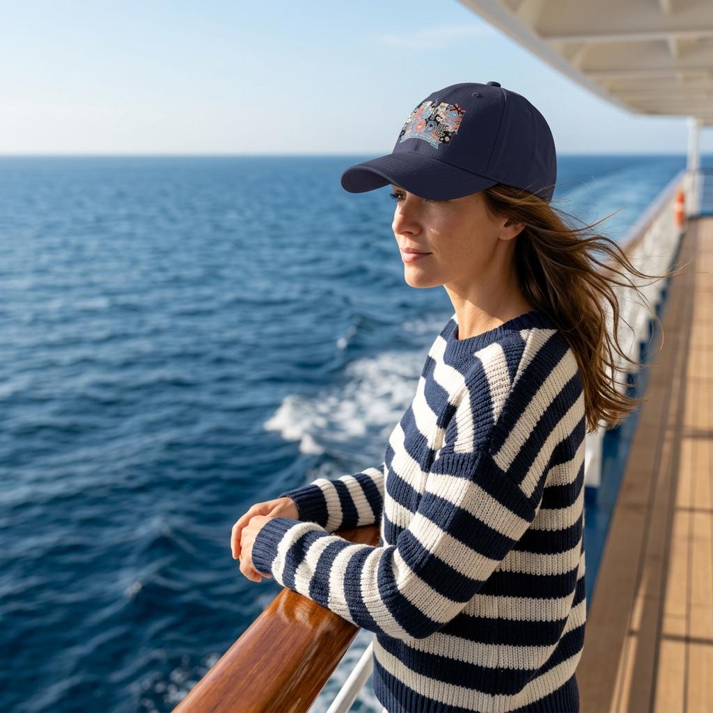Complete your sea-day look with the "Cruise Mode Activated" low-profile cap. This hat is designed for the stylish traveler, featuring a complex 3D-effect patchwork collage. With nautical stripes, denim textures, and miniature seaside icons, it gives you that hand-crafted boutique feel in a comfortable, adjustable dad hat silhouette.