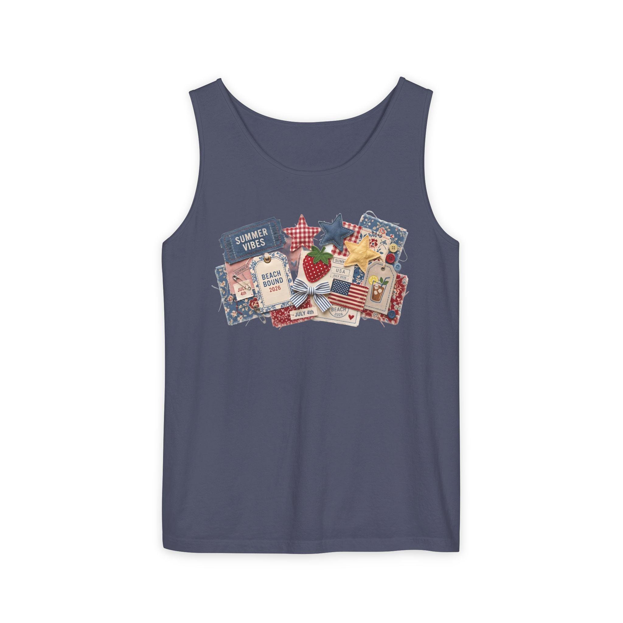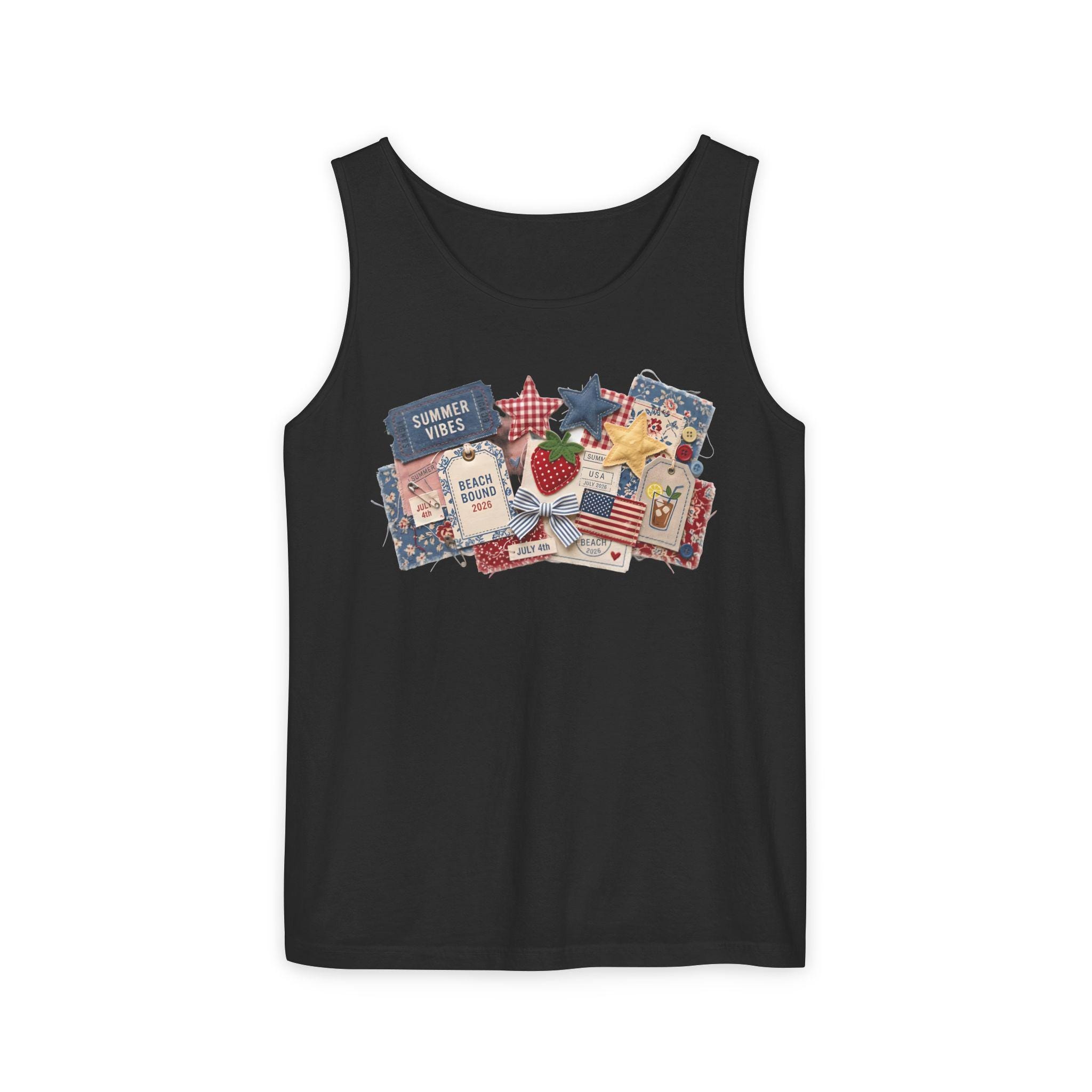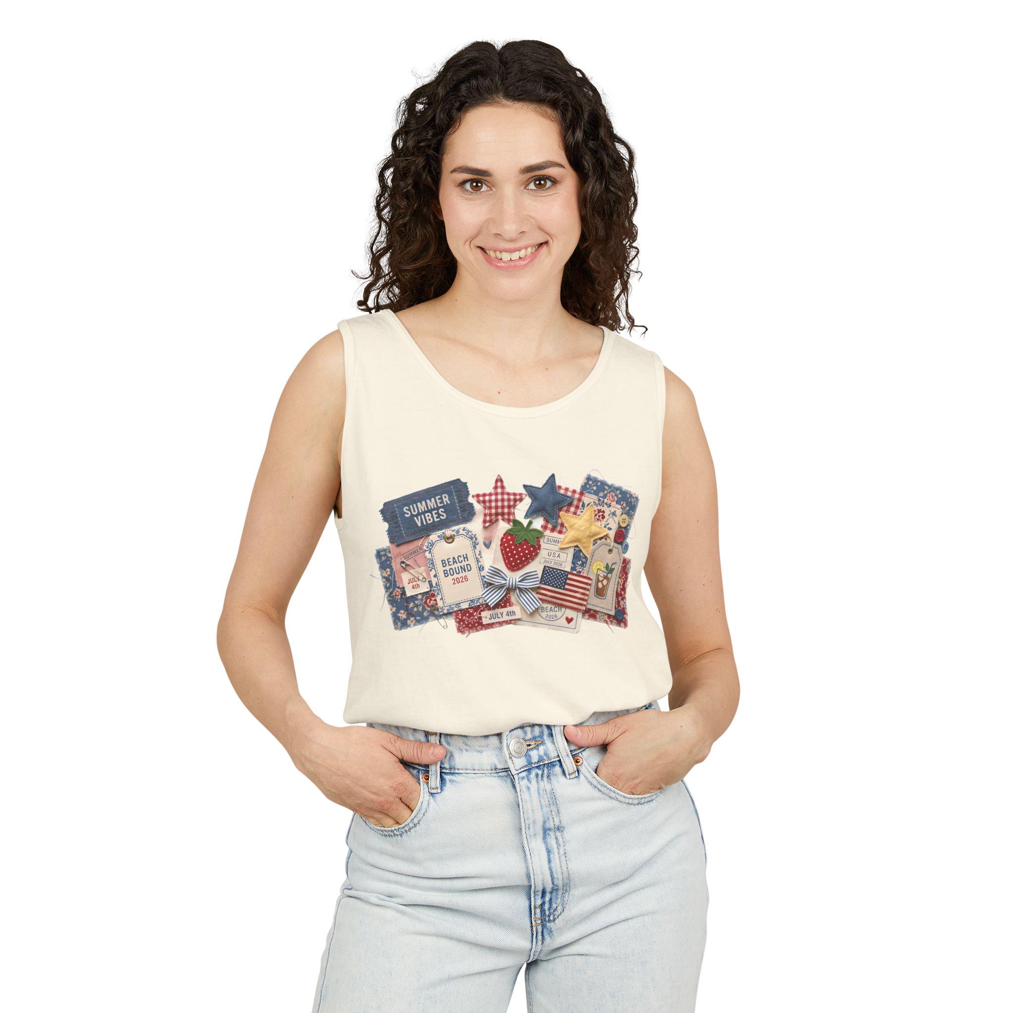 Take the ultimate summer scrapbook to the beach with our "Americana Collage" Comfort Colors tank. This 9360 tank offers a relaxed, breezy fit featuring 3D-effect textures: denim "Summer Vibes" tickets, quilted stars, and "Beach Bound 2026" luggage tags. It’s the perfect blend of nostalgic Americana and modern resort wear.
