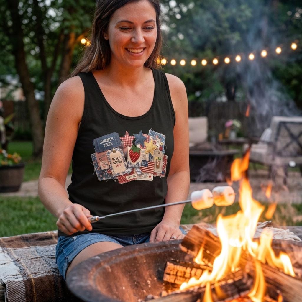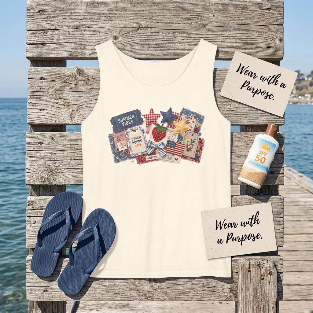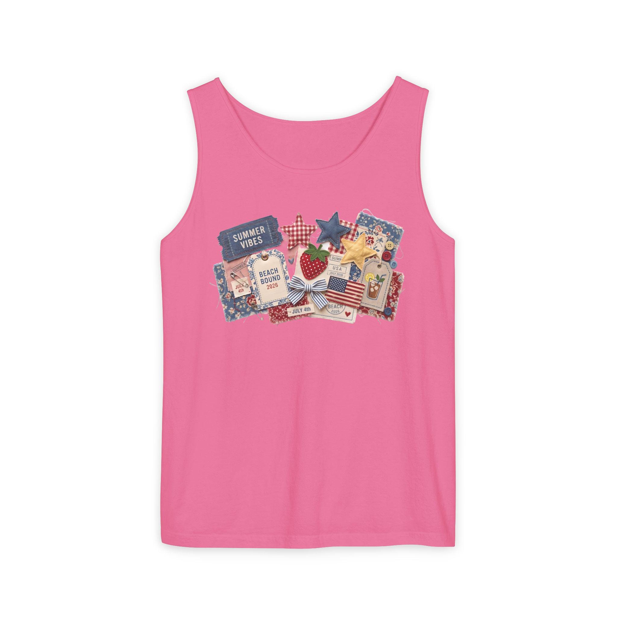 Take the ultimate summer scrapbook to the beach with our "Americana Collage" Comfort Colors tank. This 9360 tank offers a relaxed, breezy fit featuring 3D-effect textures: denim "Summer Vibes" tickets, quilted stars, and "Beach Bound 2026" luggage tags. It’s the perfect blend of nostalgic Americana and modern resort wear.