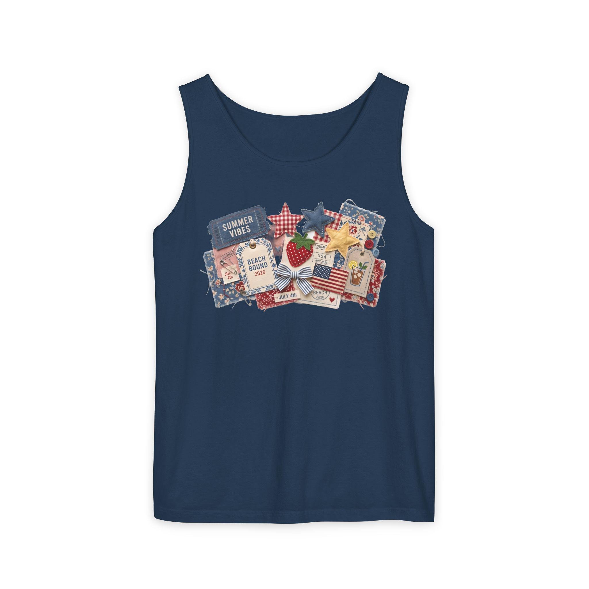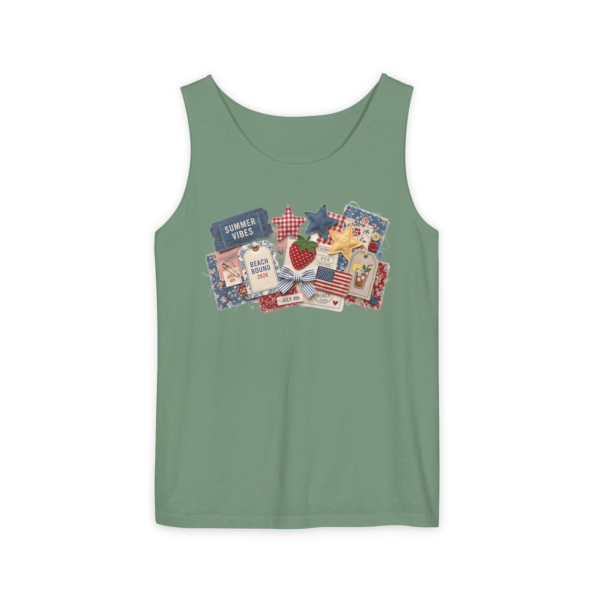 Summer Vibes Americana Tank Top, Comfort Colors 9360 Patriotic Tank, 4th of July Collage Sleeveless Shirt, Retro Star Fabric Faux Patchwork