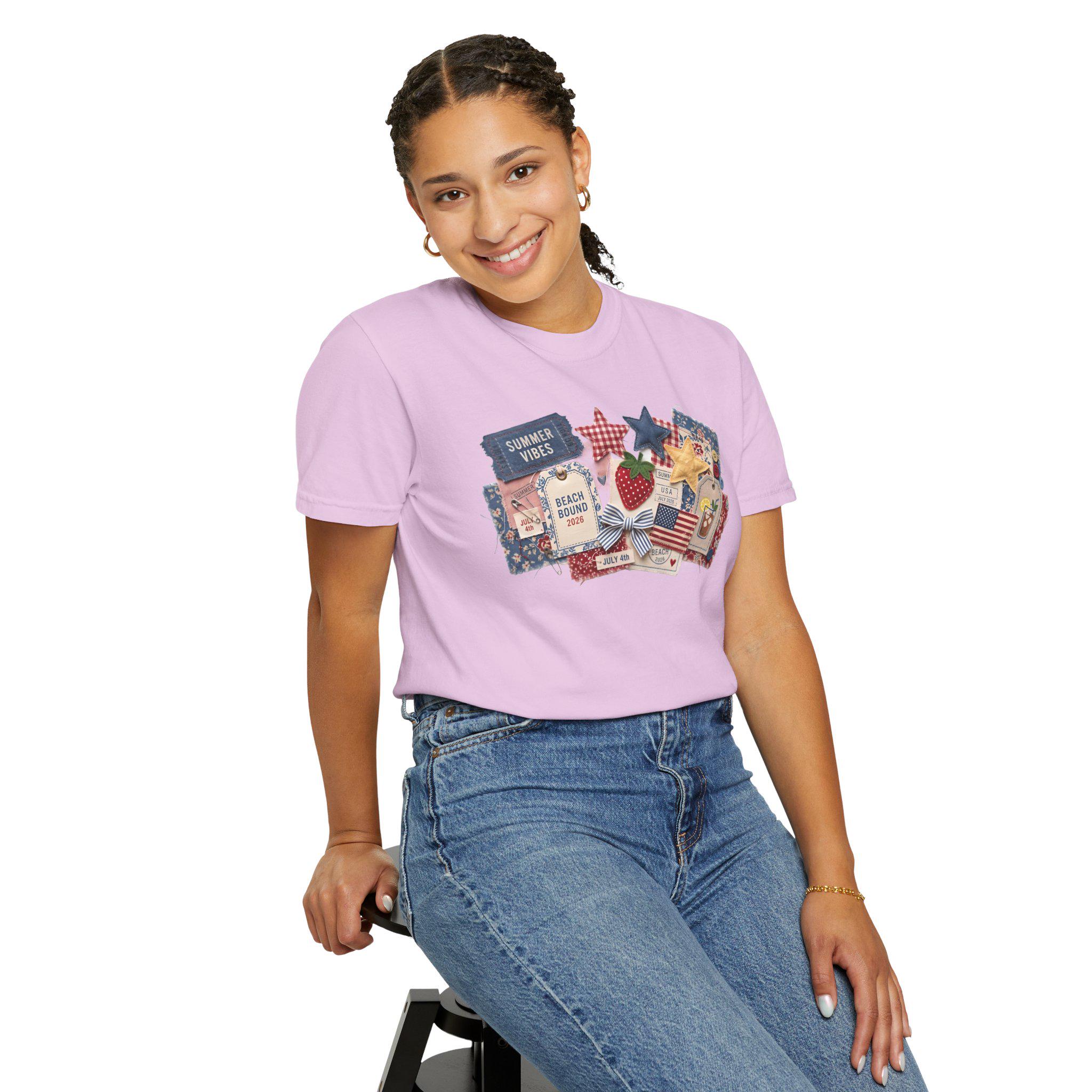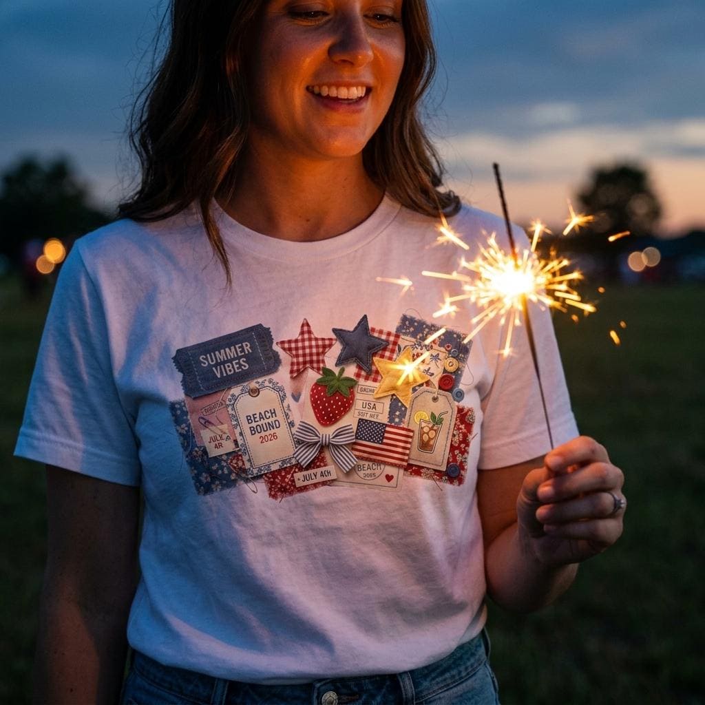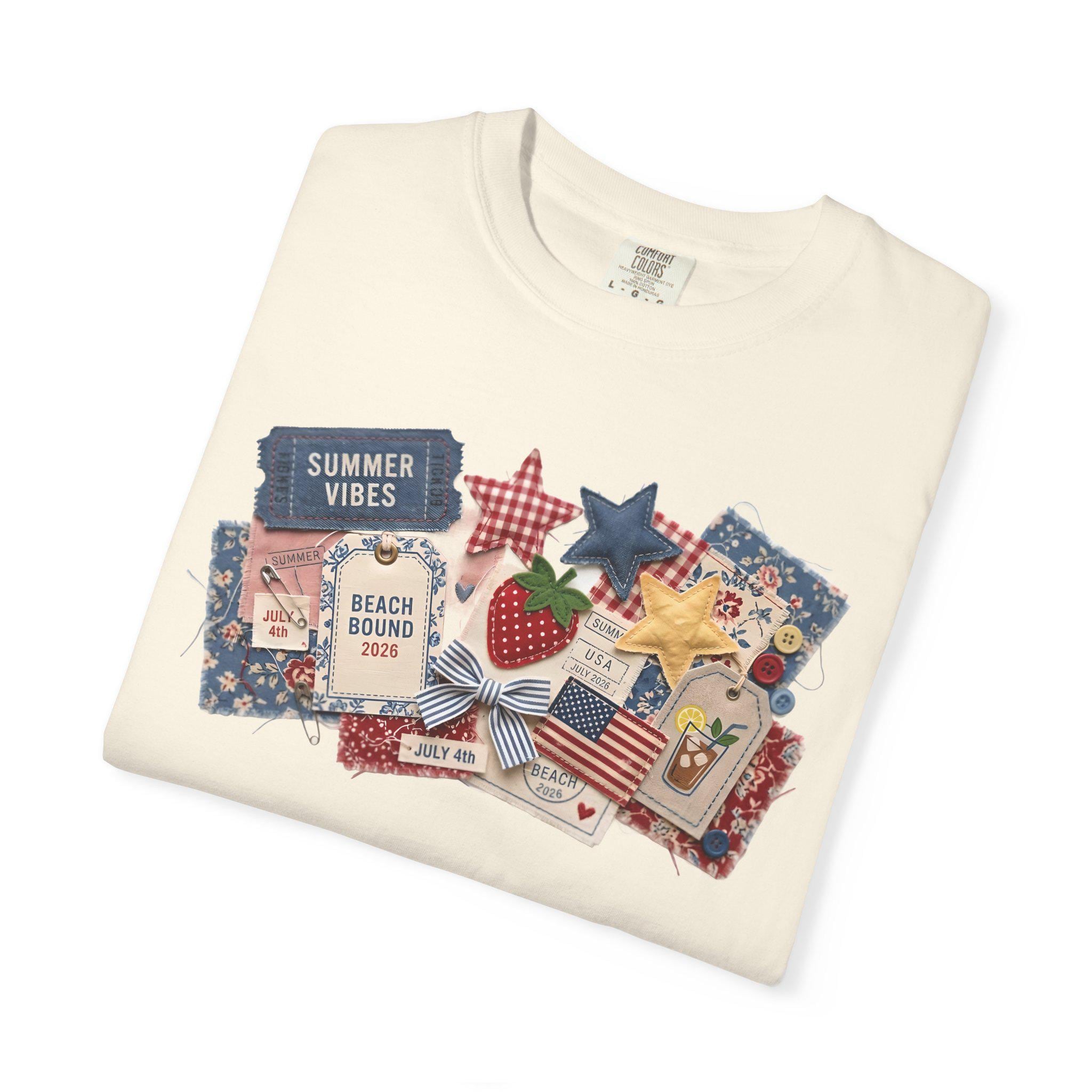 Capture every summer memory with our "Americana Collage" tee. This design is a visual feast of 3D-effect textures: denim "Summer Vibes" tickets, quilted stars, vintage-style strawberry patches, and "Beach Bound 2026" luggage tags. Each element is designed to look like it was hand-pinned and stitched, giving you a custom, collector-level boutique aesthetic.