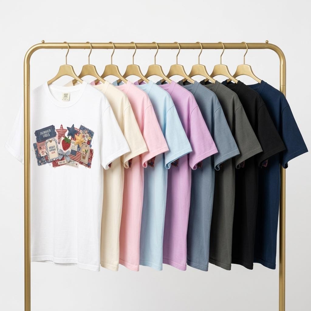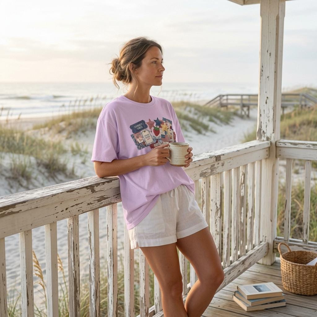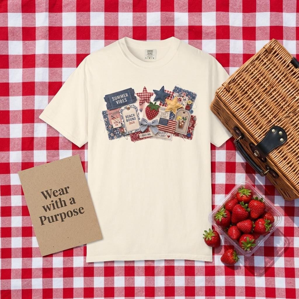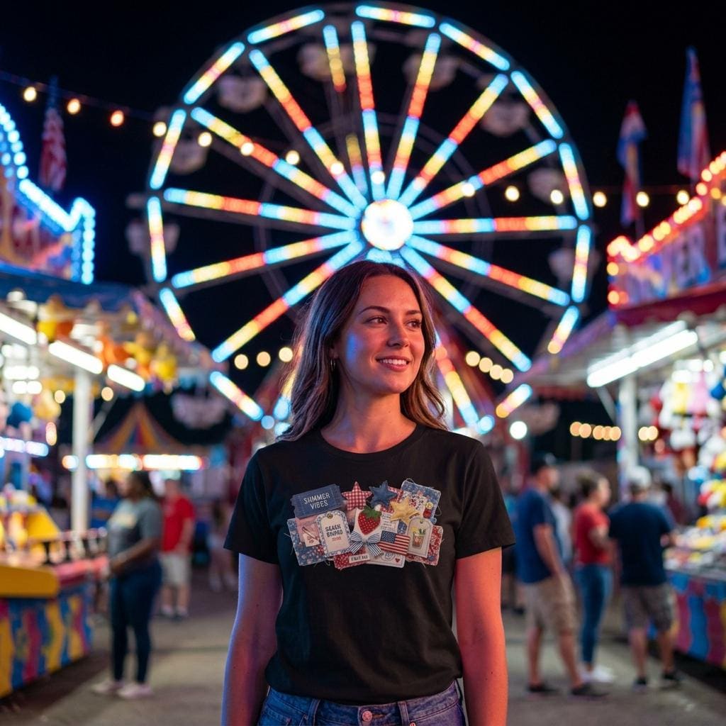 Capture every summer memory with our "Americana Collage" tee. This design is a visual feast of 3D-effect textures: denim "Summer Vibes" tickets, quilted stars, vintage-style strawberry patches, and "Beach Bound 2026" luggage tags. Each element is designed to look like it was hand-pinned and stitched, giving you a custom, collector-level boutique aesthetic.